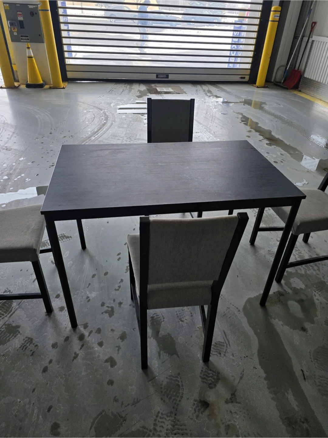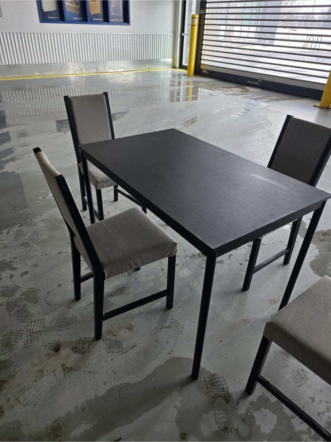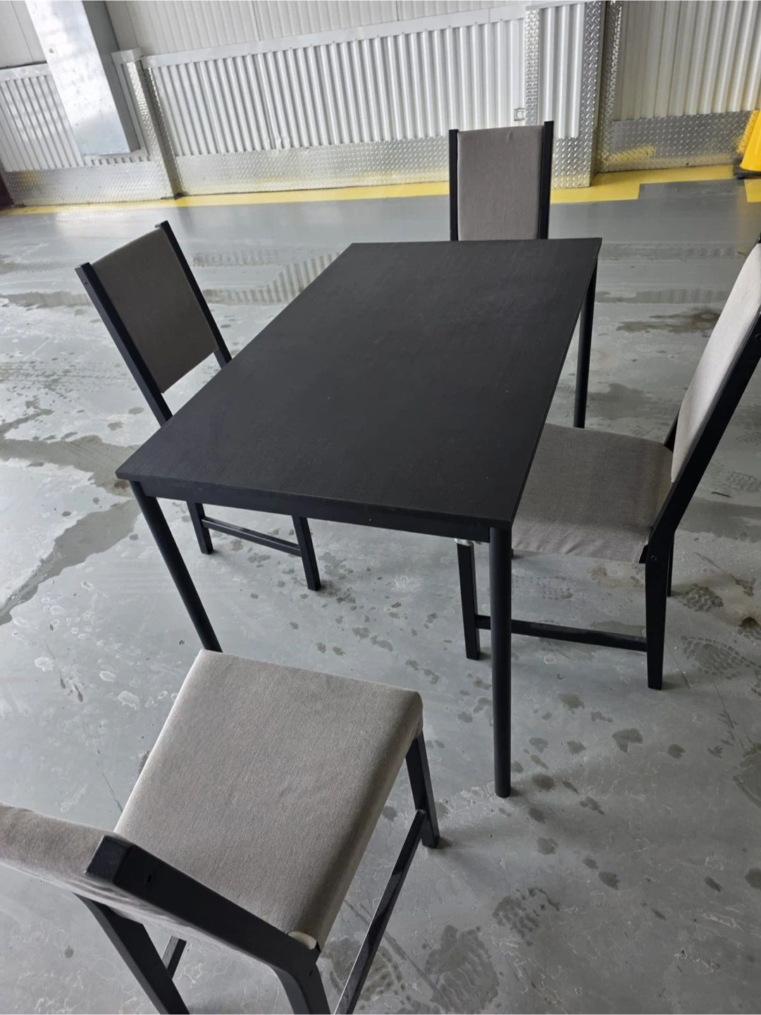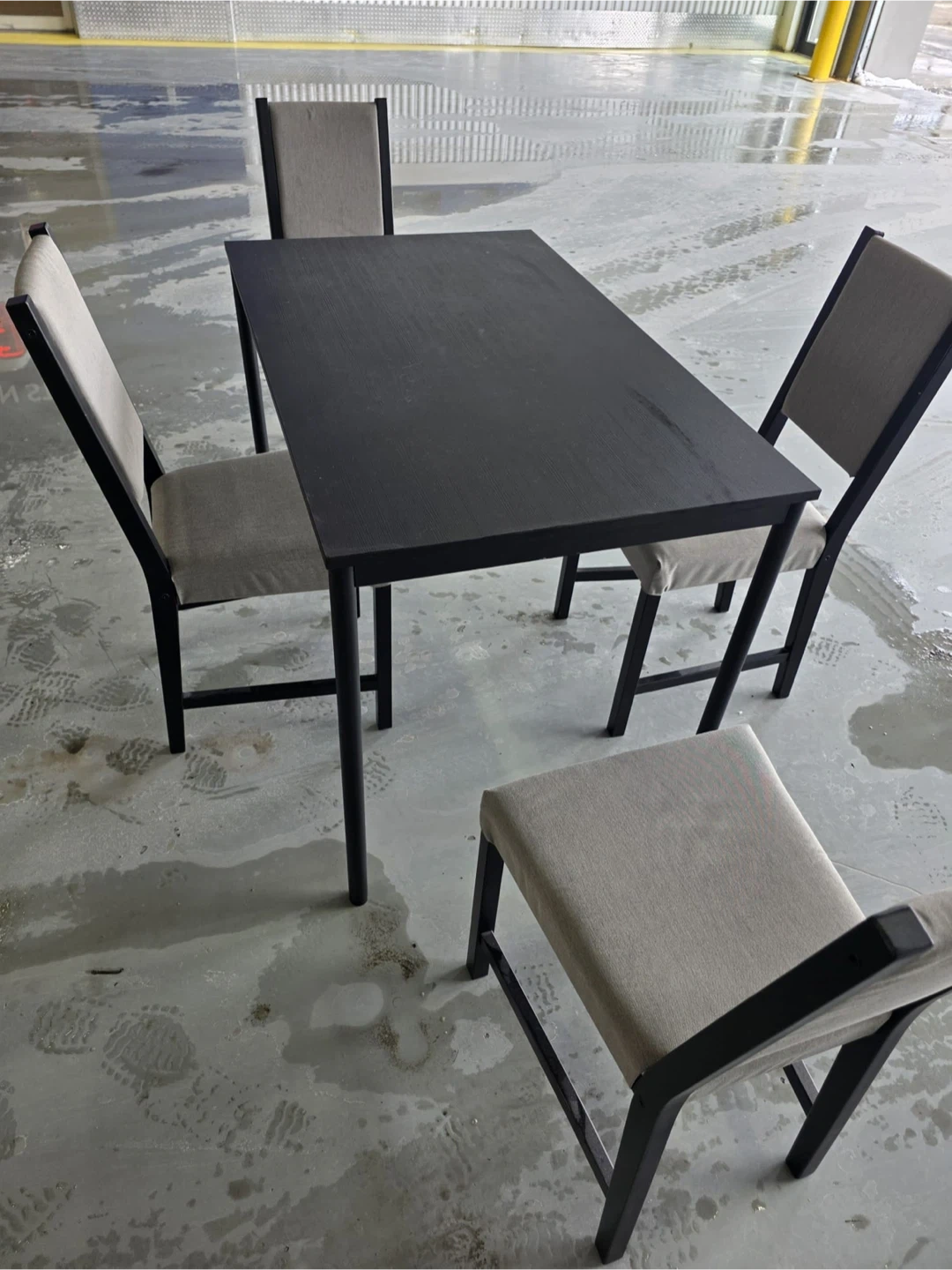 A black dining table with four upholstered chairs. The table has a matte black finish and metal legs. Chairs are upholstered in a neutral fabric with black frames.good condition home delivery available