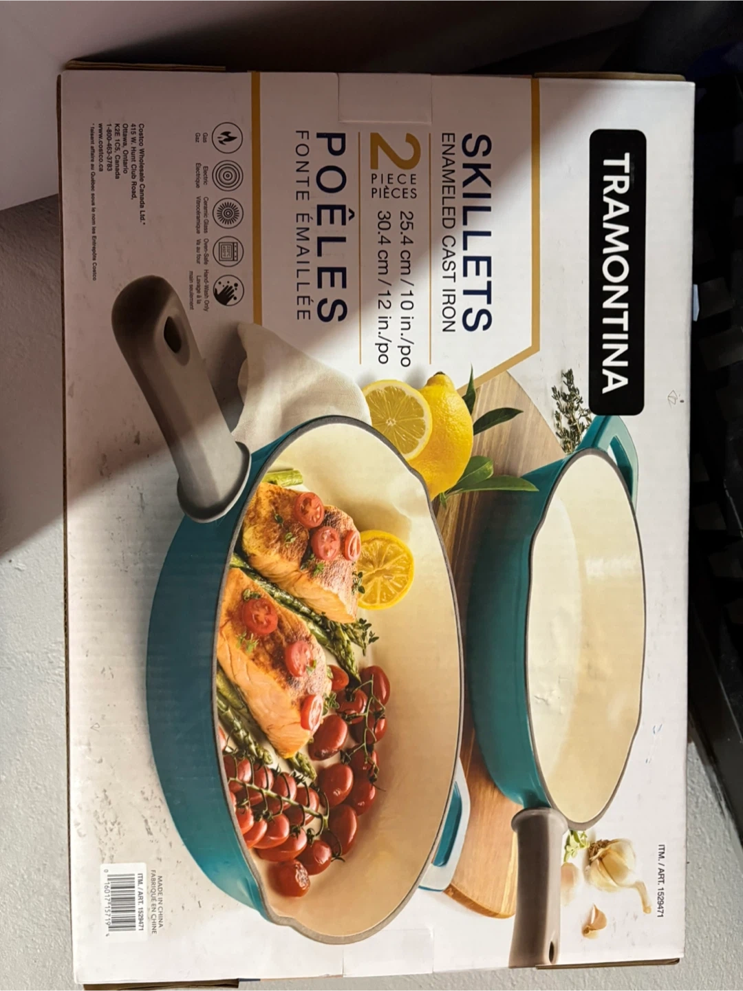 This set includes two enameled cast iron skillets, one 25.4 cm/10 in. and one 30.4 cm/12 in. They're suitable for use on all cooktops and are dishwasher safe. Enameled cast iron construction ensures even heating and durability.