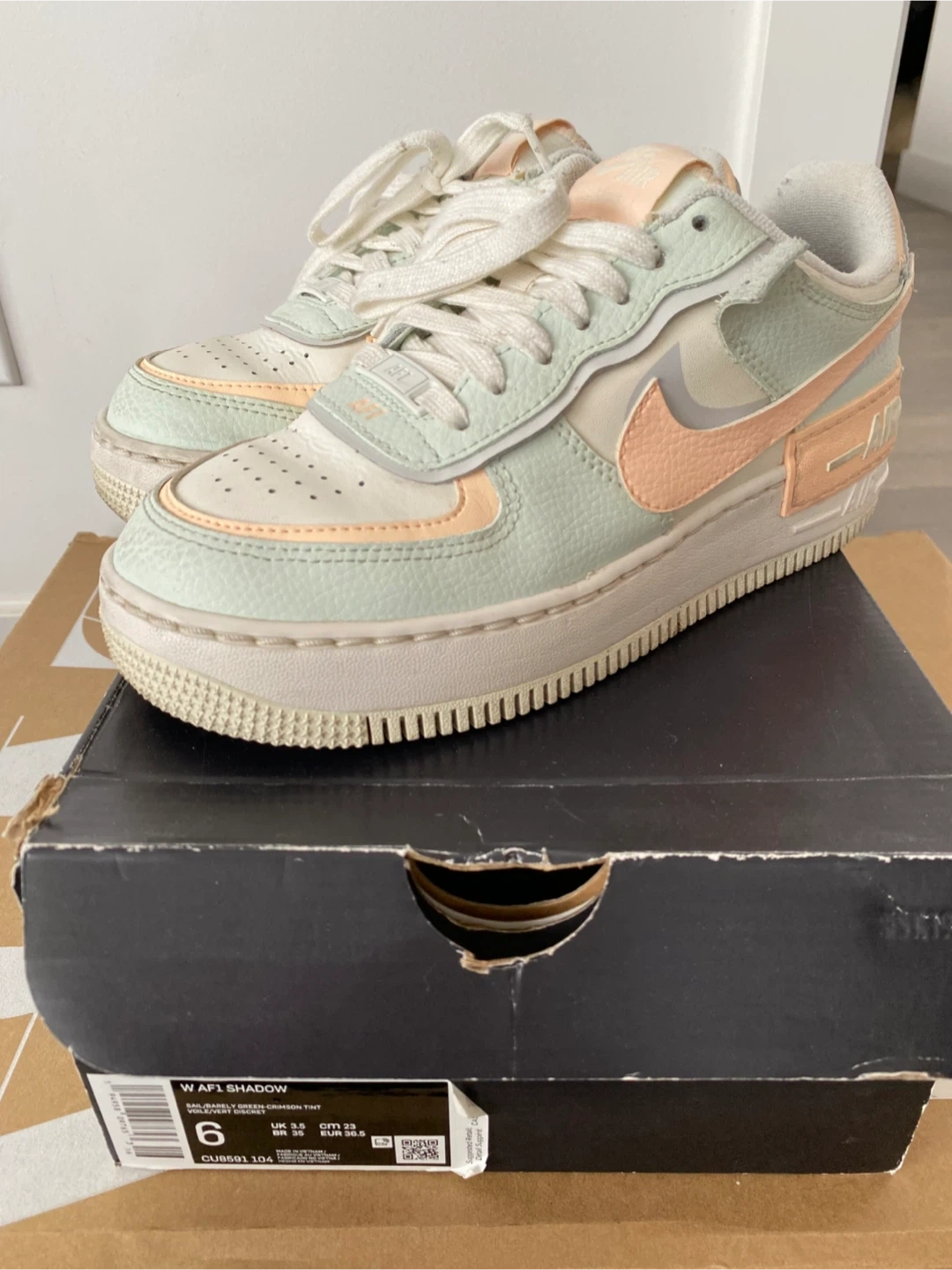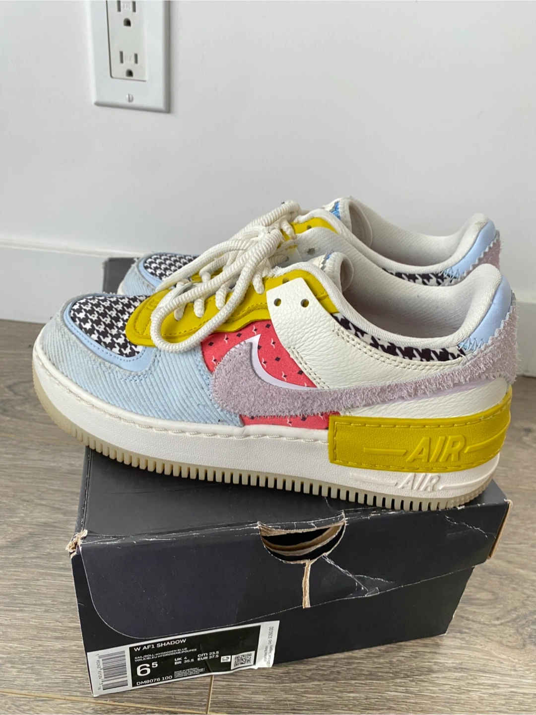 These Nike Air Force 1 Shadow sneakers feature a unique mix of light blue, pink, yellow, and white panels. They're a women's size 6.5, designed for everyday wear.