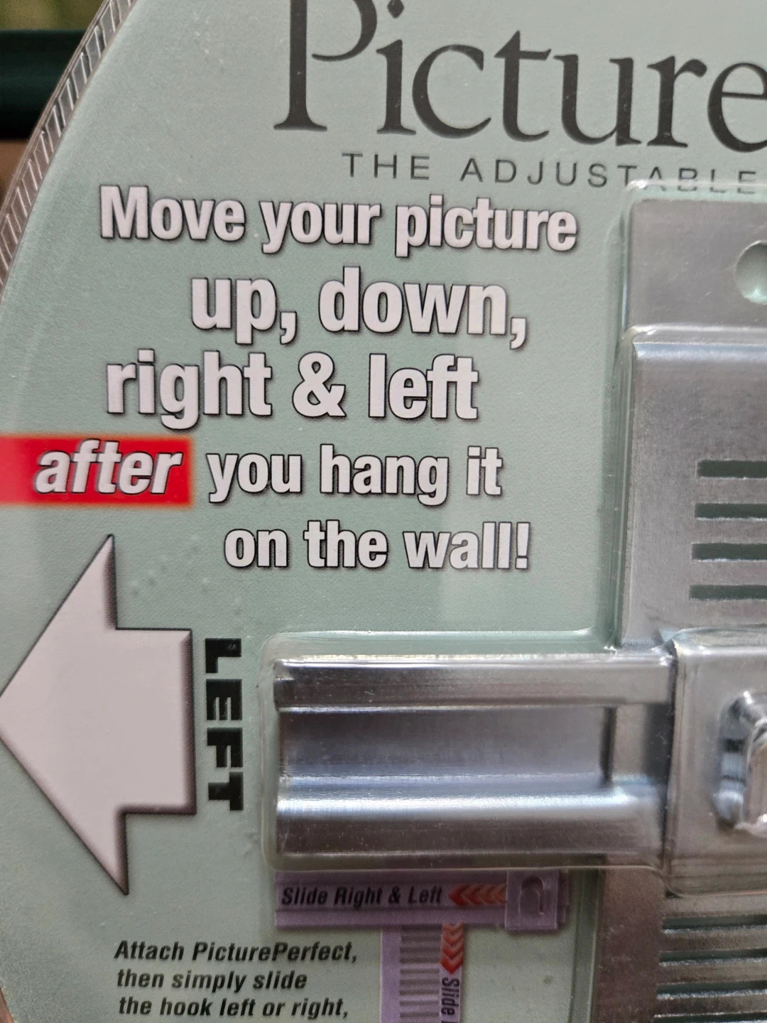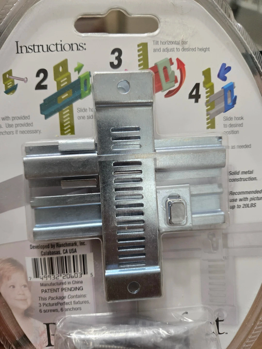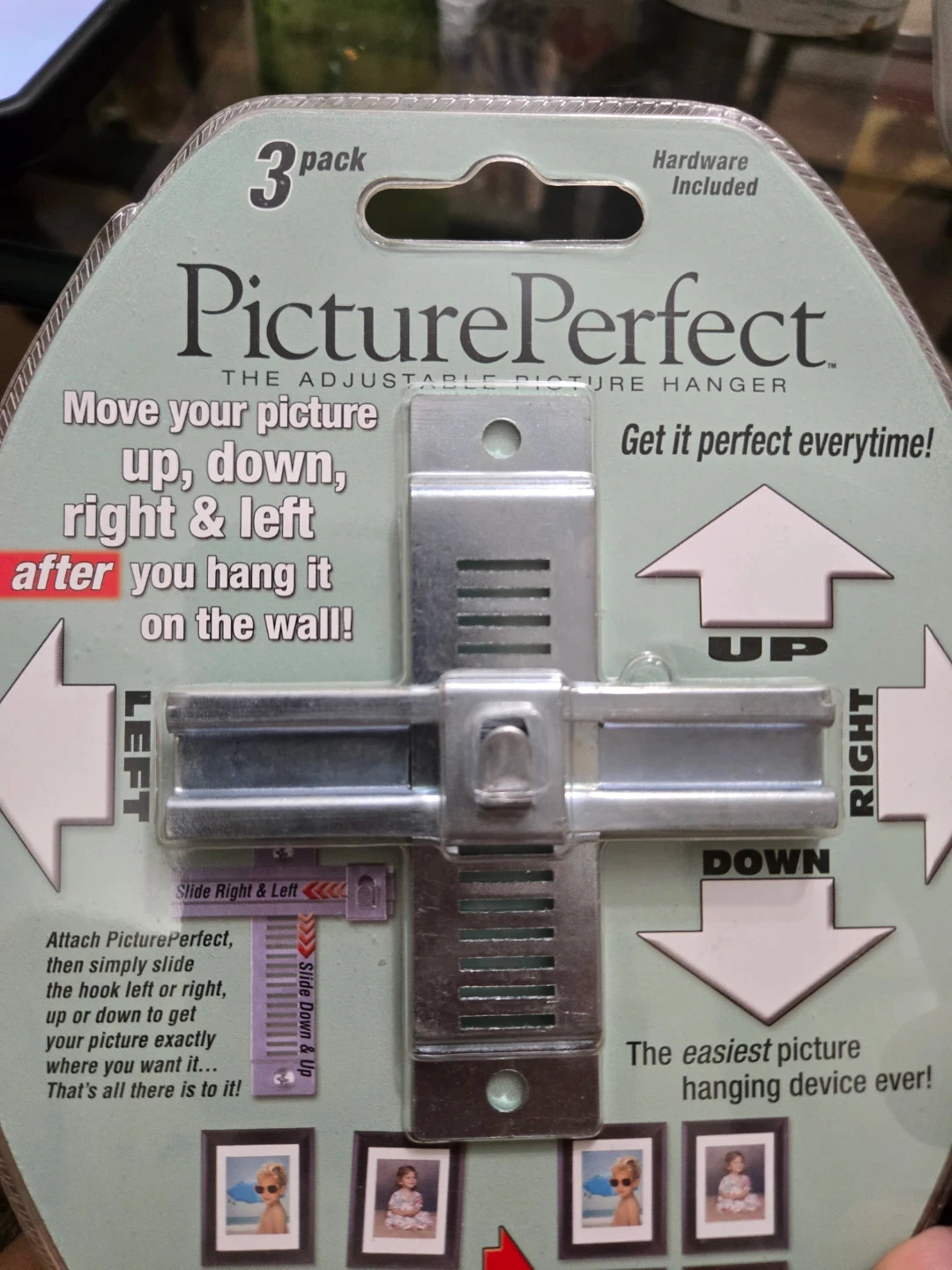 This is a 3-pack of adjustable picture hangers made with solid metal construction. It's recommended for use with pictures up to 20 lbs. This device allows you to move your picture up, down, right, and left after hanging it on the wall.
