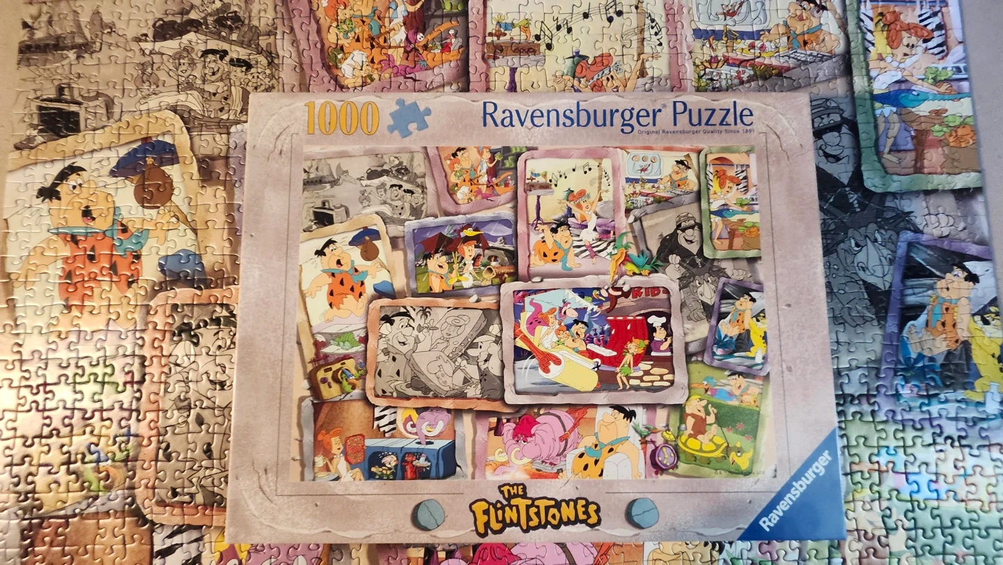 Ravensburger puzzle featuring the iconic characters from The Flintstones. This 1000-piece jigsaw puzzle is great for fans of the classic cartoon. Assembled puzzle dimensions are not provided, but it's a standard 1000-piece count.