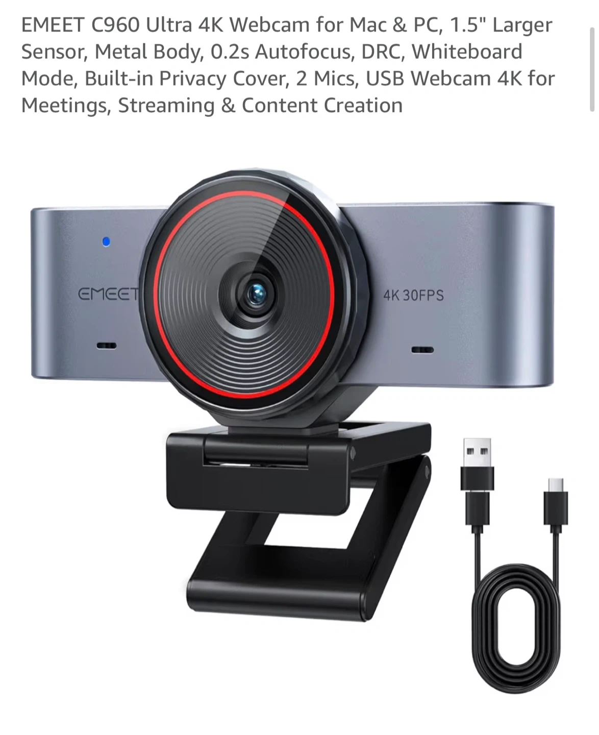 This EMEET C960 Ultra webcam is designed for Mac and PC. It boasts a 1.5" larger sensor, metal body, and 0.2s autofocus. The webcam has a built-in privacy cover, 2 mics, and supports 4K resolution at 30FPS for meetings and content creation.