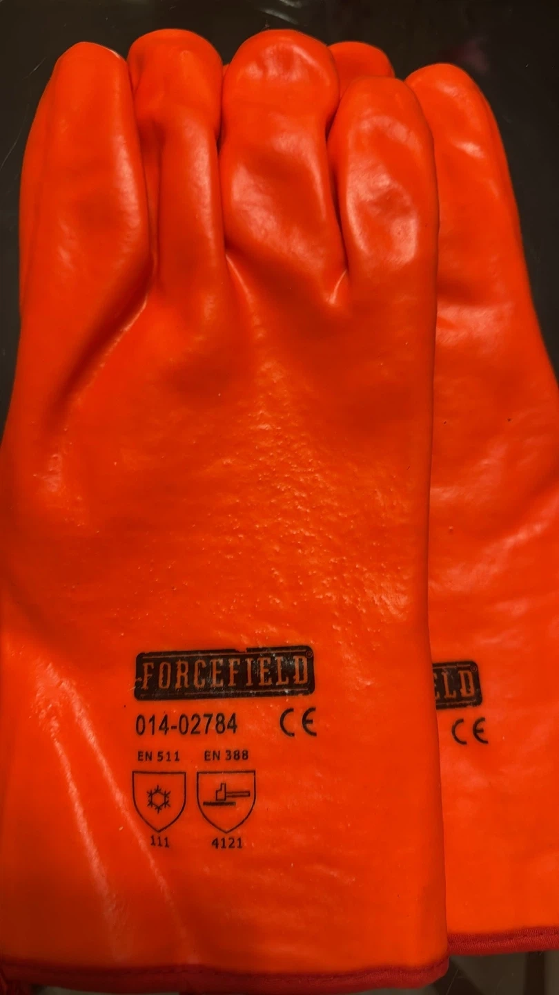 Forcefield orange work gloves. These gloves meet EN 511 and EN 388 safety standards. They're designed for cold conditions and offer good grip.Each $10