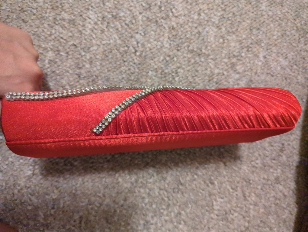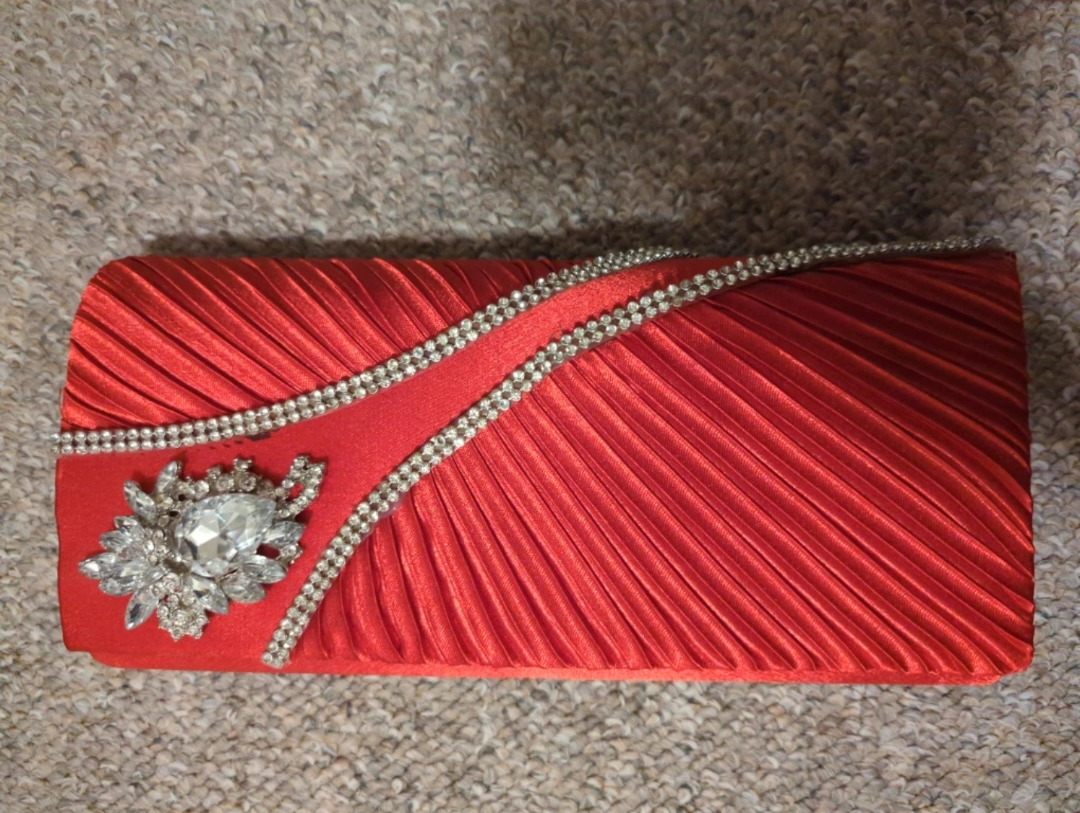 A red clutch purse adorned with rhinestones. It features a chain strap. Not used at all $12