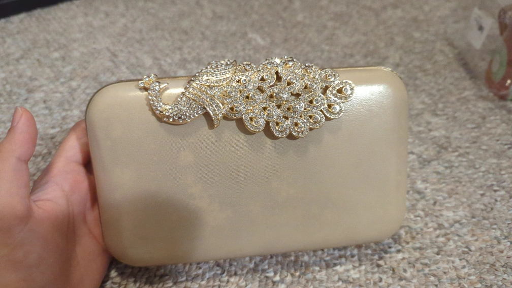 Golden clutches have a stone Peacock design. Used it once or twice. Few hand marks on it $15