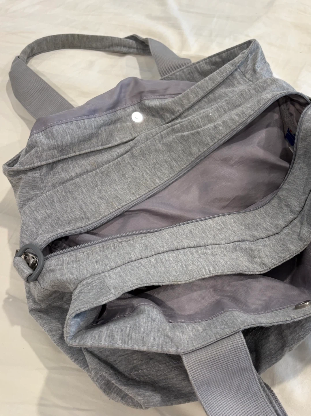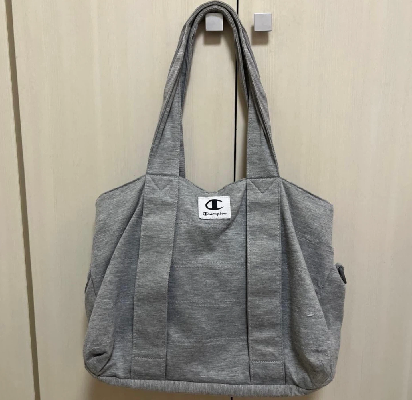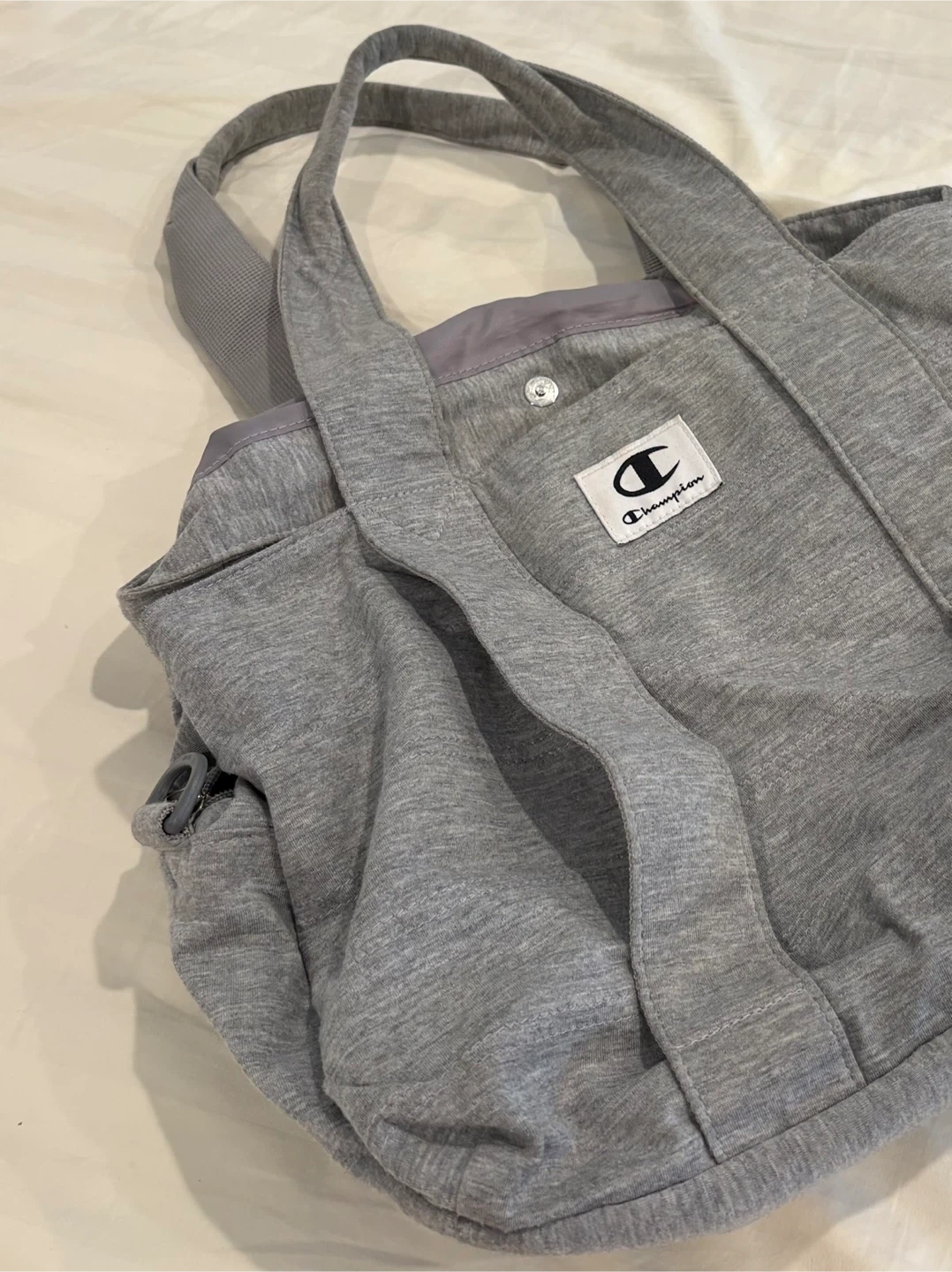 This is a grey tote bag from Champion. It's made of a soft, heathered fabric and has a zippered closure. There are exterior pockets for quick access to essentials. This bag is great for carrying gym clothes or everyday items!