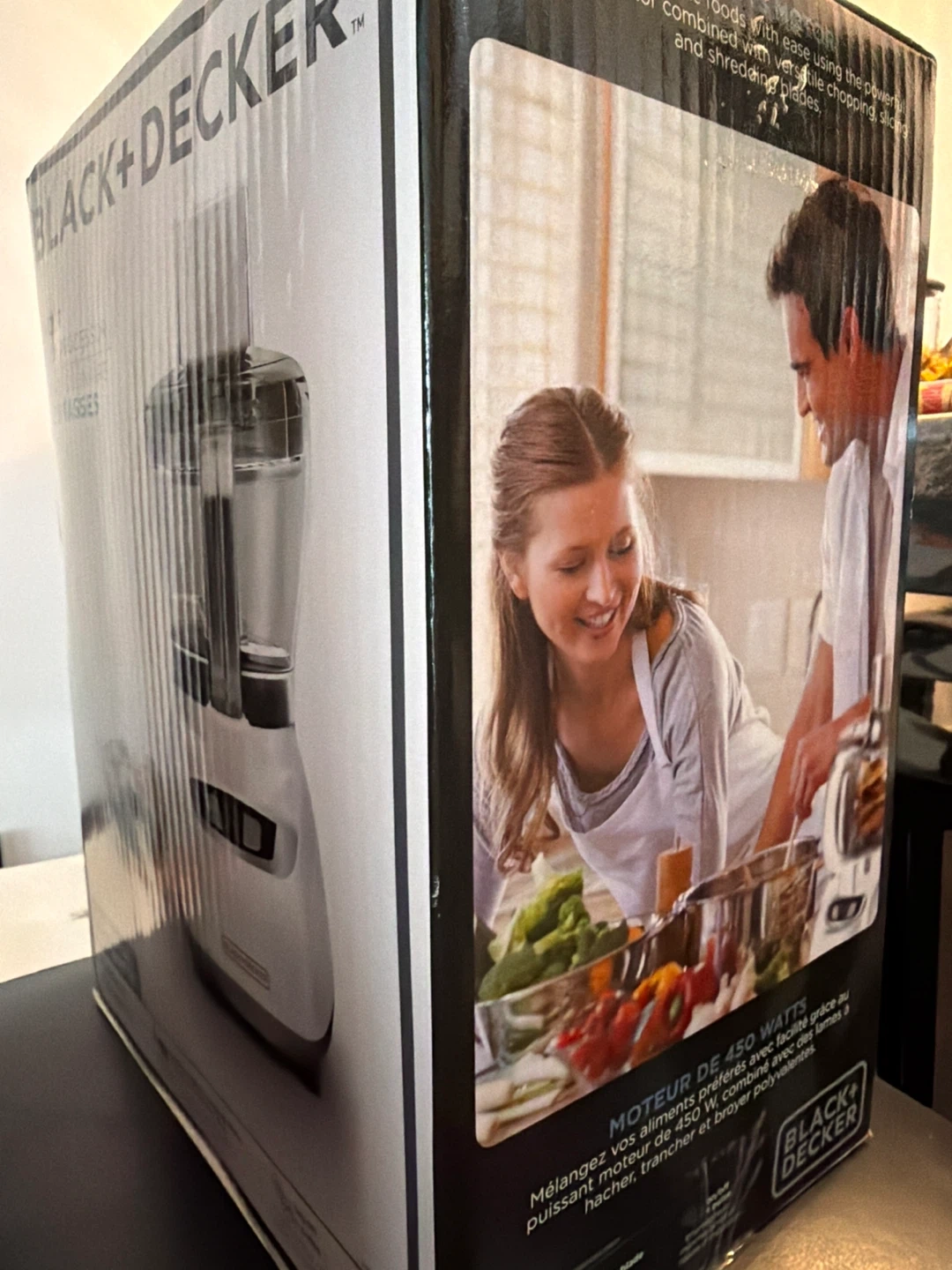This BLACK+DECKER 8-cup food processor has a powerful 450-watt motor. It includes stainless steel slicing and shredding discs, and a stainless steel chopping blade. The parts are dishwasher-safe for easy cleanup.