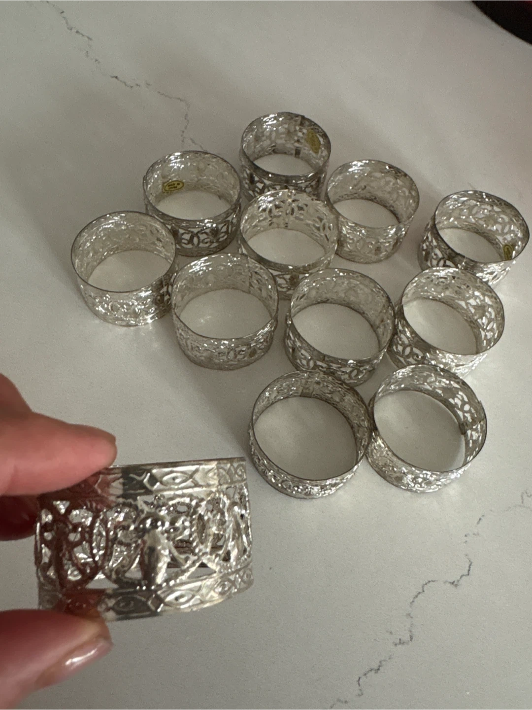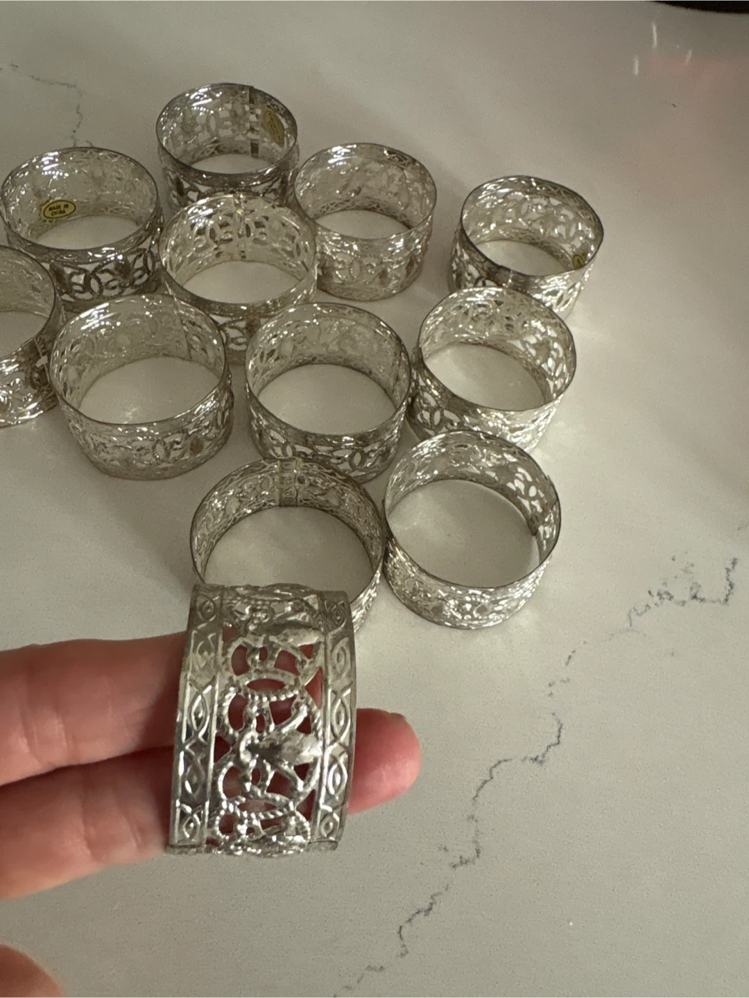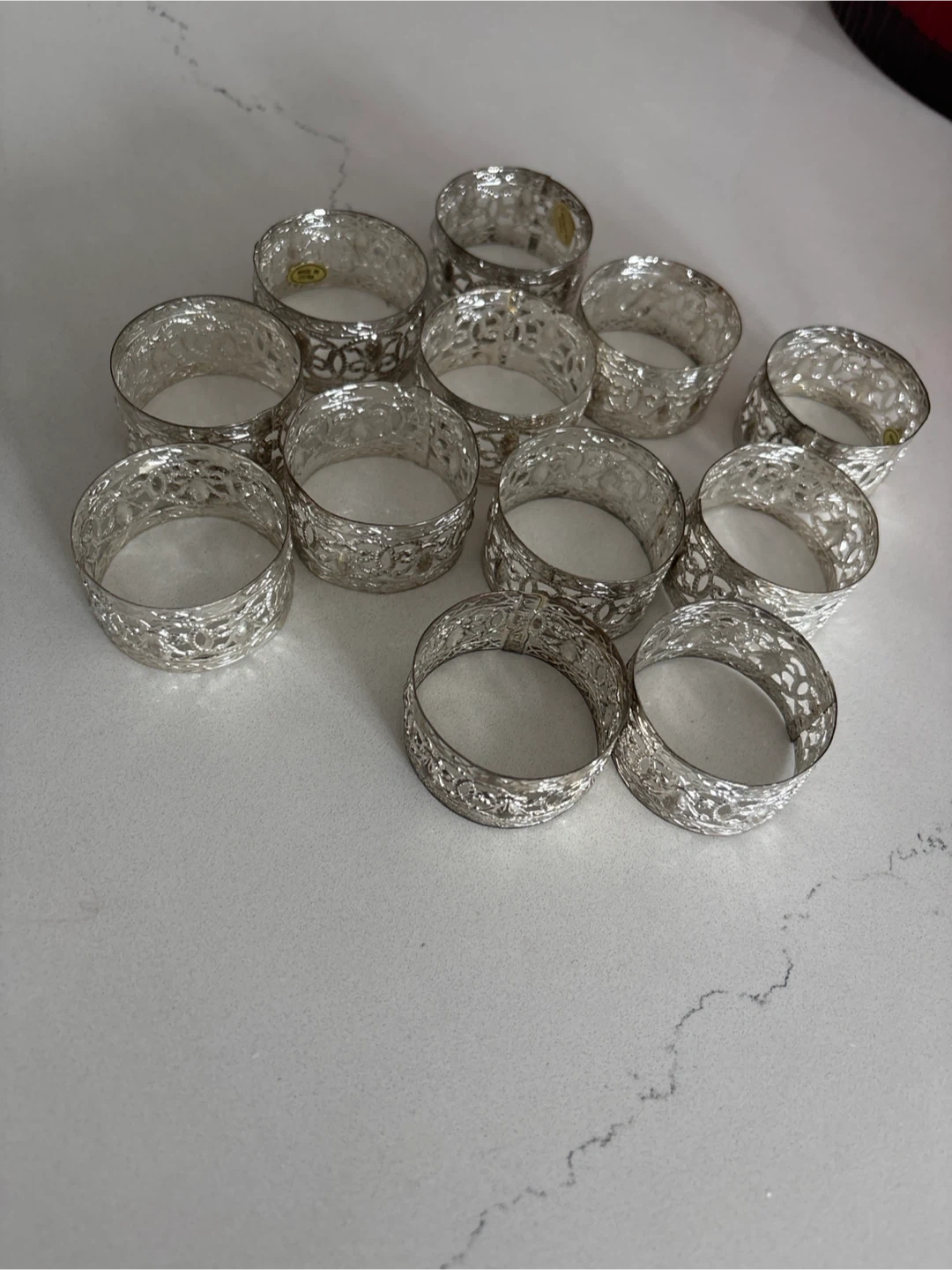 You'll get a set of 12 decorative napkin rings. They're made from a silver-toned metal with an ornate filigree design. These would be lovely for your next dinner party or holiday gathering!
