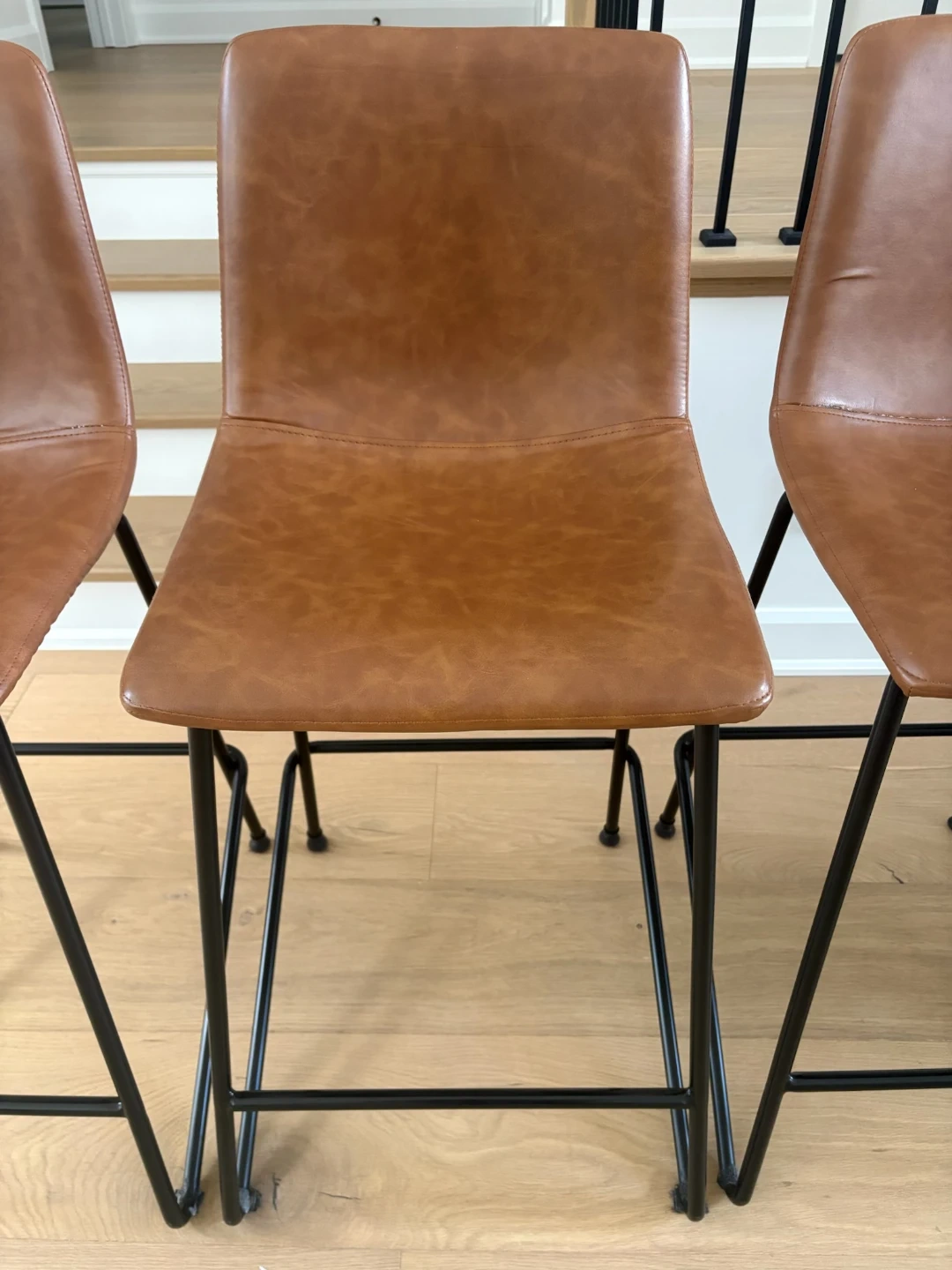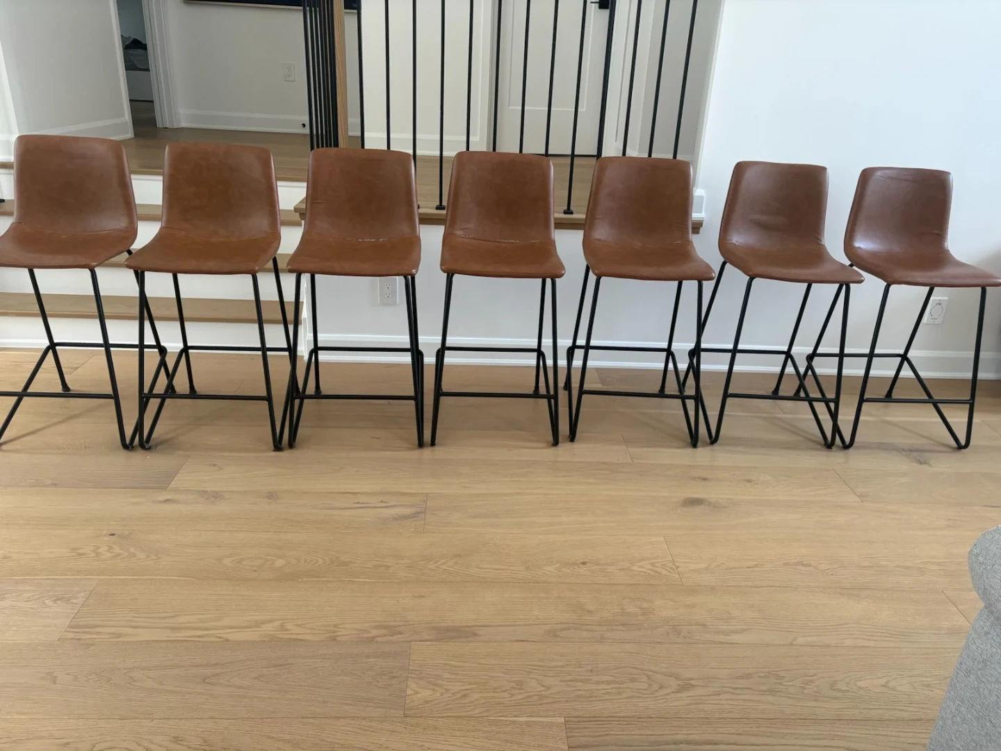 Seven brown faux leather bar stools with black metal legs. These stools have a comfortable seat and back. Perfect for a kitchen island or home bar setup!