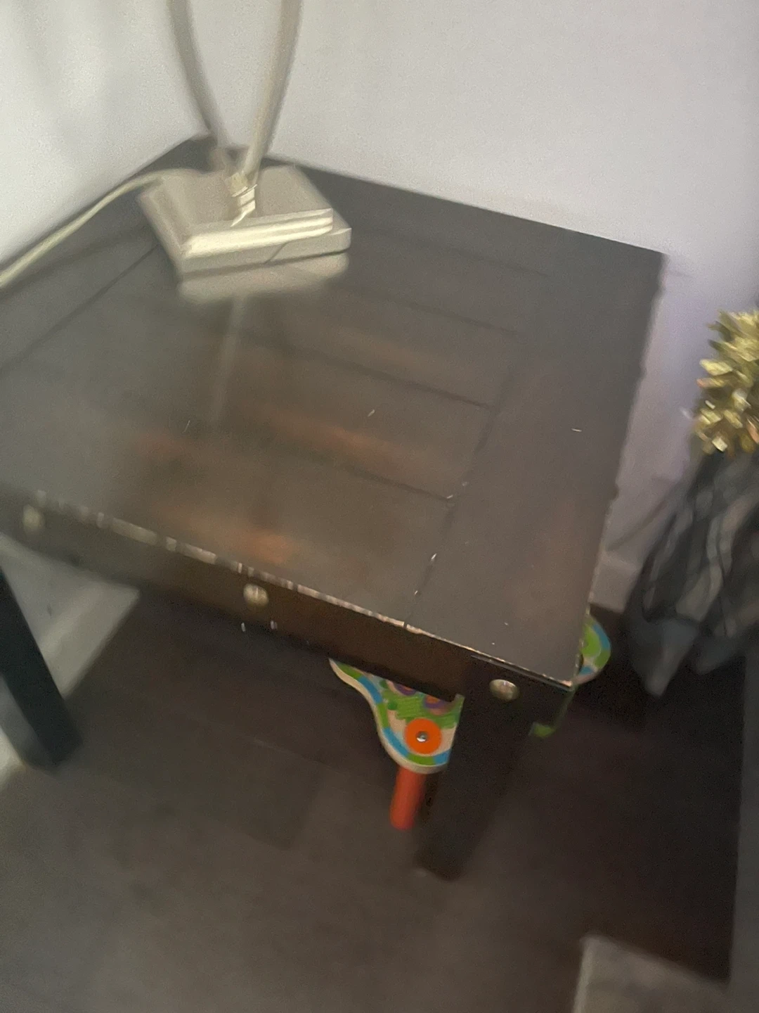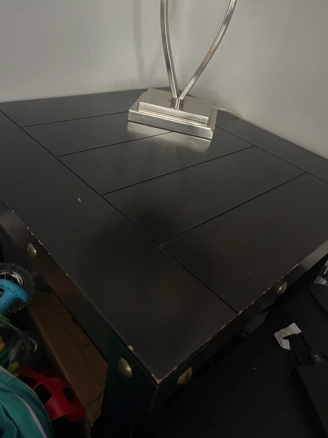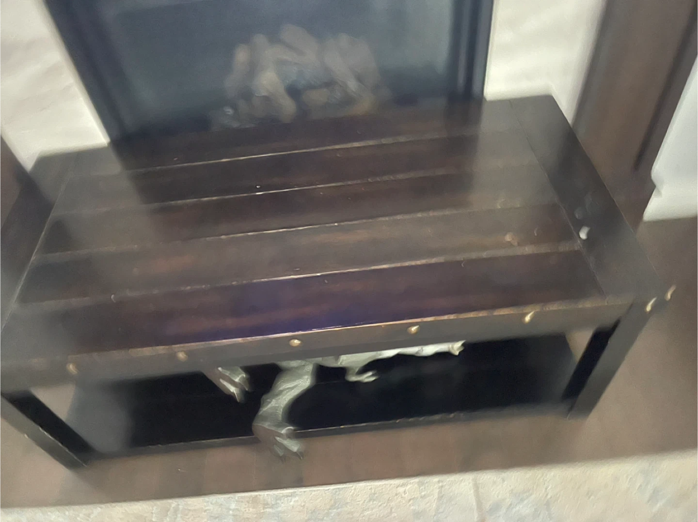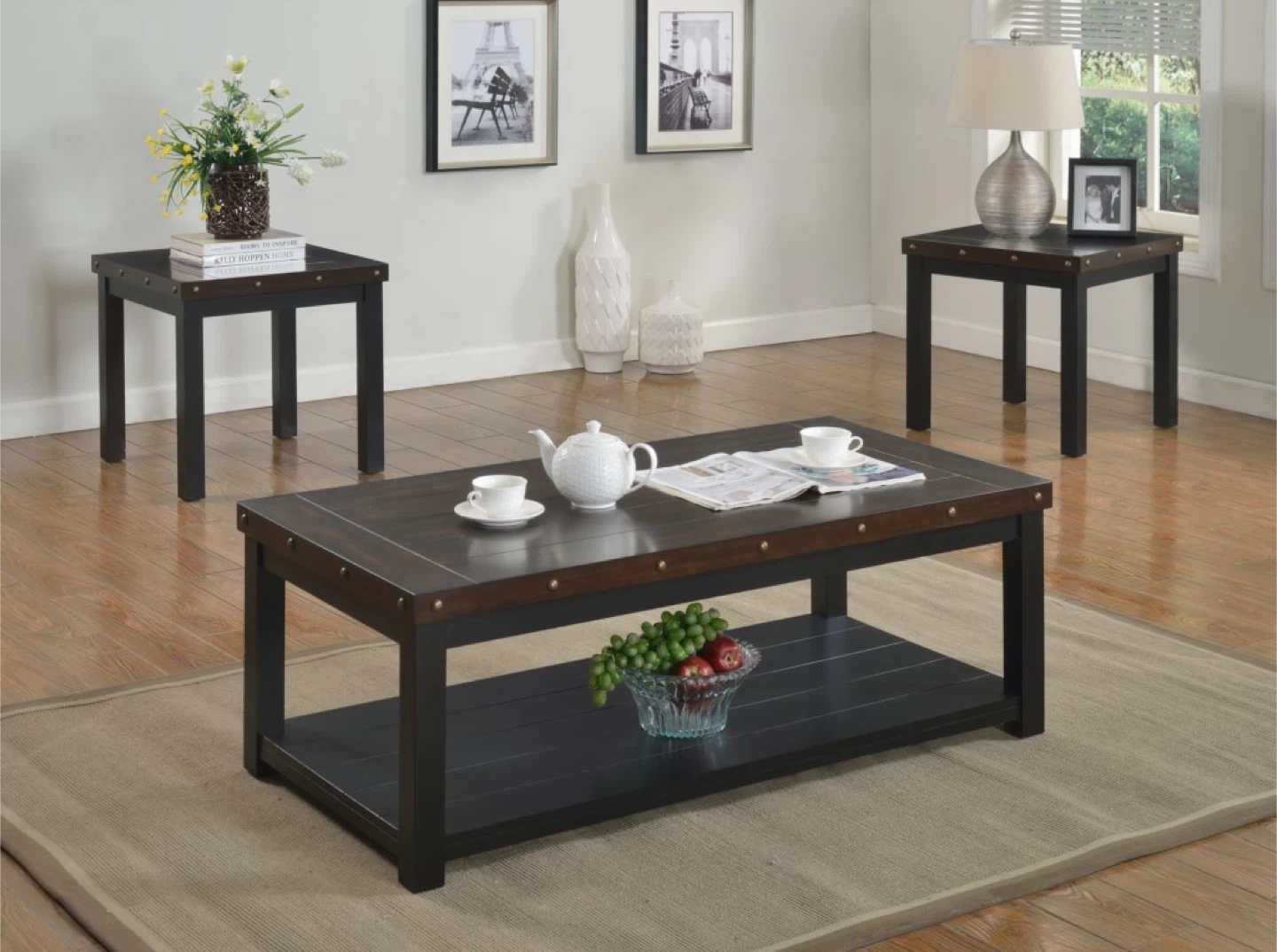 This dark wood coffee table with two end table set that has a lower shelf for extra storage. It's constructed with a sturdy wooden frame and decorative metal studs. This table would be useful in a living room or den.