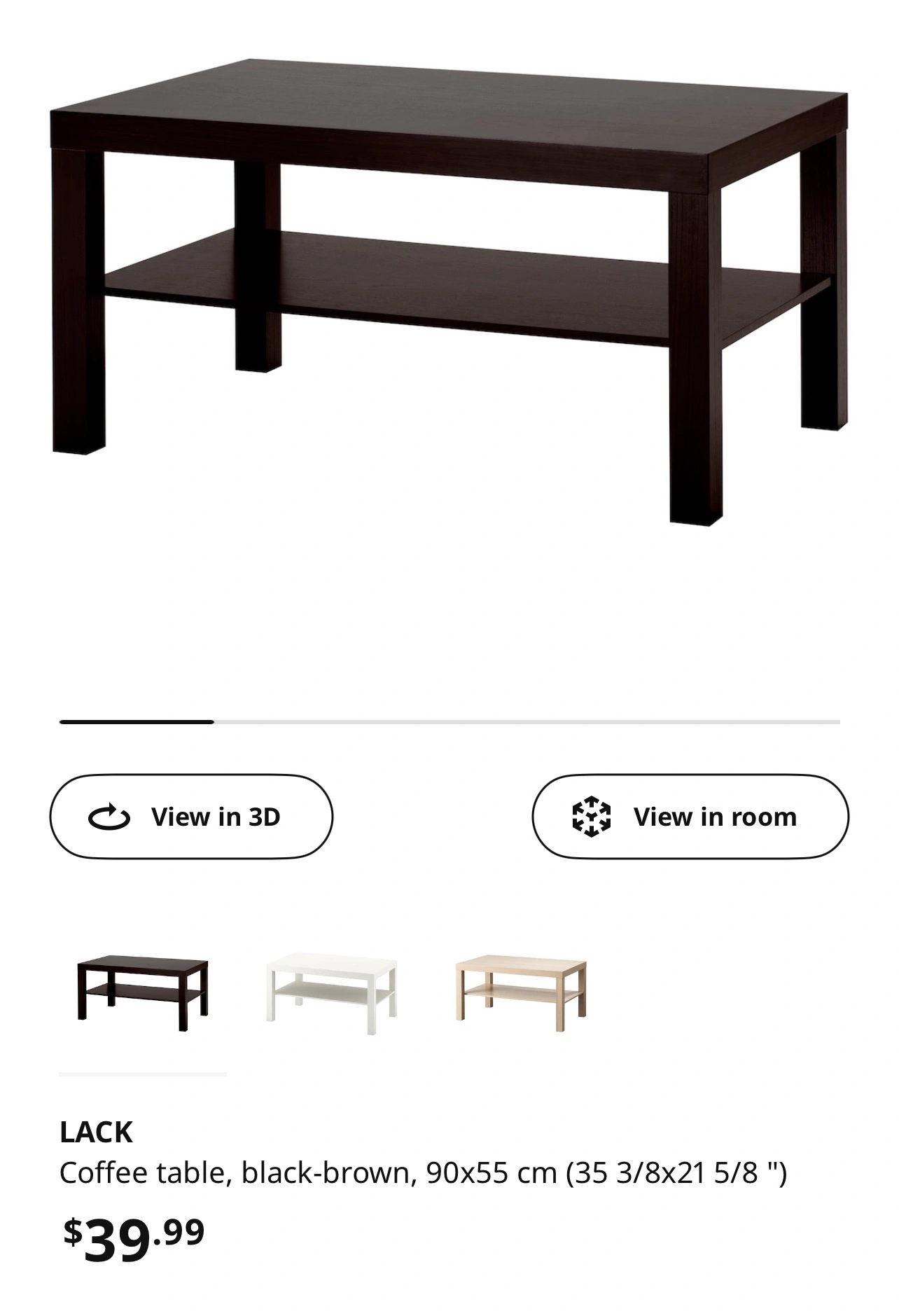 Buy & SellIKEA Lack Coffee TableIKEA Lack Coffee Table$30Black-brown coffee table with a shelf. It is 90 cm long by 55 cm wide. It is in great condition. Pick-up only.ConditionLike newWHERE TO MEETCheck LocationView MapSELLERverifiedYasmeenSouth Millway1064 reviews2 chats·1 favorites·47 viewsSEND CHAT TO SELLERHi Yasmeen! I’m interested in your listing.Hi Yasmeen! I’m interested in your listing.Get the Karrot app to chatSign In to chat
