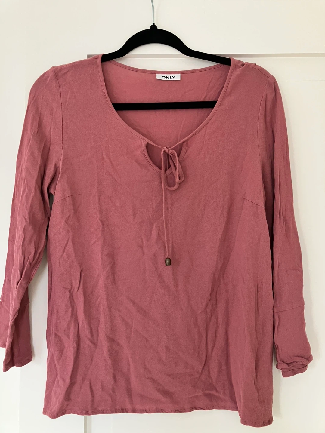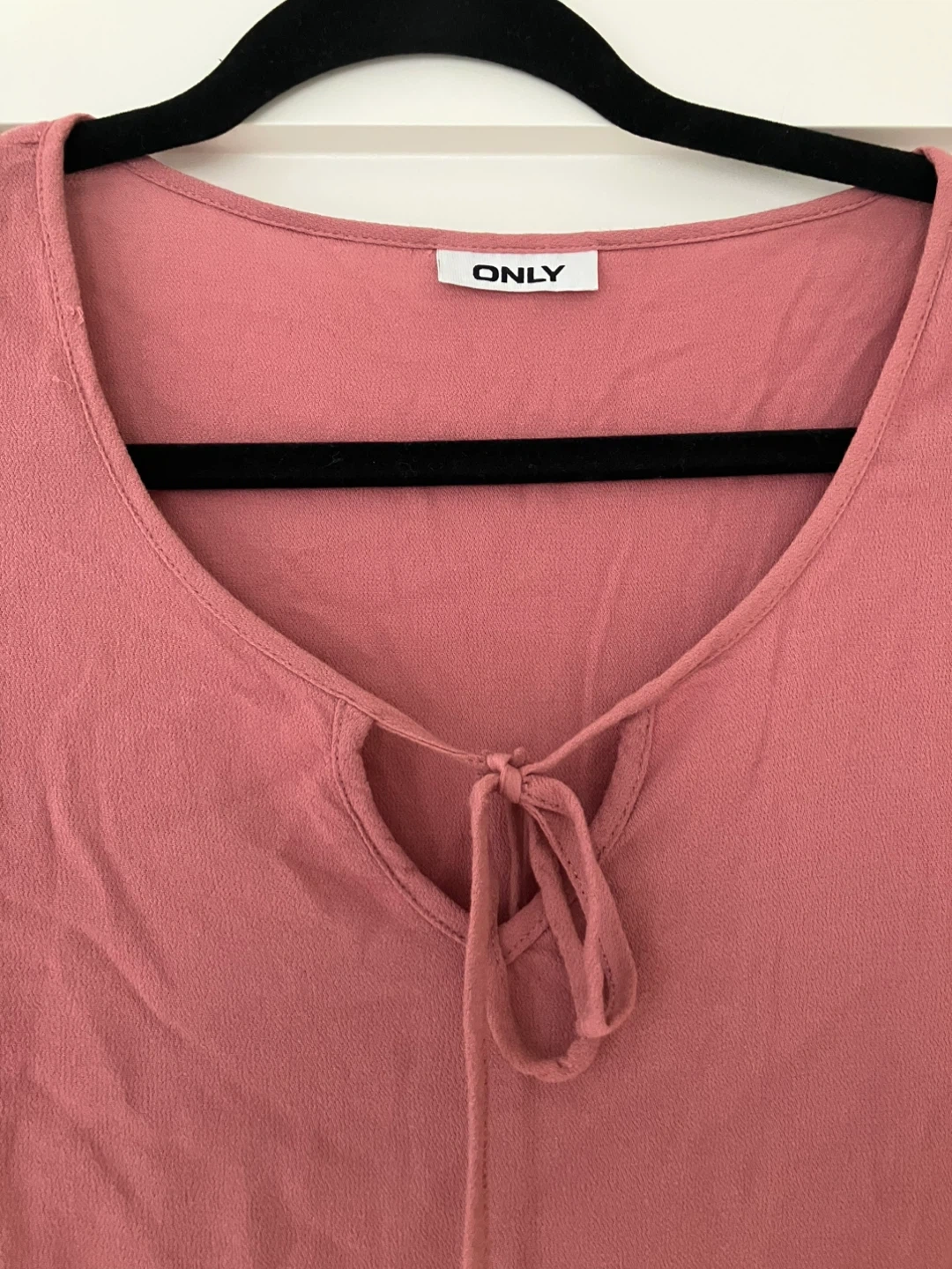 ONLY women's long-sleeve top in a dusty rose colour. It features a tie-neck detail and bell sleeves. Size medium (EU 40).