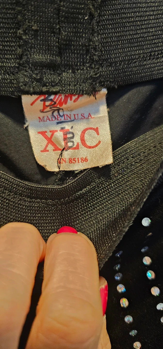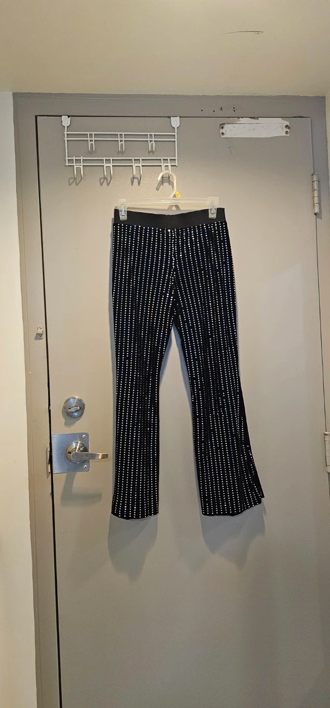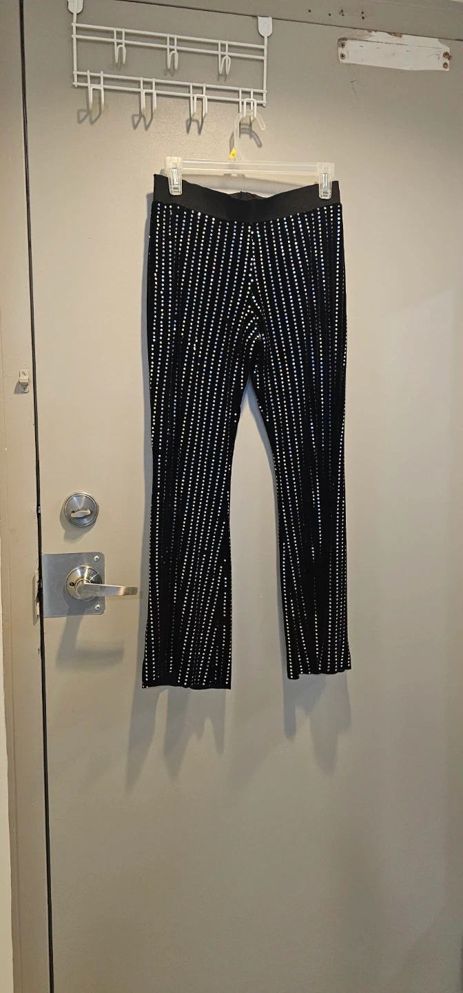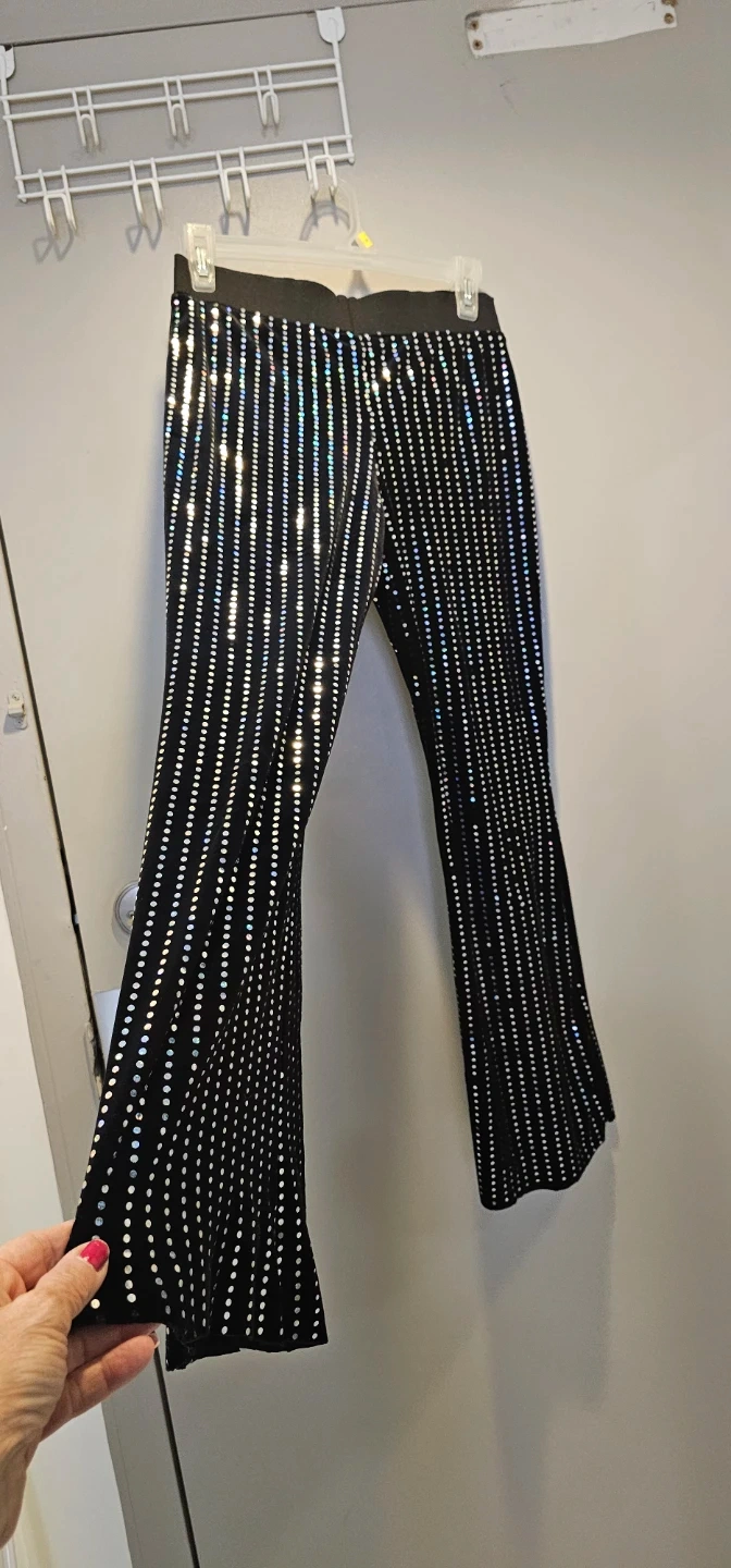 These black velvet bell bottom pants are covered in vertical stripes of shimmering rhinestones. They're stretchy and comfortable for a night out. Great for parties or costume events!