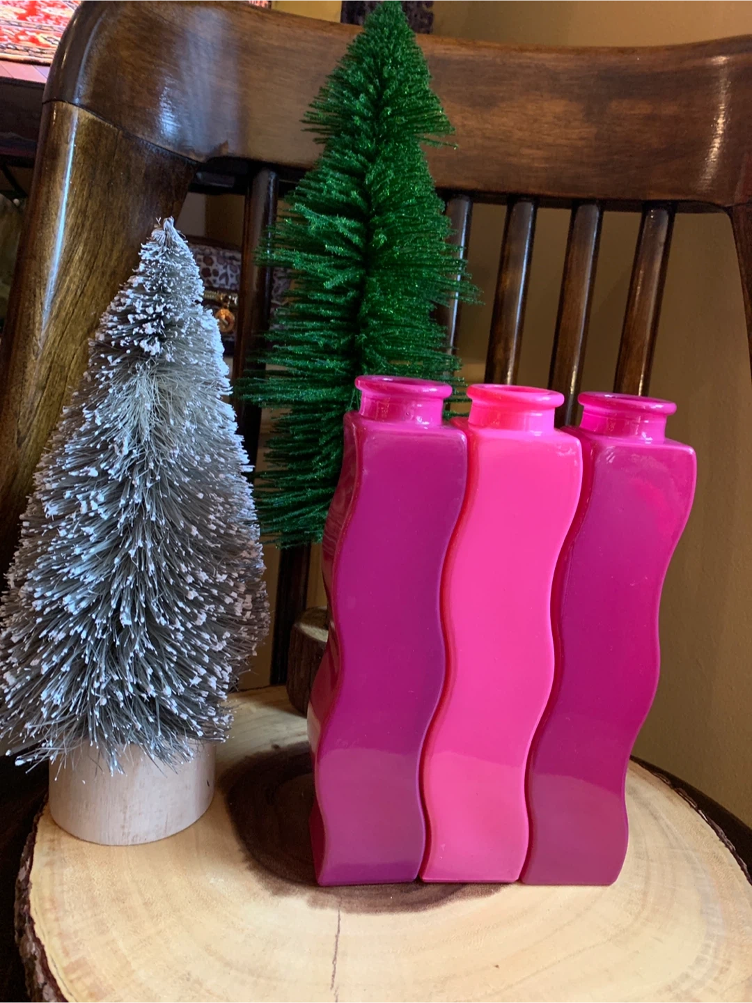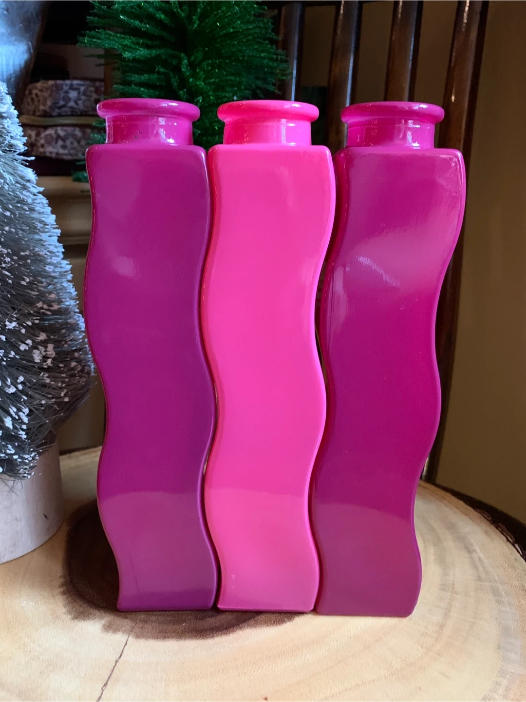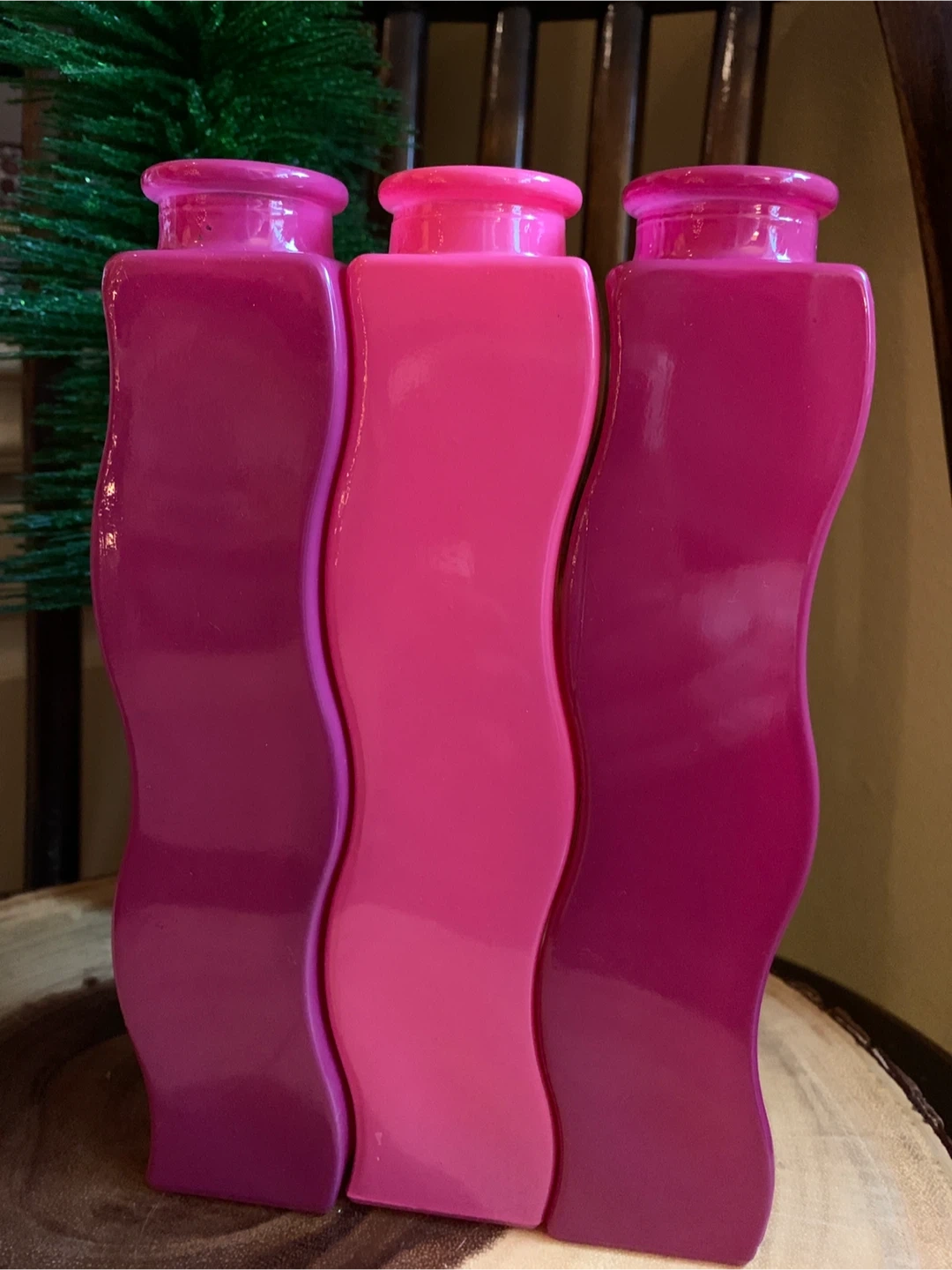 A second lot of the iconic vintage IKEA squiggly vases. These are circa 1990’s Skämt vases and are no longer made. The three decorative vases are in varying shades of pink, fuchsia and raspberry. They have a unique wavy design and can fit together or be placed apart. They would add a pop of colour to any room!