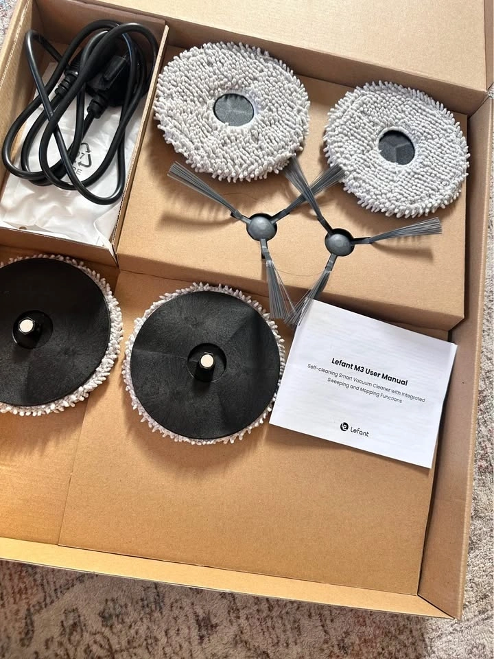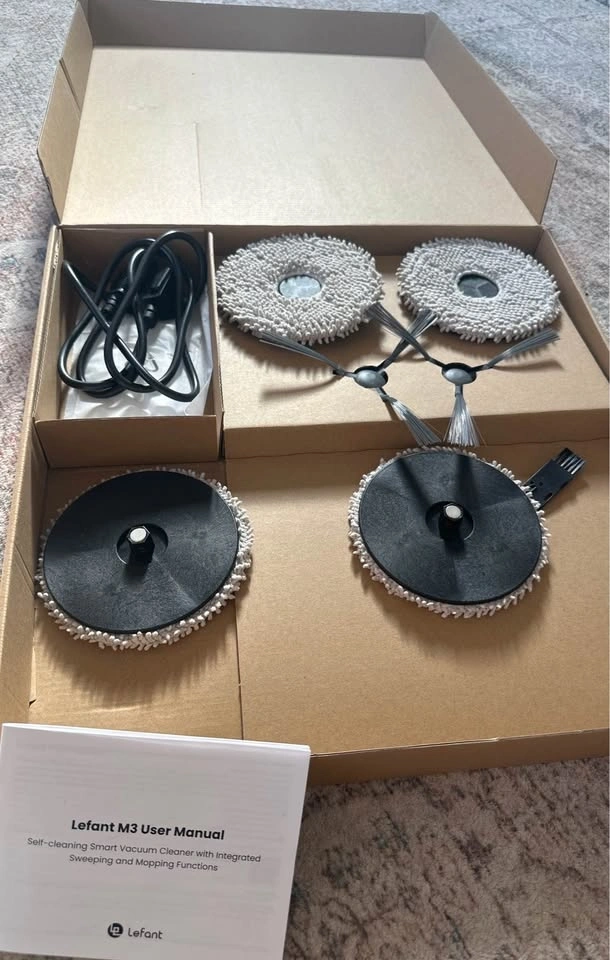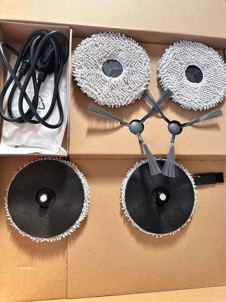 Includes mop pads for wet cleaning, mop plate holders, side brushes for sweeping edges, a charging cable, and a small cleaning tool for maintenance. Feel free to message if you have any questions!