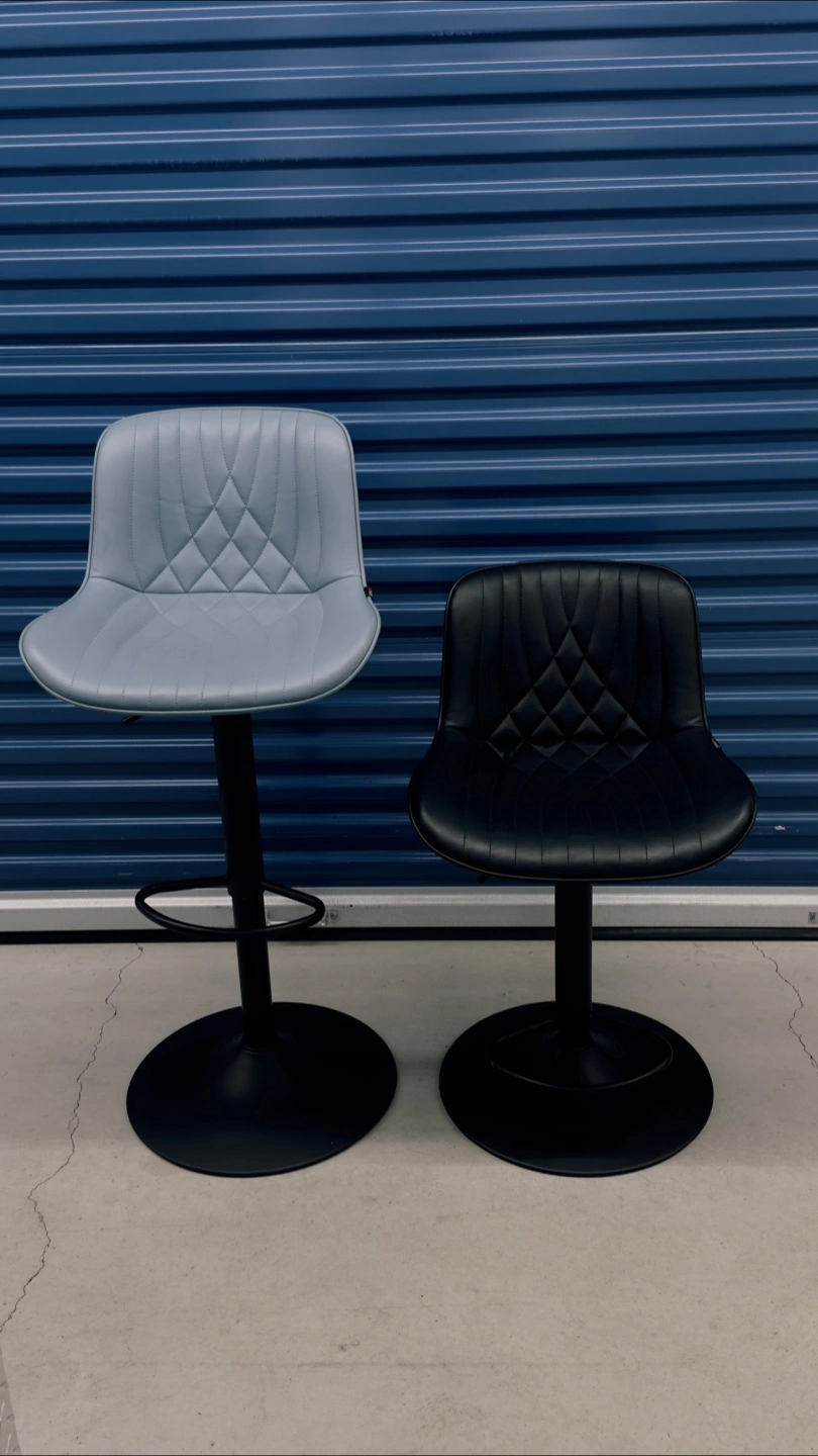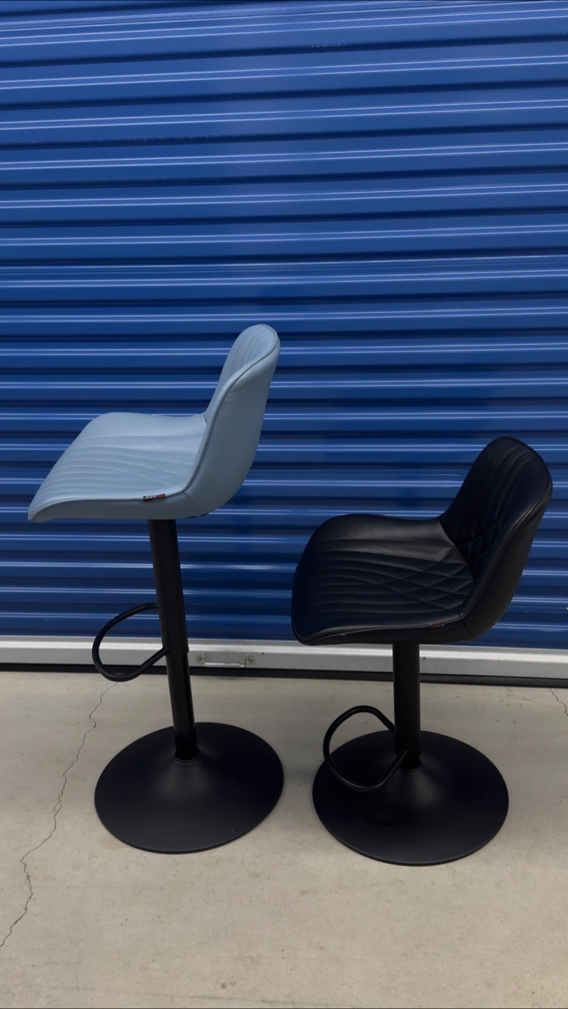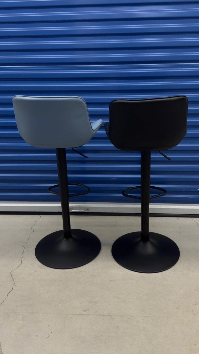 Set of two adjustable height bar stools, one in black and one in light blue. They're upholstered in faux leather with a diamond stitch pattern and feature a sturdy metal base with a footrest. Great for a kitchen counter or bar area!