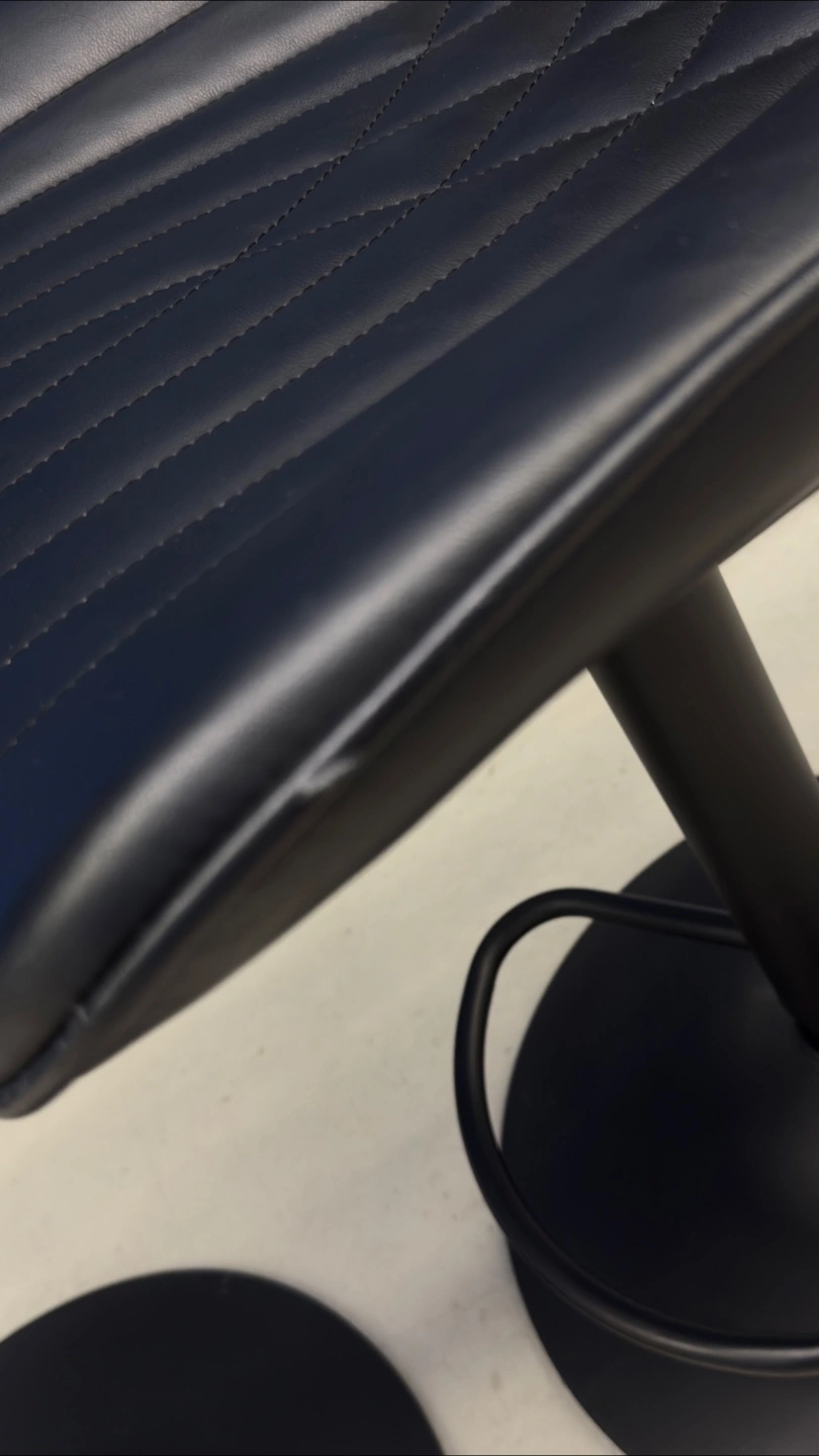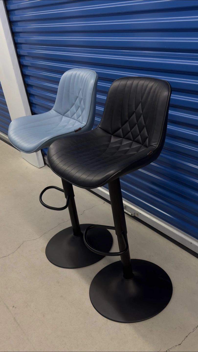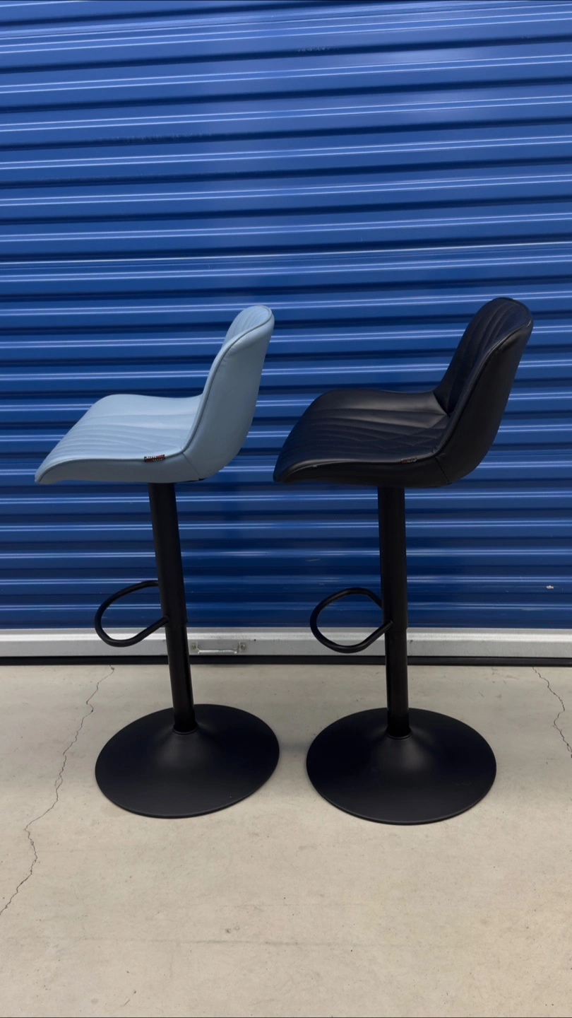 Set of two adjustable height bar stools, one in black and one in light blue. They're upholstered in faux leather with a diamond stitch pattern and feature a sturdy metal base with a footrest. Great for a kitchen counter or bar area!