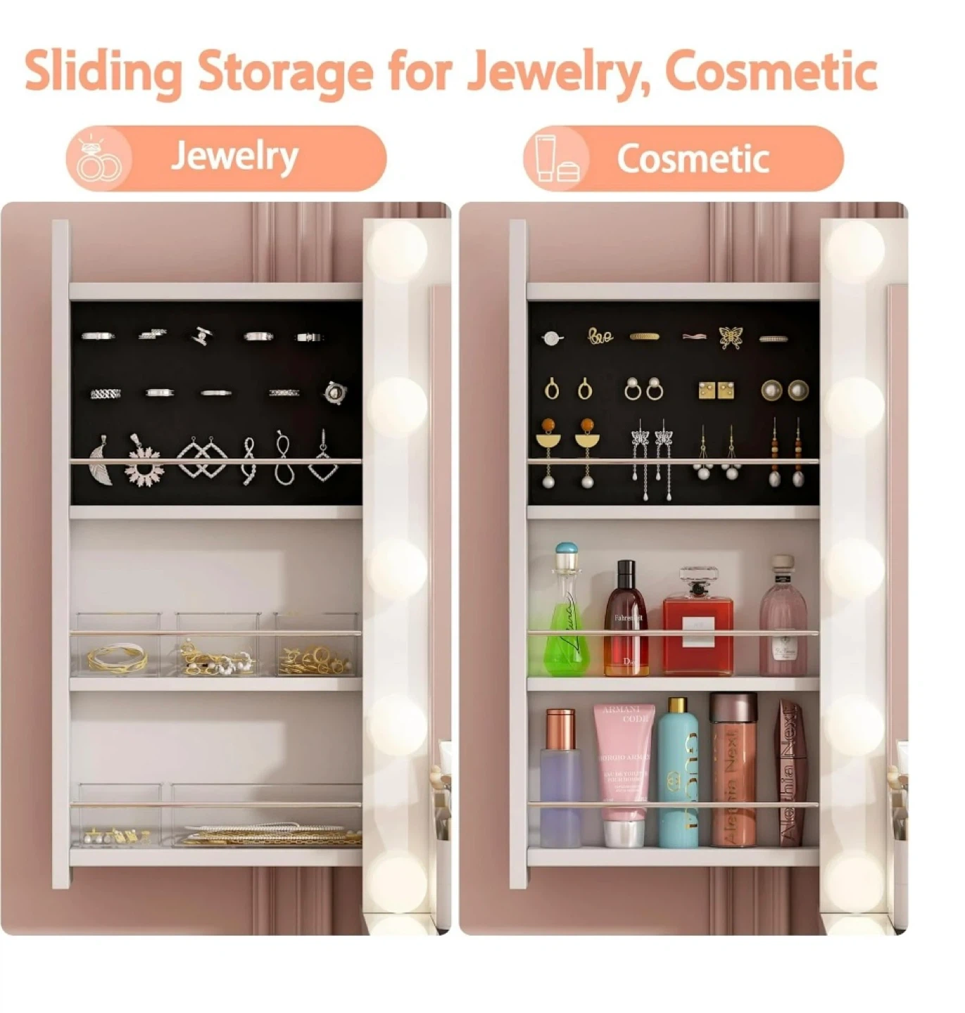 White Vanity Desk with Lighted Mirror & Storage Shelves