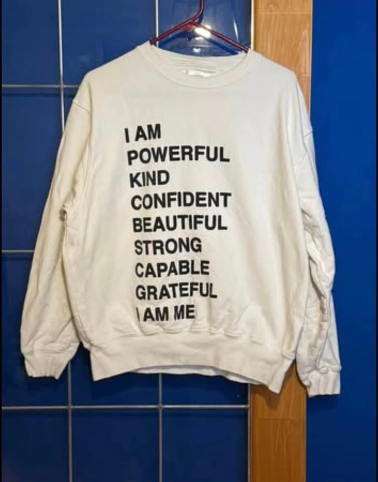 Authentic Anine Bing Empowerment Ramona Sweatshirt in white. Features the iconic affirmation text: “I AM POWERFUL KIND CONFIDENT BEAUTIFUL STRONG CAPABLE GRATEFUL I AM ME”. Brand: Anine Bing. Size: Medium. Color: White. Condition: Gently used, great condition. Original price: ~$169 USD. Status: Sold out everywhere. Super comfy, elevated casual staple — perfect with leather pants, denim, or layered under a coat. Smoke-free home. Pick up in Abbotsford, Mount Lehman Area.