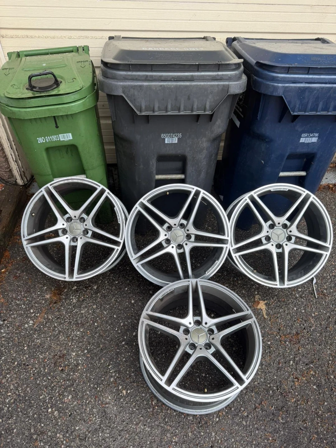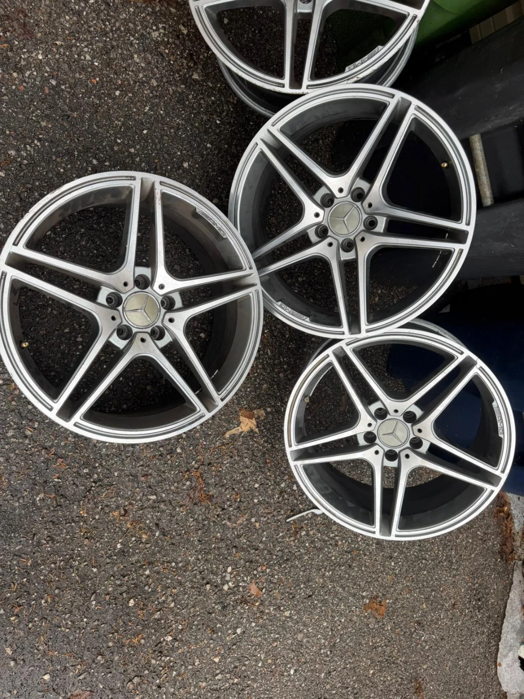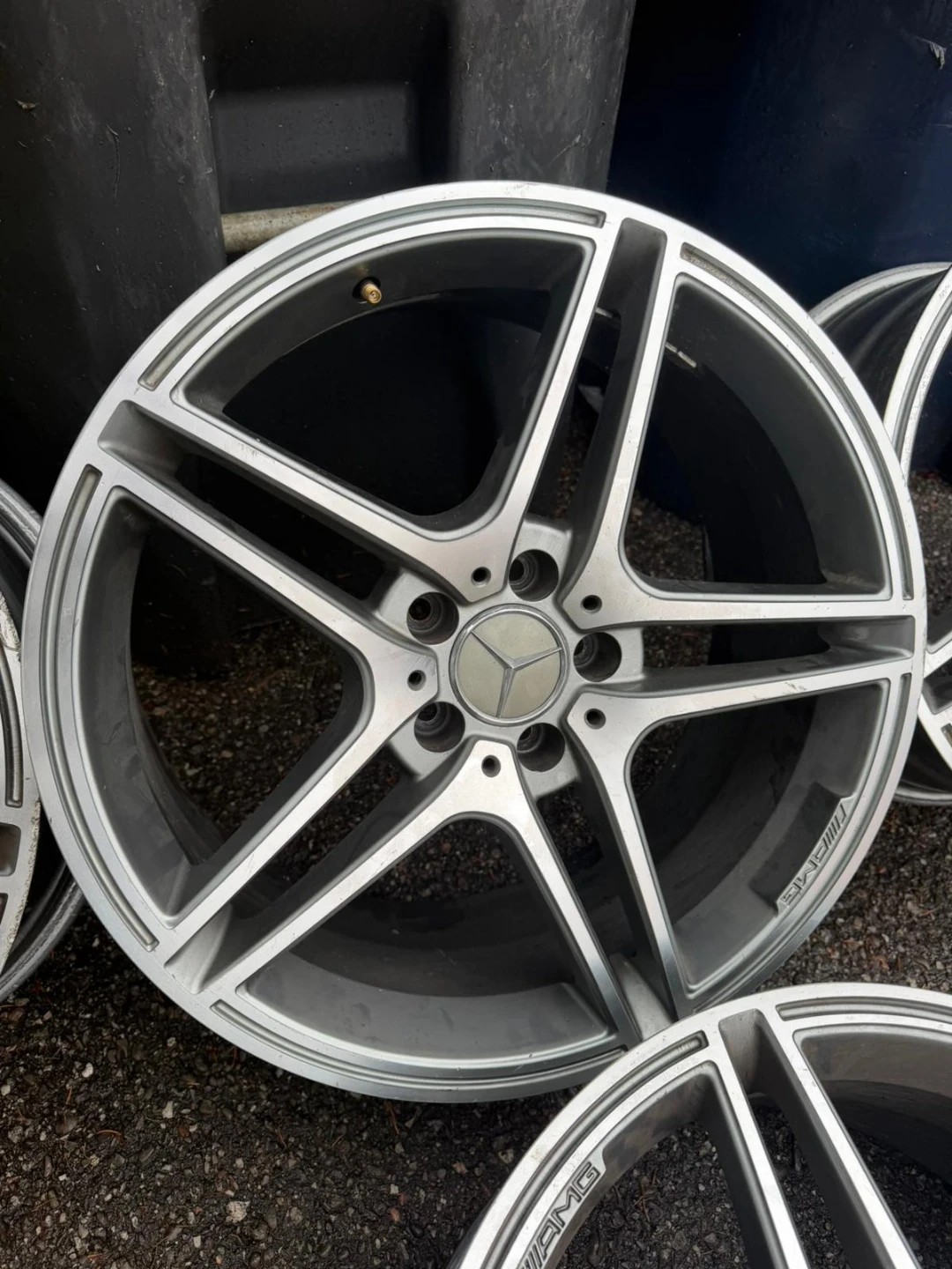 Set of four genuine Mercedes-Benz AMG alloy wheels. These wheels are silver and come in a 5-spoke design. They're in used condition, showing some wear. Perfect for a Mercedes-Benz enthusiast looking to upgrade their vehicle's look!