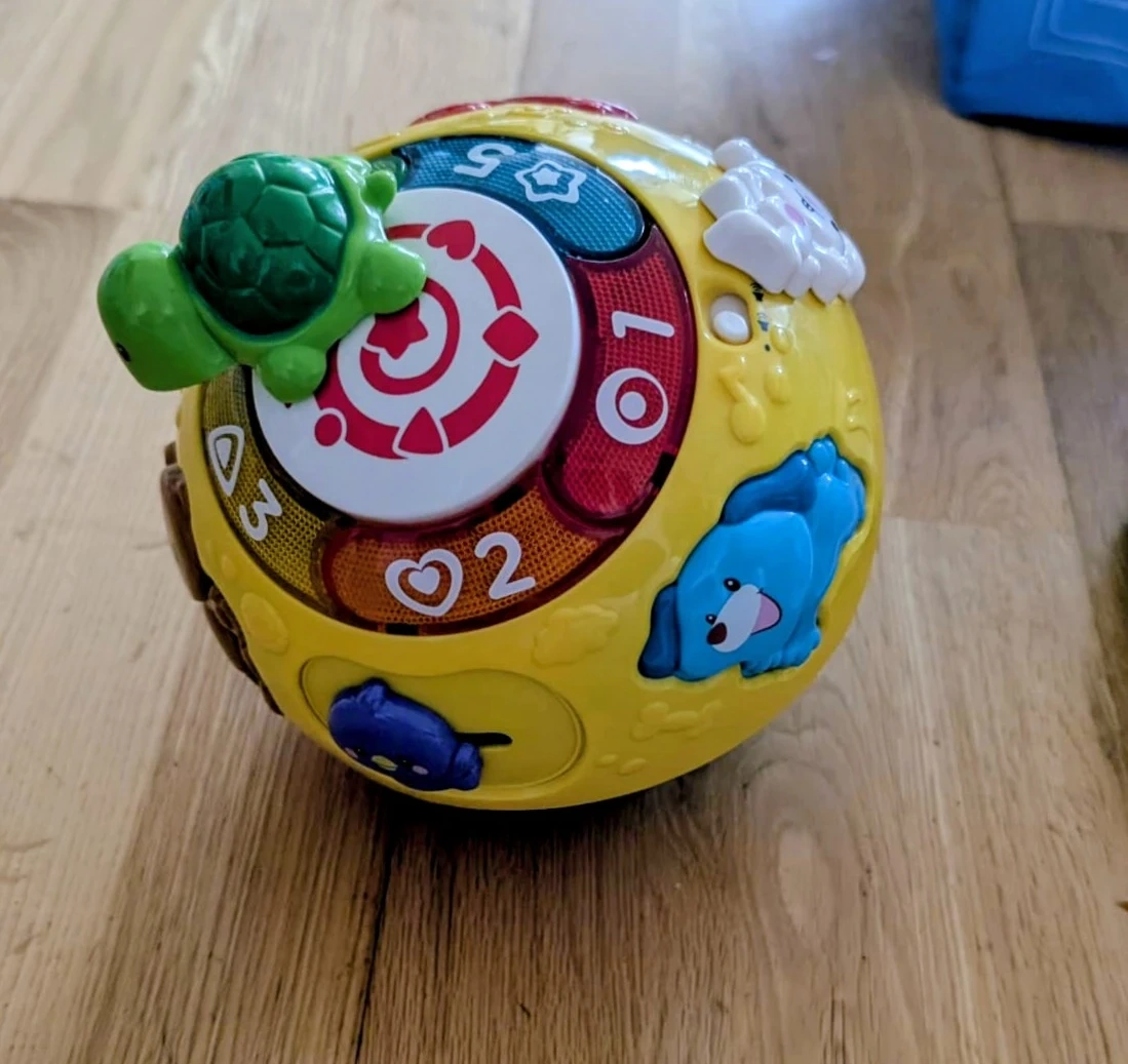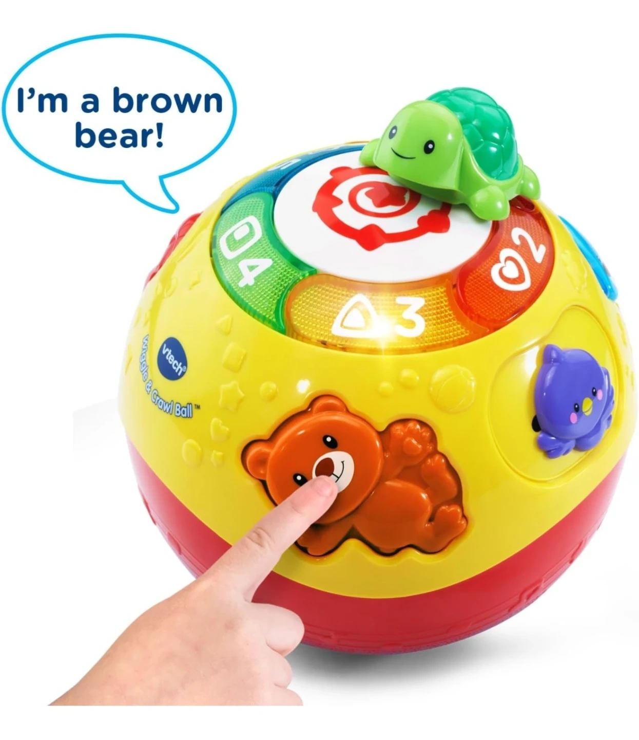 This VTech Wiggle & Crawl Ball is designed for ages 6-36 months. It features flashing lights, plays over 45 songs, melodies, sounds, and phrases to attract baby's attention. The ball encourages babies to crawl as it wobbles and rolls on its own.