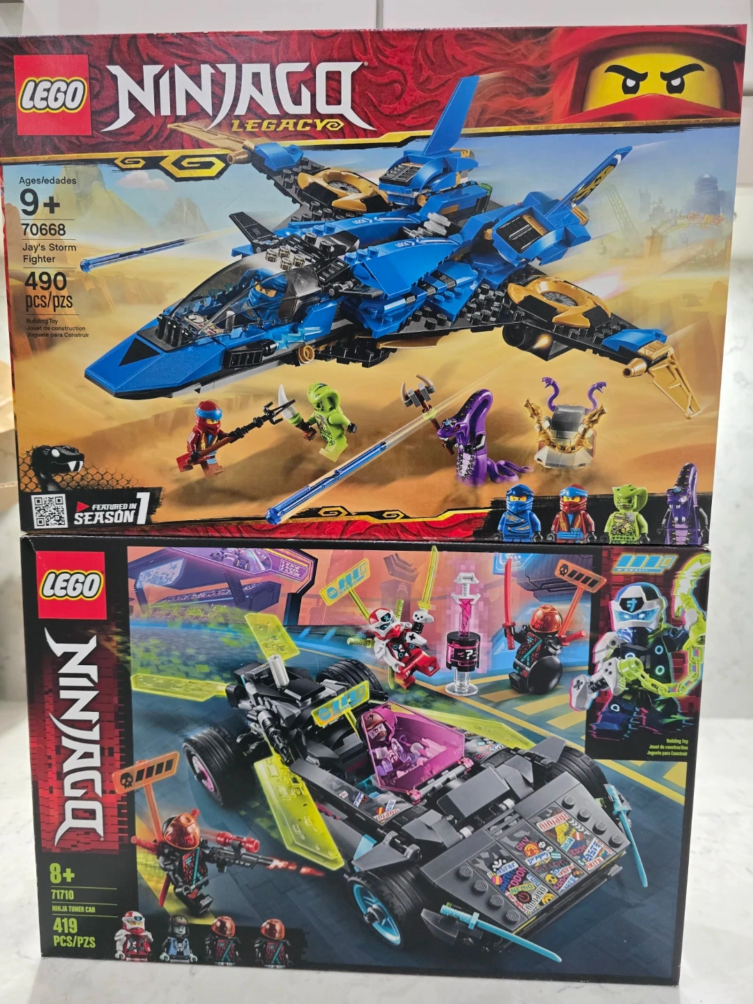 Selling two LEGO Ninjago sets: Jay's Storm Fighter (70668) for ages 9+ with 490 pieces, and the Ninja Tuner Car (71710). These are new and sealed sets.