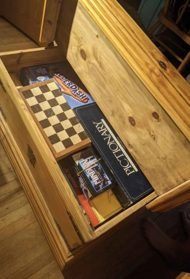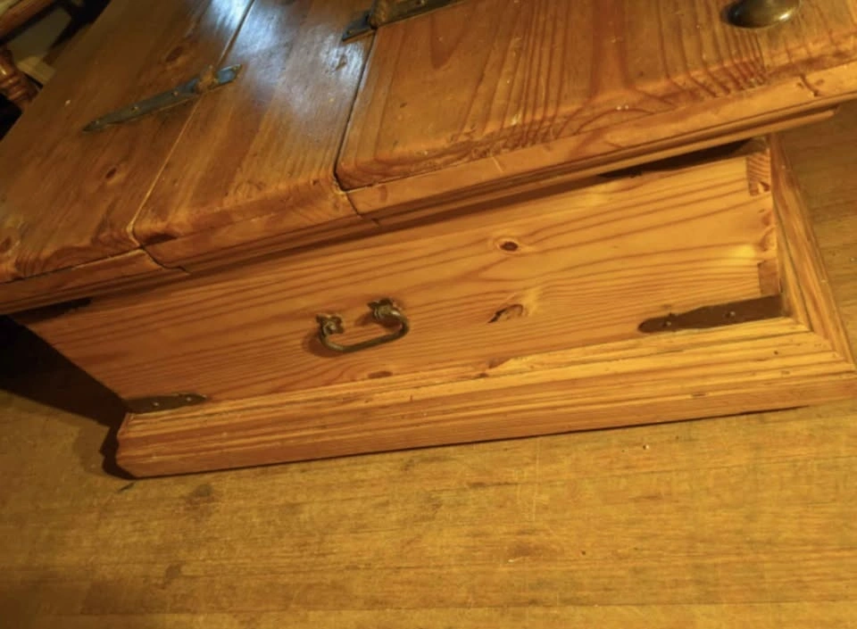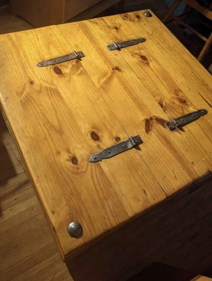 Vintage trunk-style coffee table, solid wood with metal accents and hinges. Each side opens to deep storage space for games and puzzles (not included), or blankets, pillows, etc. Expertly refinished in good used condition. 35 inches square by 17 inches high. I am in East York, closest main intersection is Danforth and Woodbine, I'm just north of the intersection.