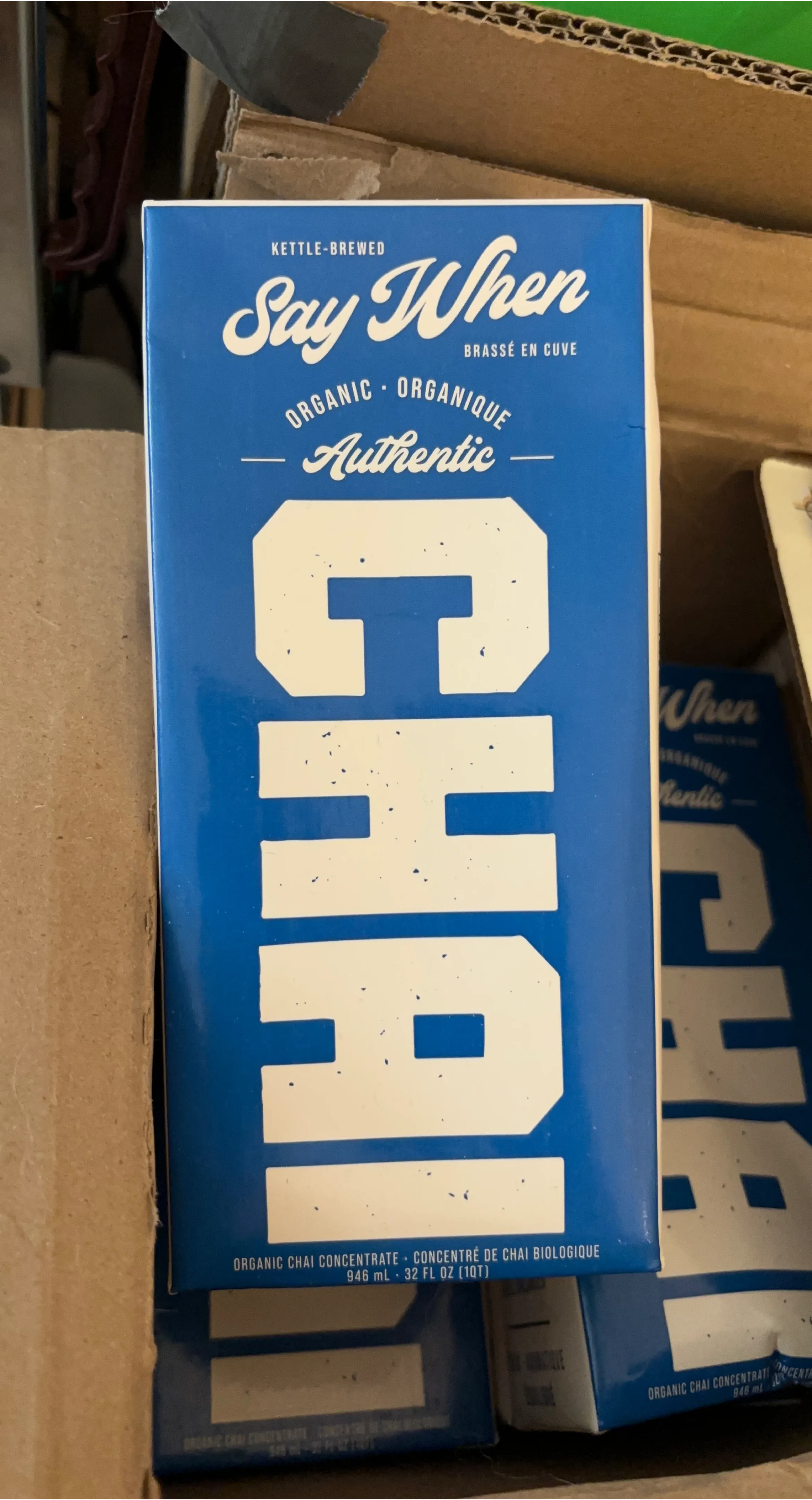 This is Say When Organic Chai concentrate. It's kettle-brewed and authentic. The bottle contains 946 mL or 32 fluid ounces of concentrate. It's great for making a quick and delicious chai latte!