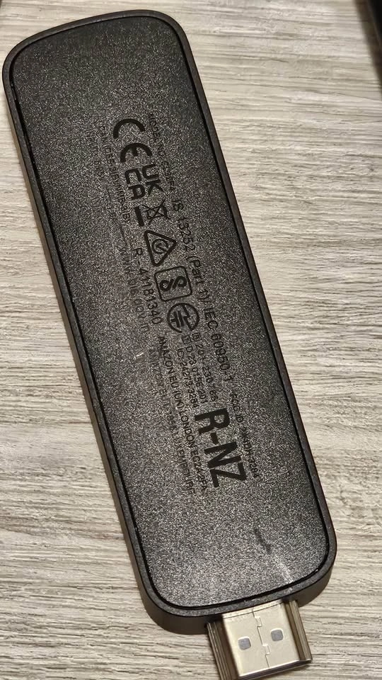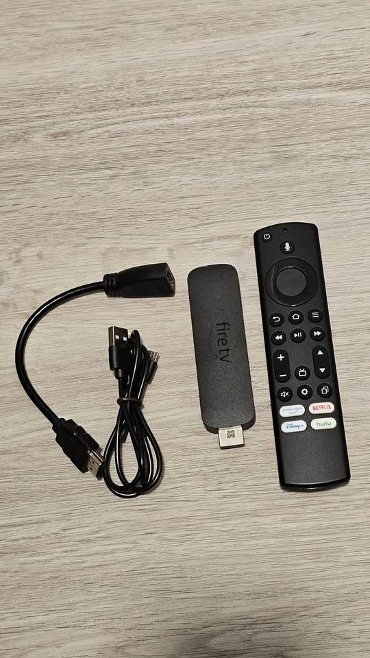 Complete Amazon Fire TV Stick. Has the Fire TV stick itself, the remote control, HDMI extender, and power cable. Ready to plug into your TV for streaming.