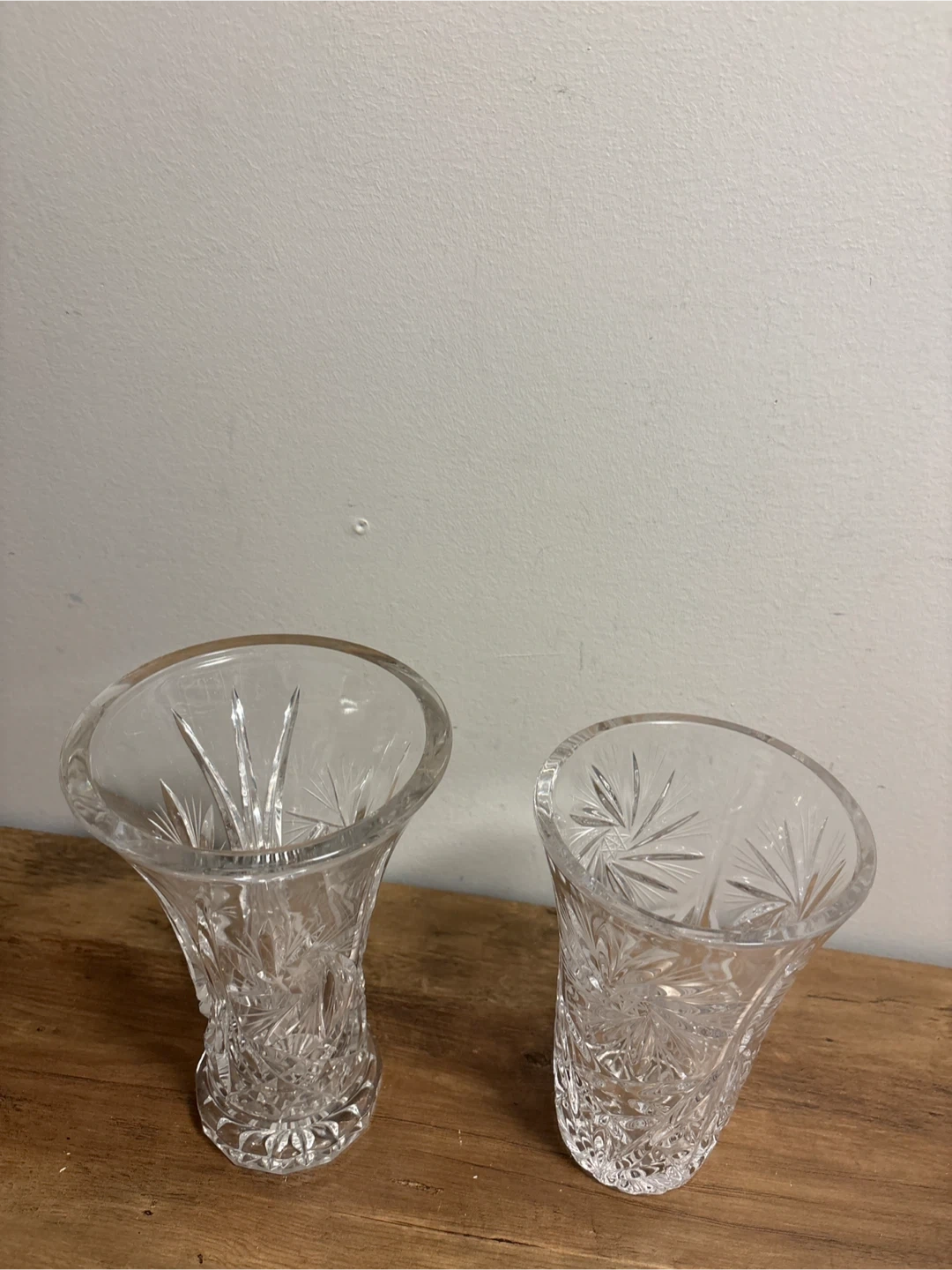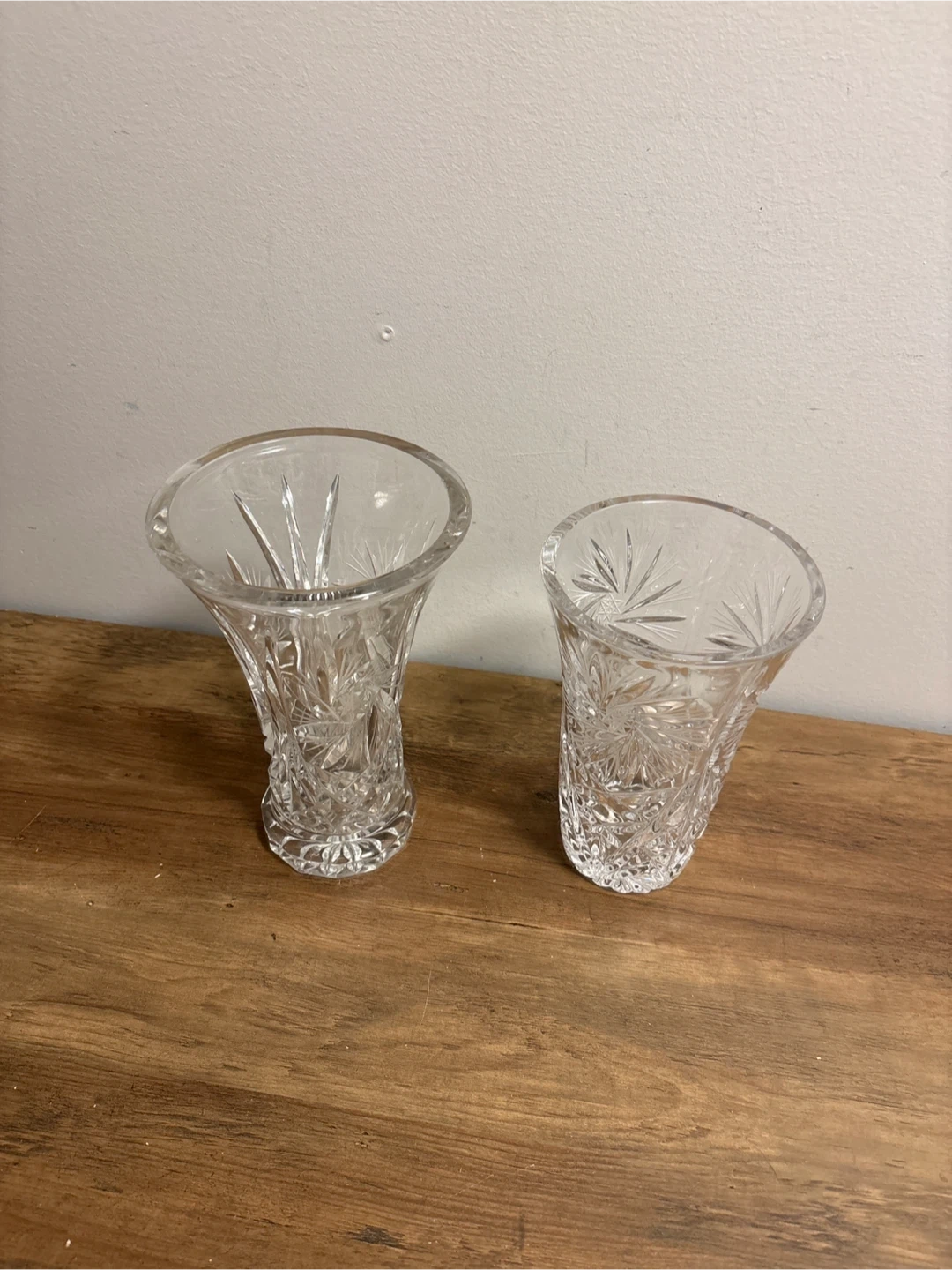 Two clear crystal glass vases with starburst patterns. These vases are perfect for bouquets or as decorative accents.