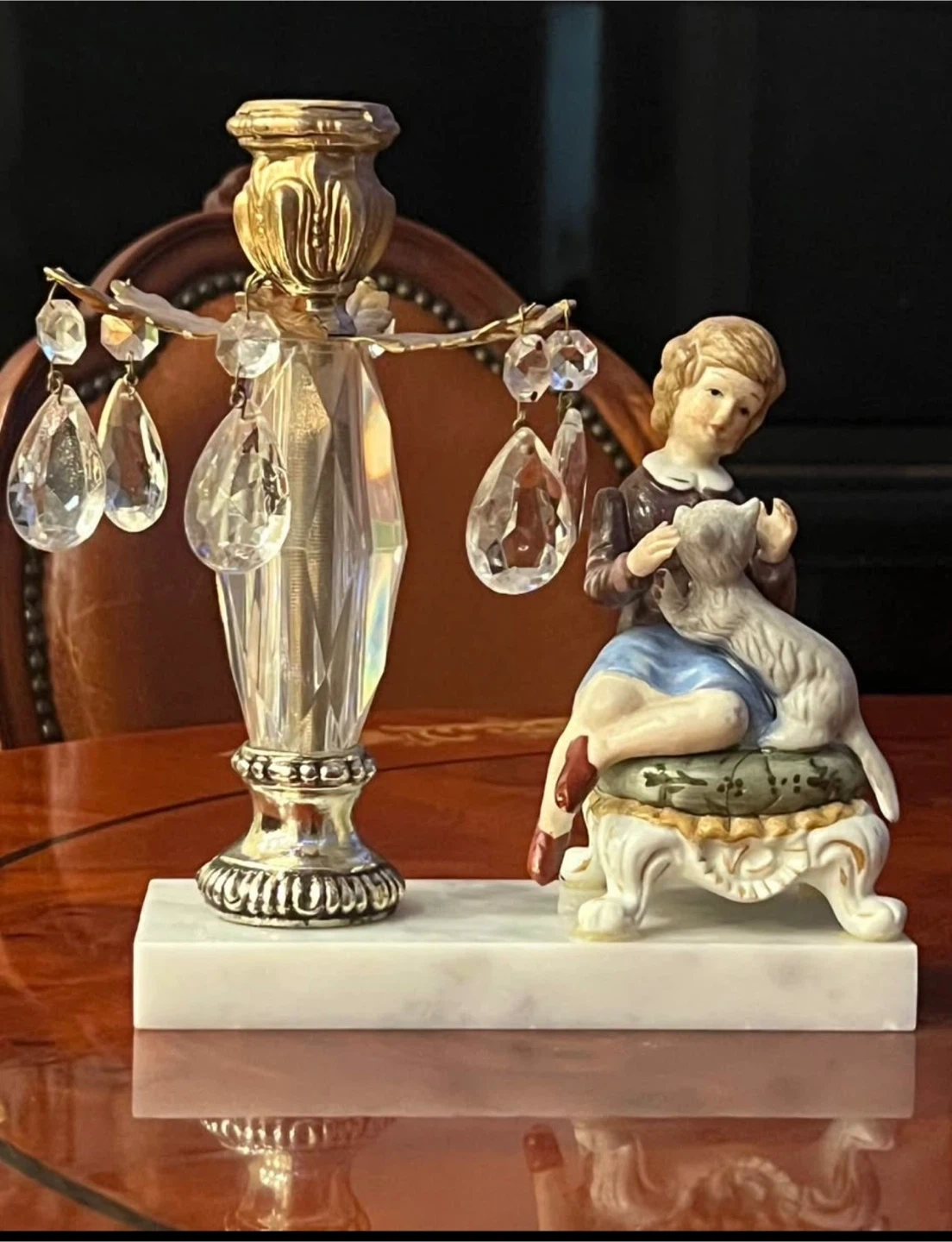 This decorative piece features a ceramic figurine of a child with a dog, paired with a crystal and brass candle holder. It's mounted on a white marble base. Adds a touch of elegance to any room!