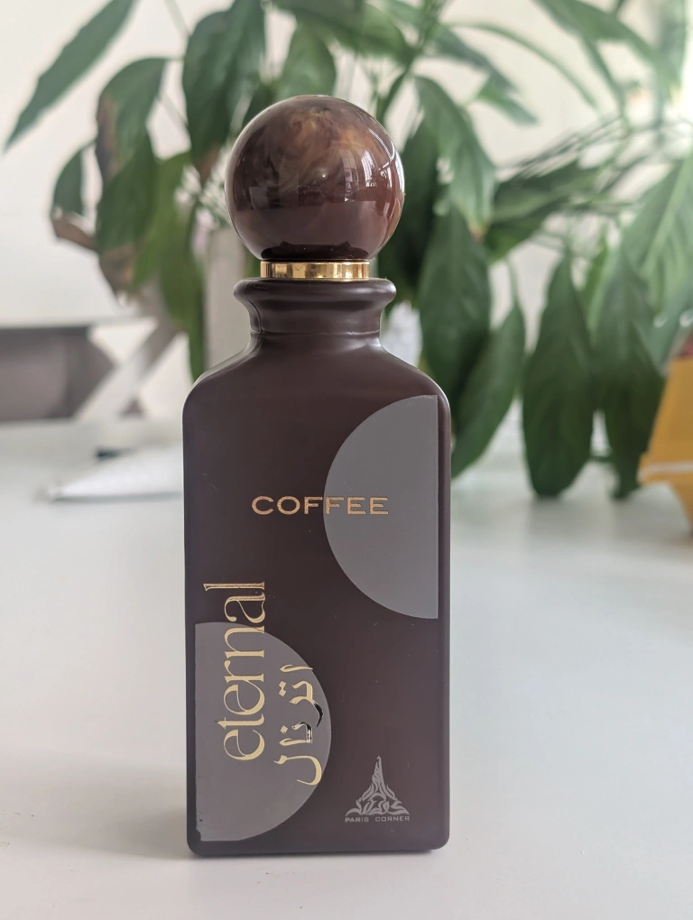 Selling a bottle of Eternal Coffee perfume. It has top notes of milk, caramel, and coffee, middle notes of lactones, coconut, and heliotrope, and base notes of gourmand accord, sugar, musk, and tonka bean