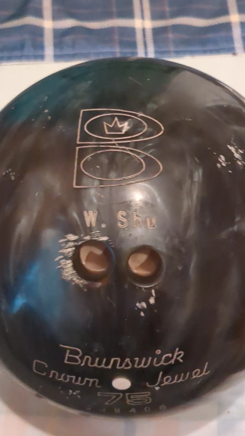 This is a Brunswick Crown Jewel 75 bowling ball. It has W. Shu engraved on it. The ball is dark coloured with a swirling pattern. It has scratches