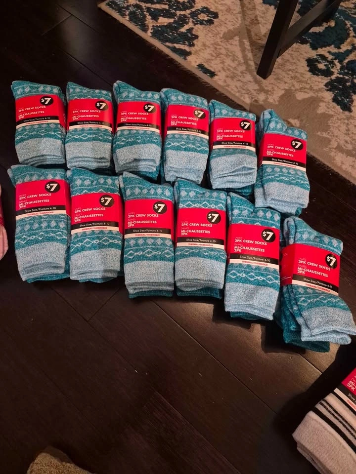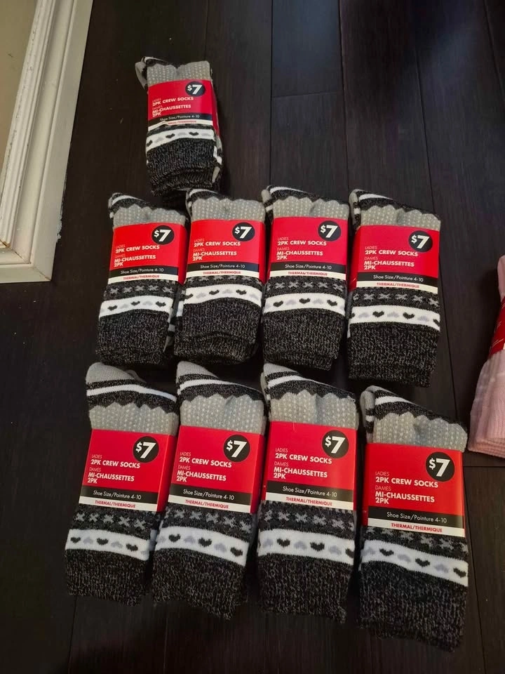 Brand new Derry & McLaughlin thermal crew socks. Each pack contains 2 pairs. Available quantities and colors: 9 Black/Grey Heart, 10 Pink, 14 Blue, 6 Black/Grey Striped, 1 Brown Striped. Price: $3 for 1 pack, $5 for 2 packs.
