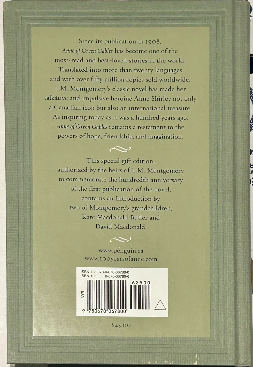 Immerse yourself in the cherished tale of "Anne of Green Gables" by L.M. Montgomery, a book that has captured hearts for generations. This special gift edition commemorates the hundredth anniversary of the novel's first publication, authorized by the heirs of L.M. Montgomery, and features an introduction by her grandchildren. This hardcover book is in used, but pristine condition.