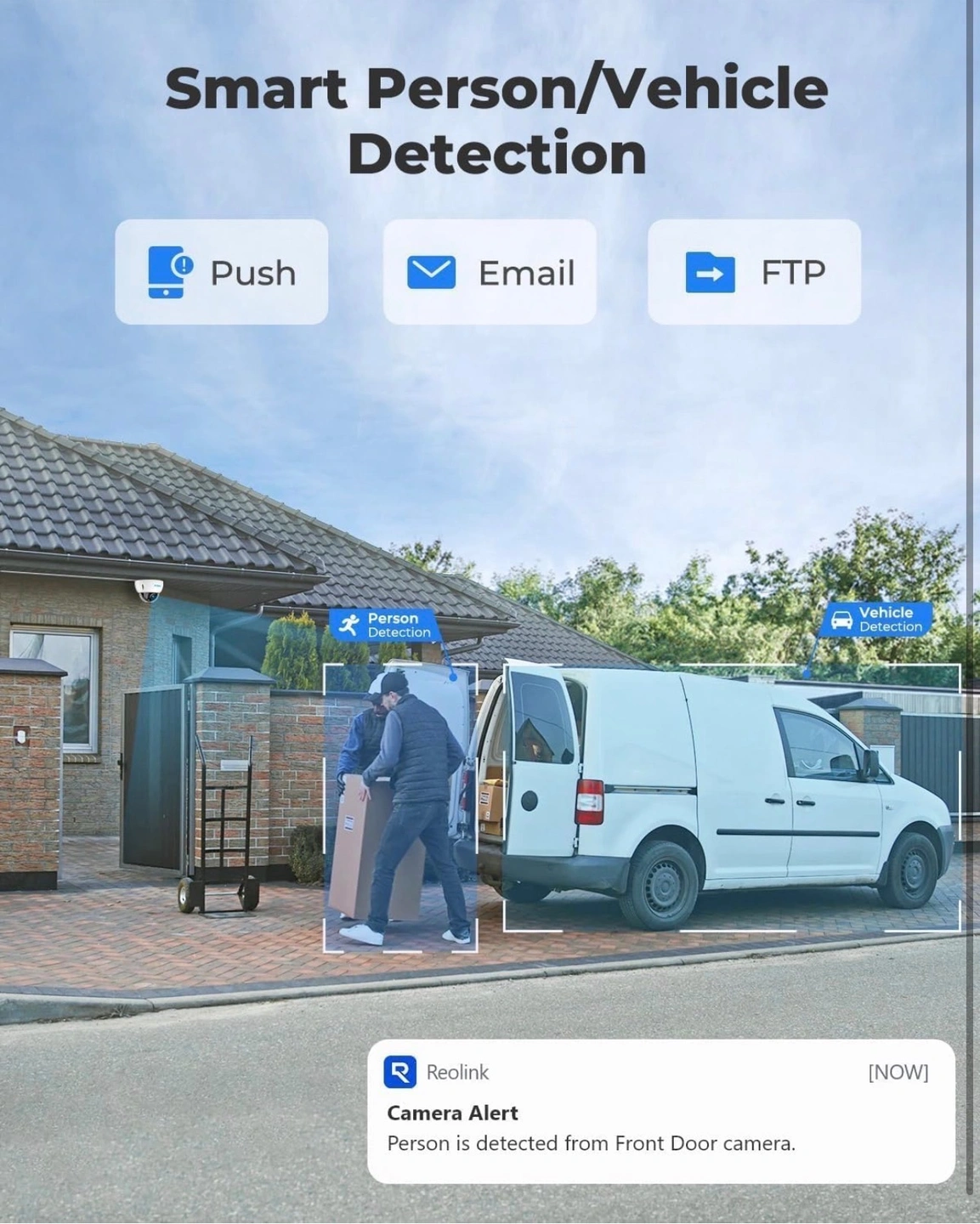 Smart Person/Vehicle Detection - Smart PoE IP cameras can identify people and vehicles minimizing unwanted alerts triggered by bugs or leaves. Filter true threats and get to know what happened simply by glancing at the lock screen. General Motion Dectection is also available.
