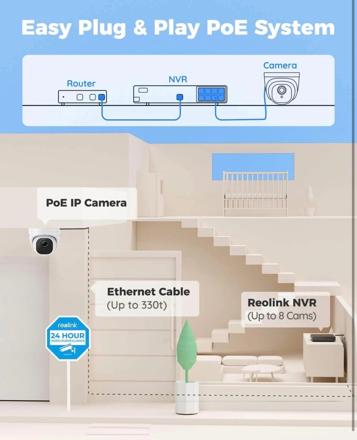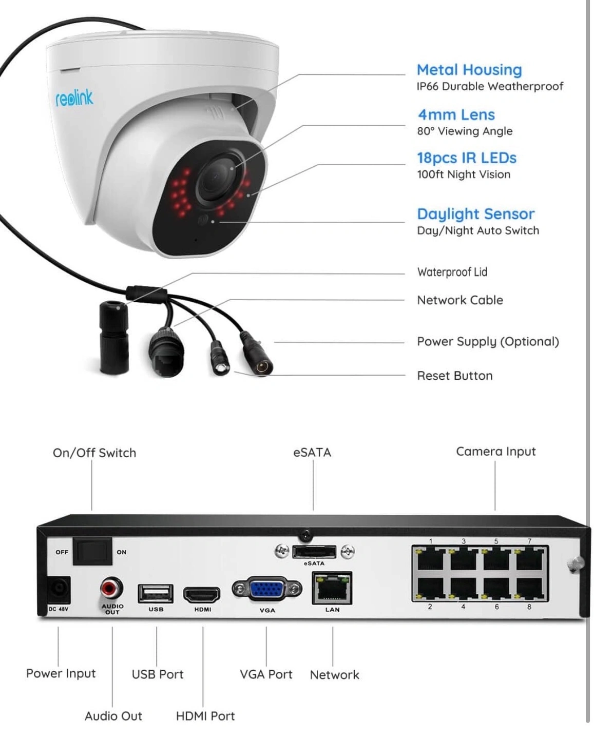 5 Megapixels & 100ft Night Vision - 2560x1920 super HD detailed image and up to 100ft night vision video monitoring, 3,000,000 more pixels than 1080P, 300% more detailed than 720P. With 8 PoE ports on the NVR video recorder, the security system is expandable to work with maximum 8 picecs of Reolink POE.
