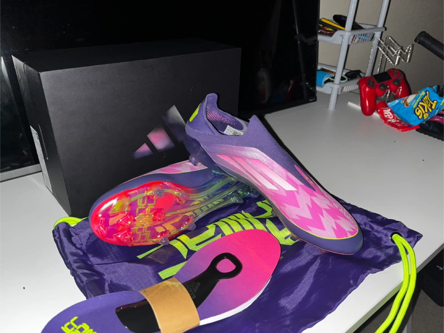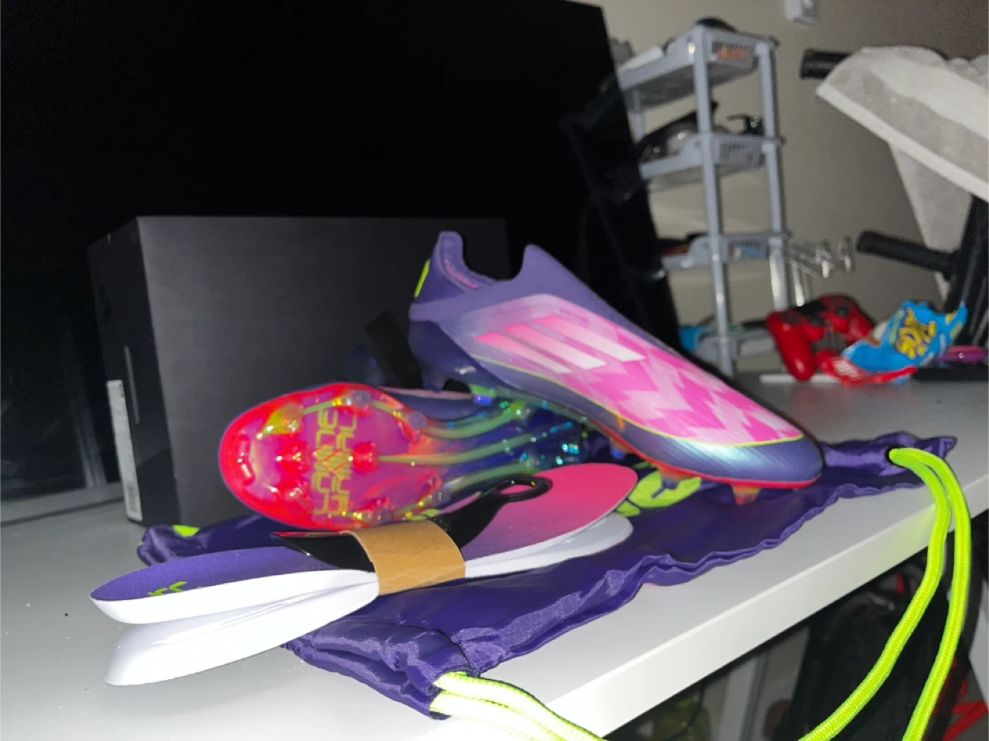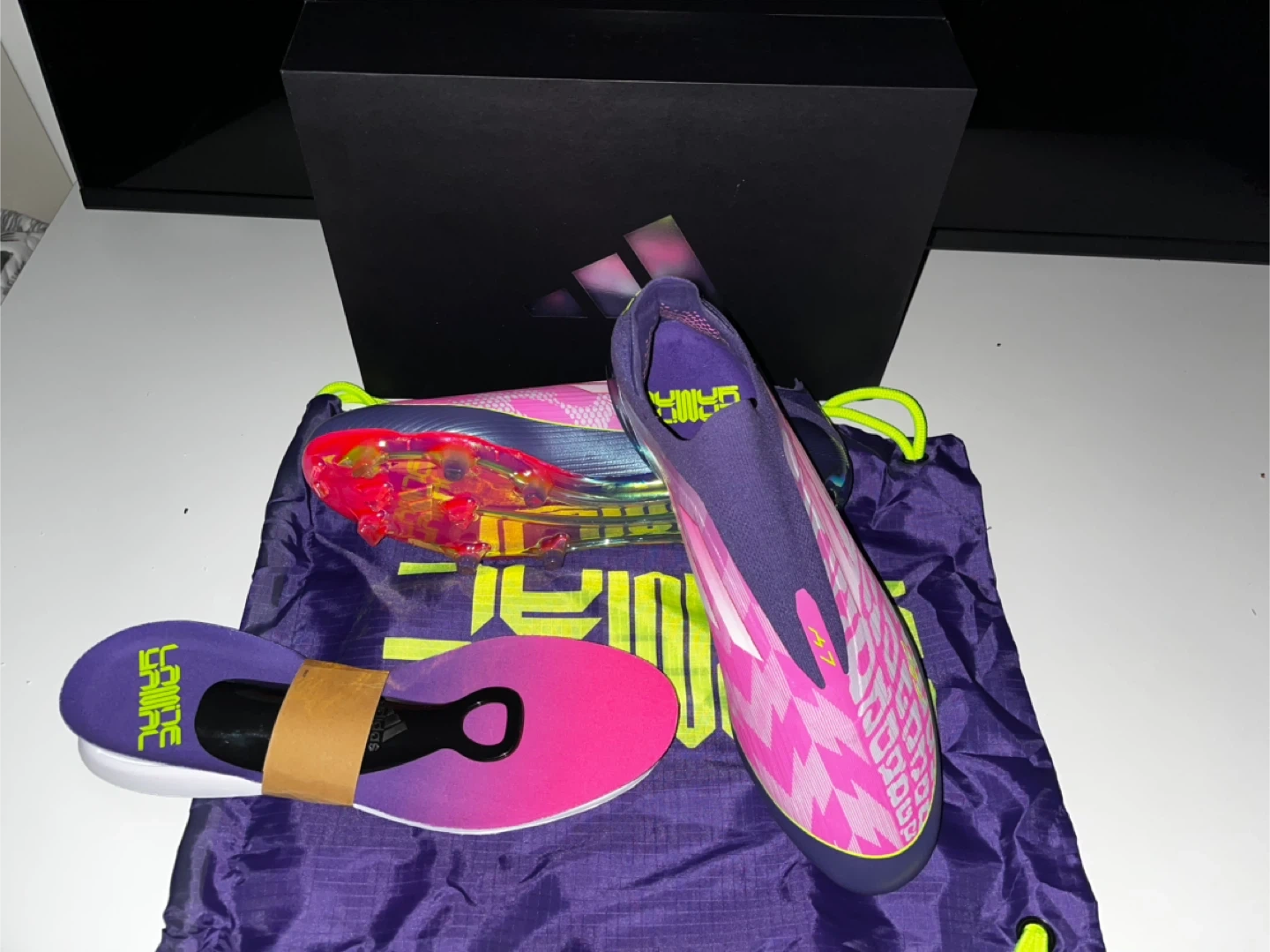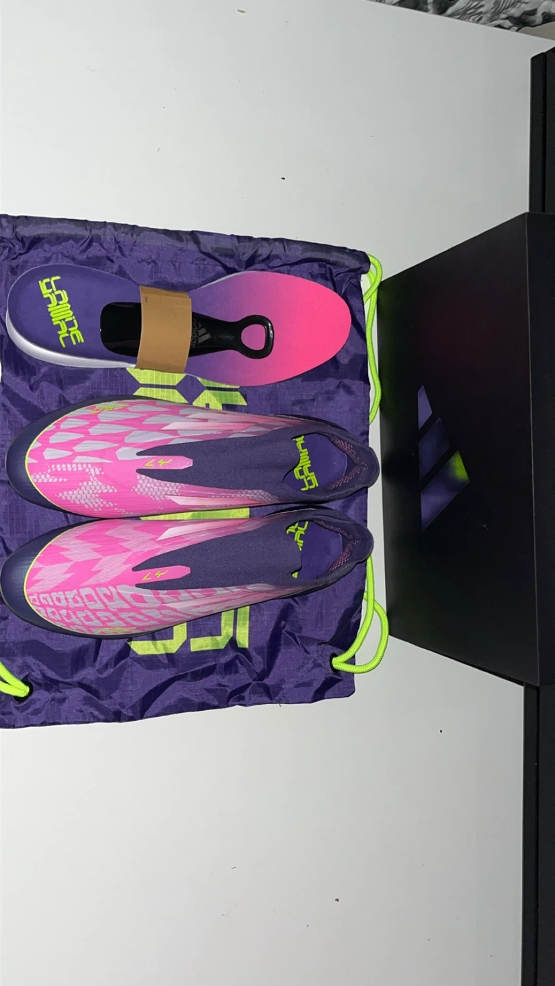 These Adidas X Speedportal.1 FG soccer cleats come in a vibrant purple, pink, and blue gradient. They feature a lightweight design for speed and agility on firm ground. The cleats include a drawstring bag and original packaging.