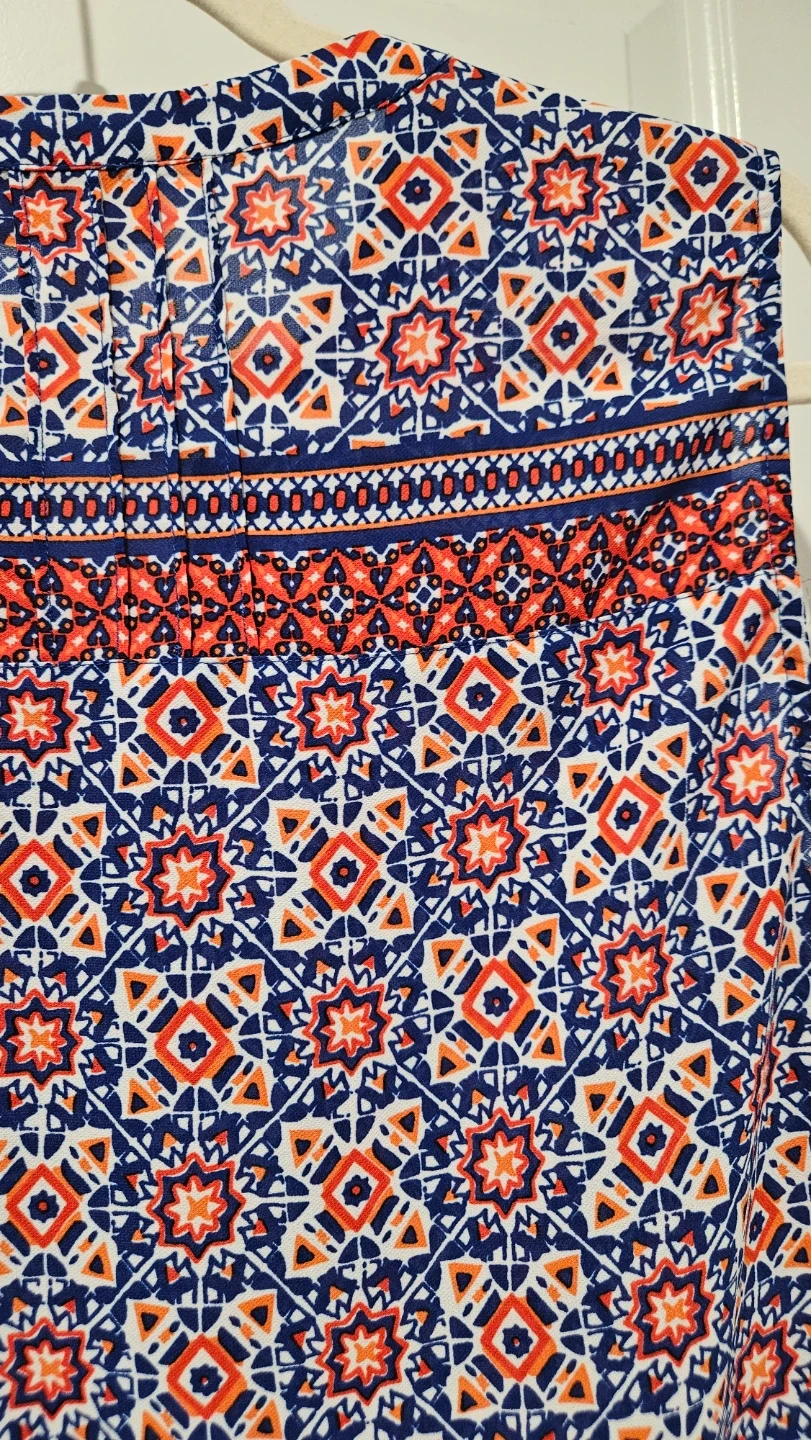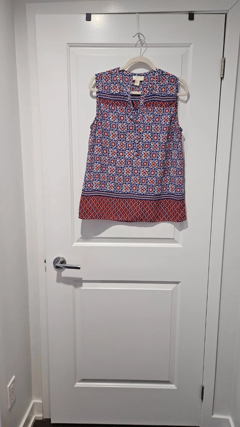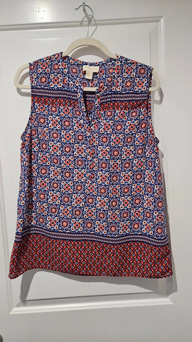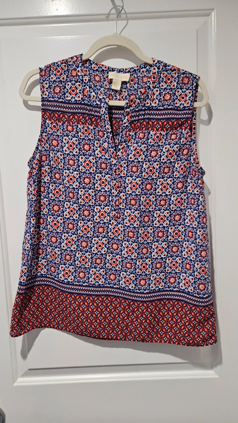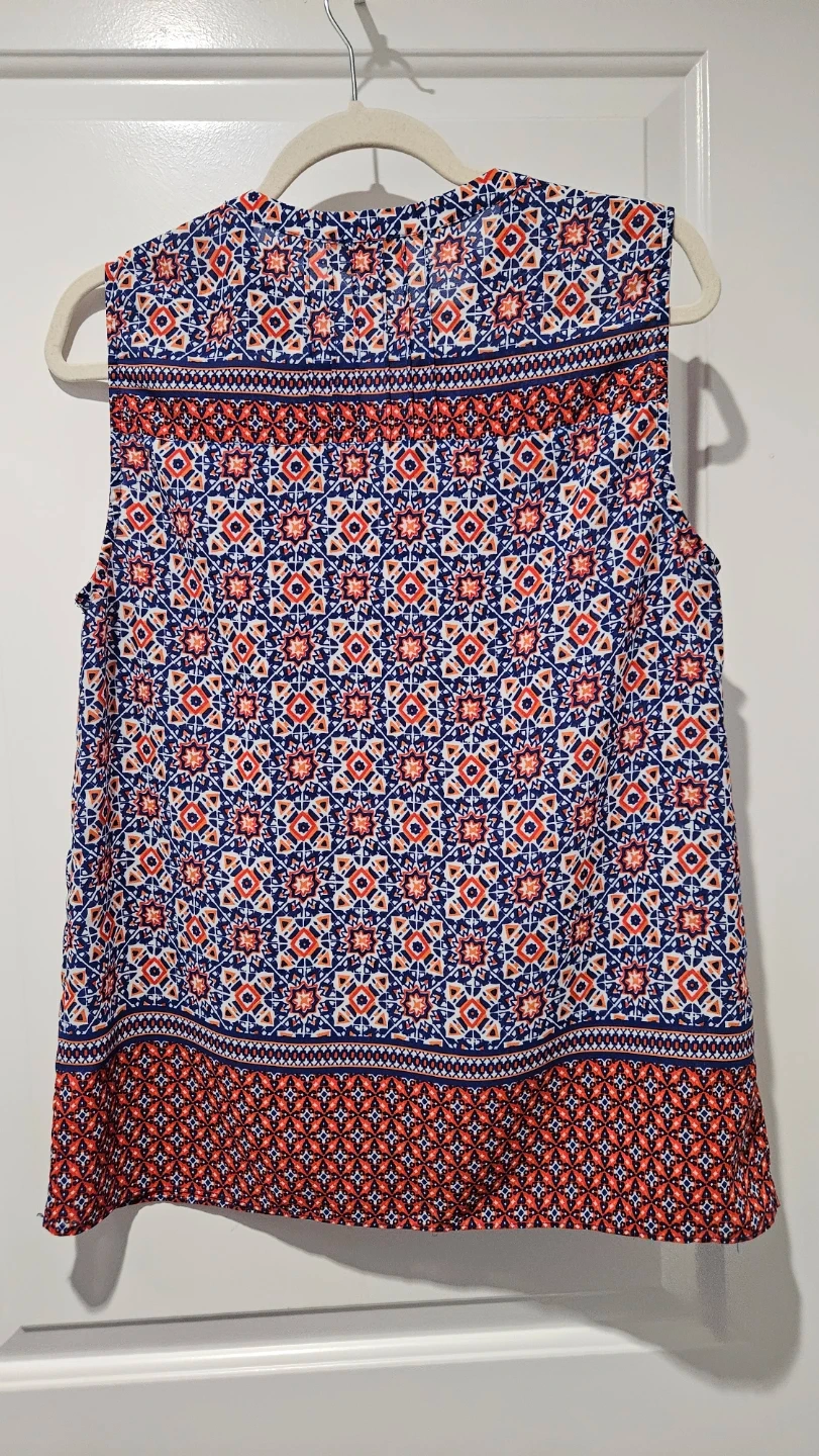 Virtually brand new Lucy & Laurel sleeveless blouse. It features a colourful blue, red, and white geometric print. The material is lightweight and perfect for summer, spring days, and professional wardrobe - office, business casual, evening or everyday wear.