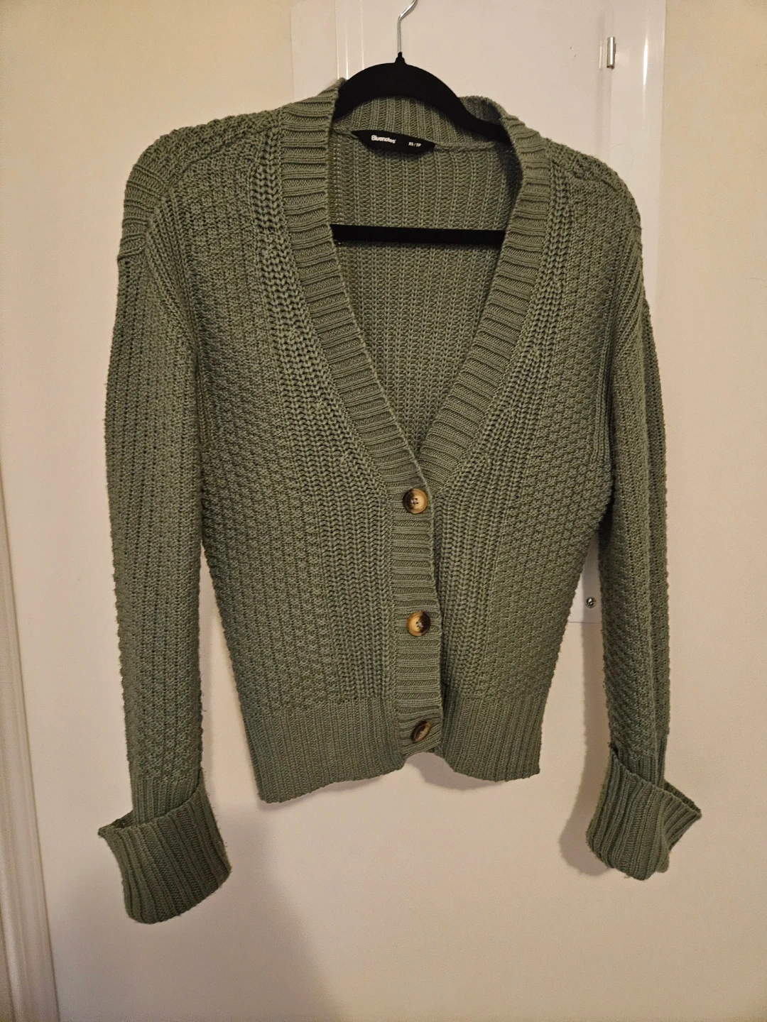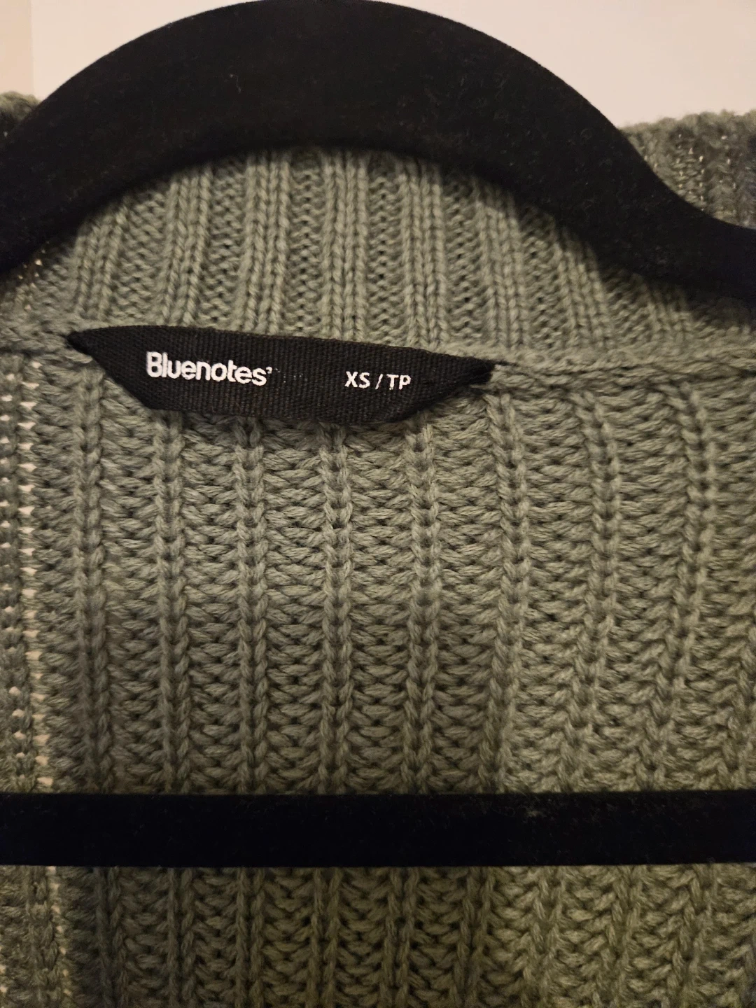 This is a green button-up cardigan from Bluenotes. It's a size XS/TP. Features a knit texture and button closure.