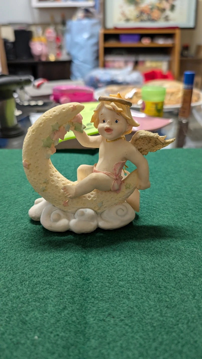 This cute figurine depicts a cherub resting on a crescent moon. It's made of a durable resin material. This piece would make a lovely addition to any shelf or display!