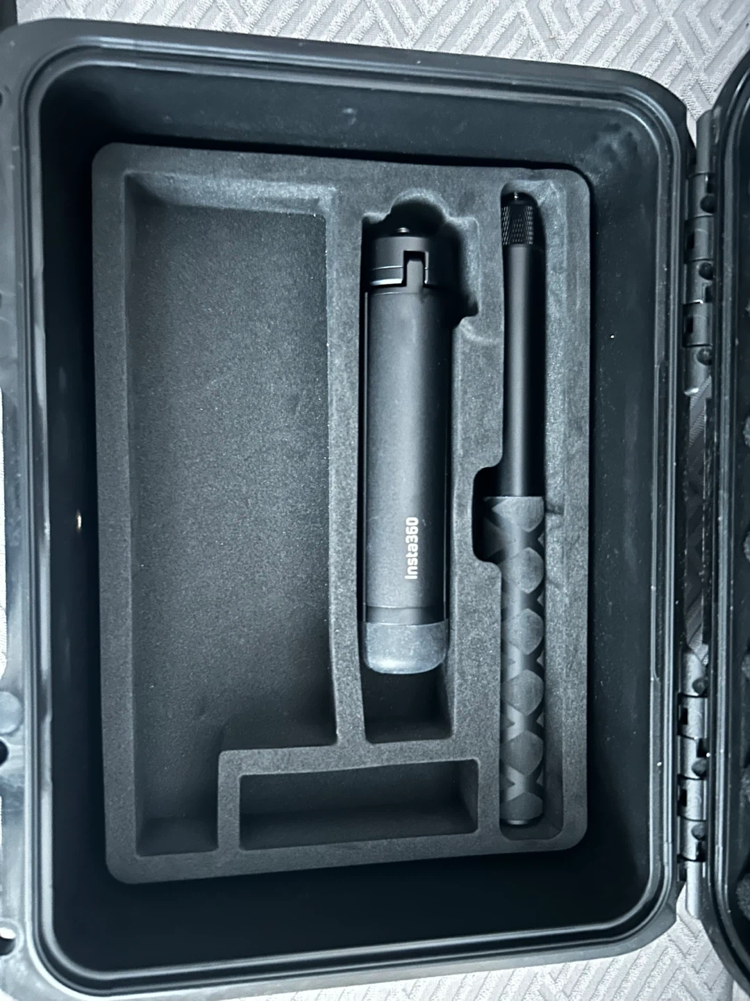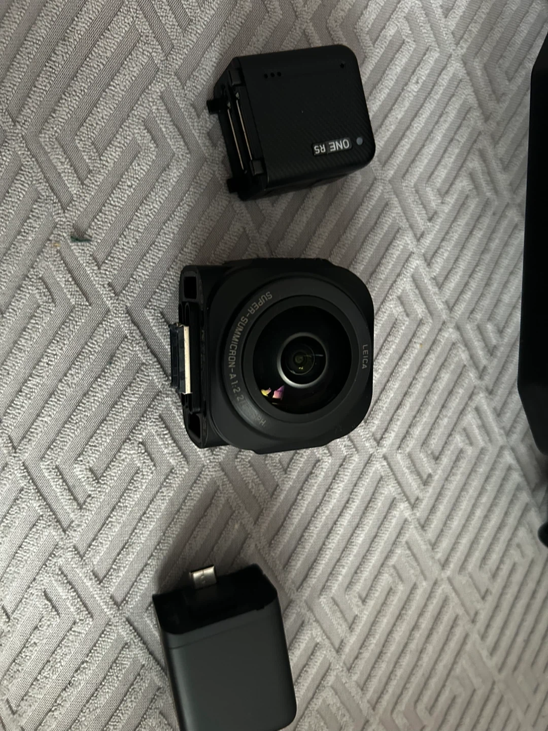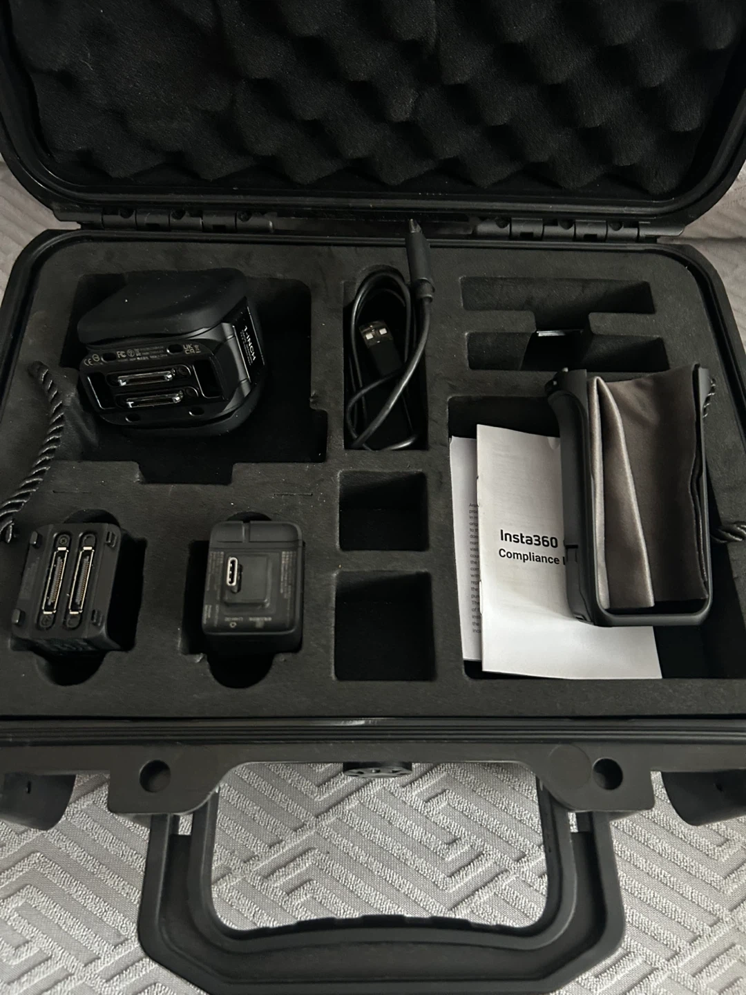 This is the Insta360 ONE RS camera. It includes the main camera body, two additional modules, a charging cable, and a carrying case. It's ready for your next adventure!