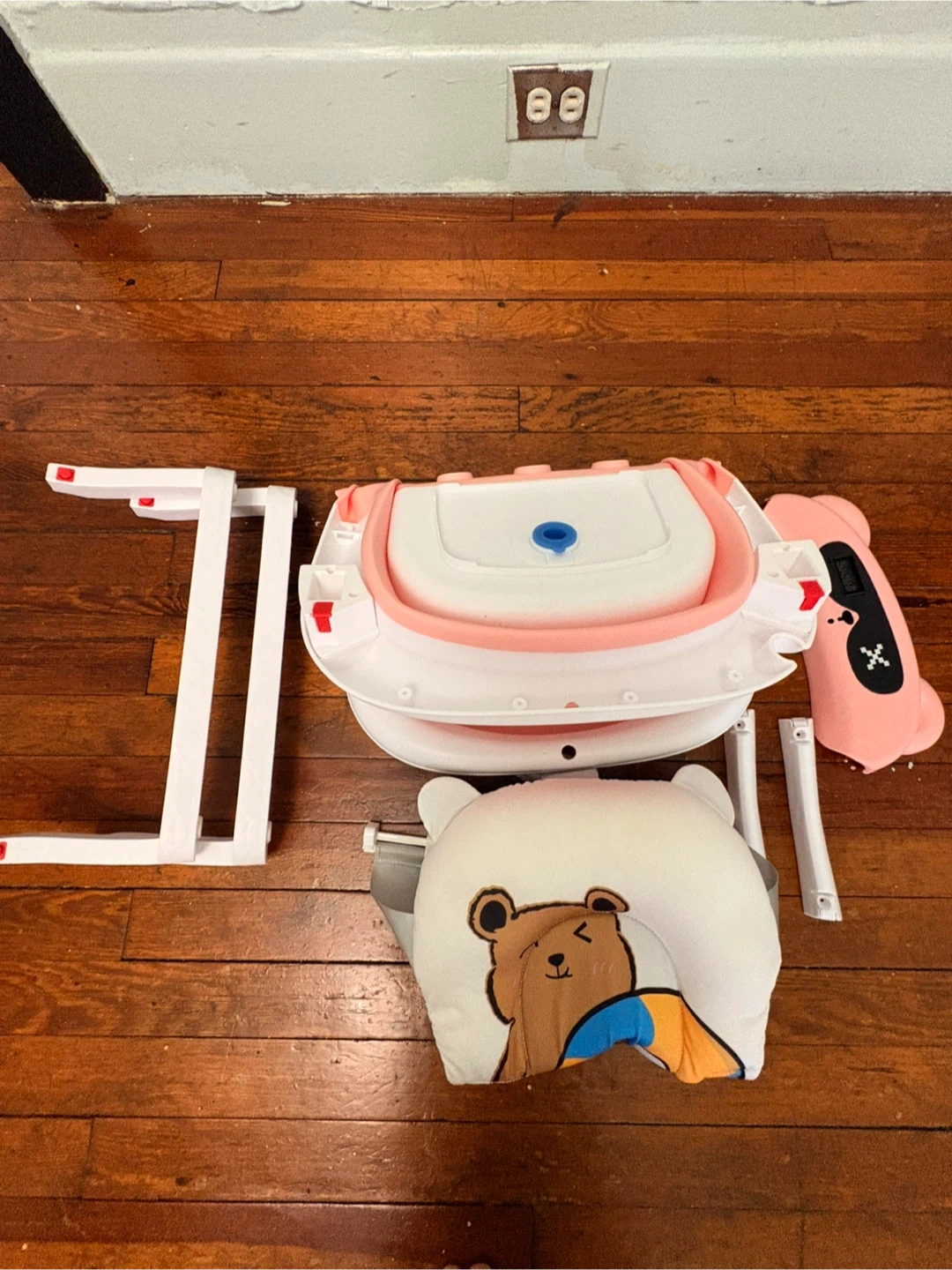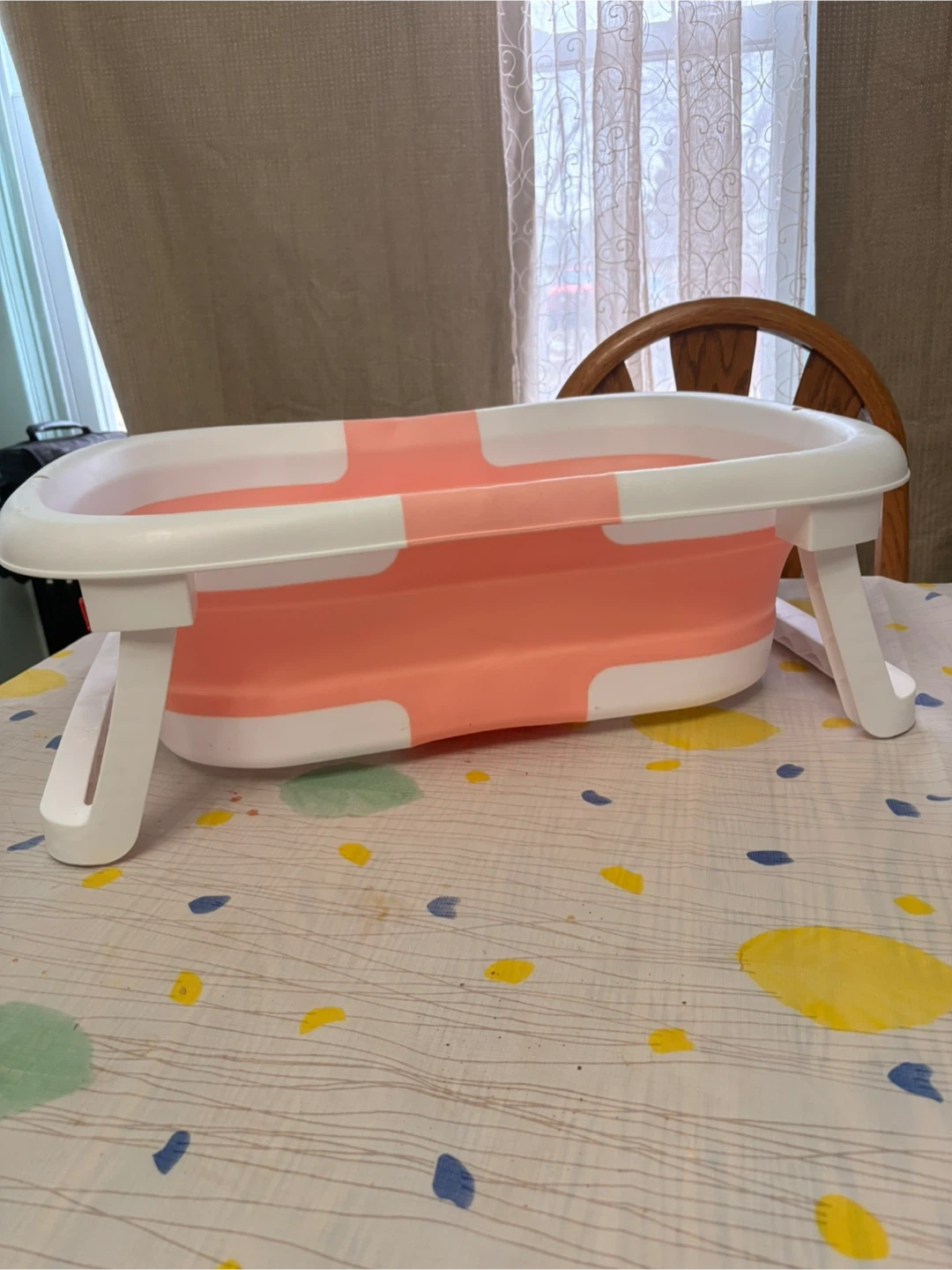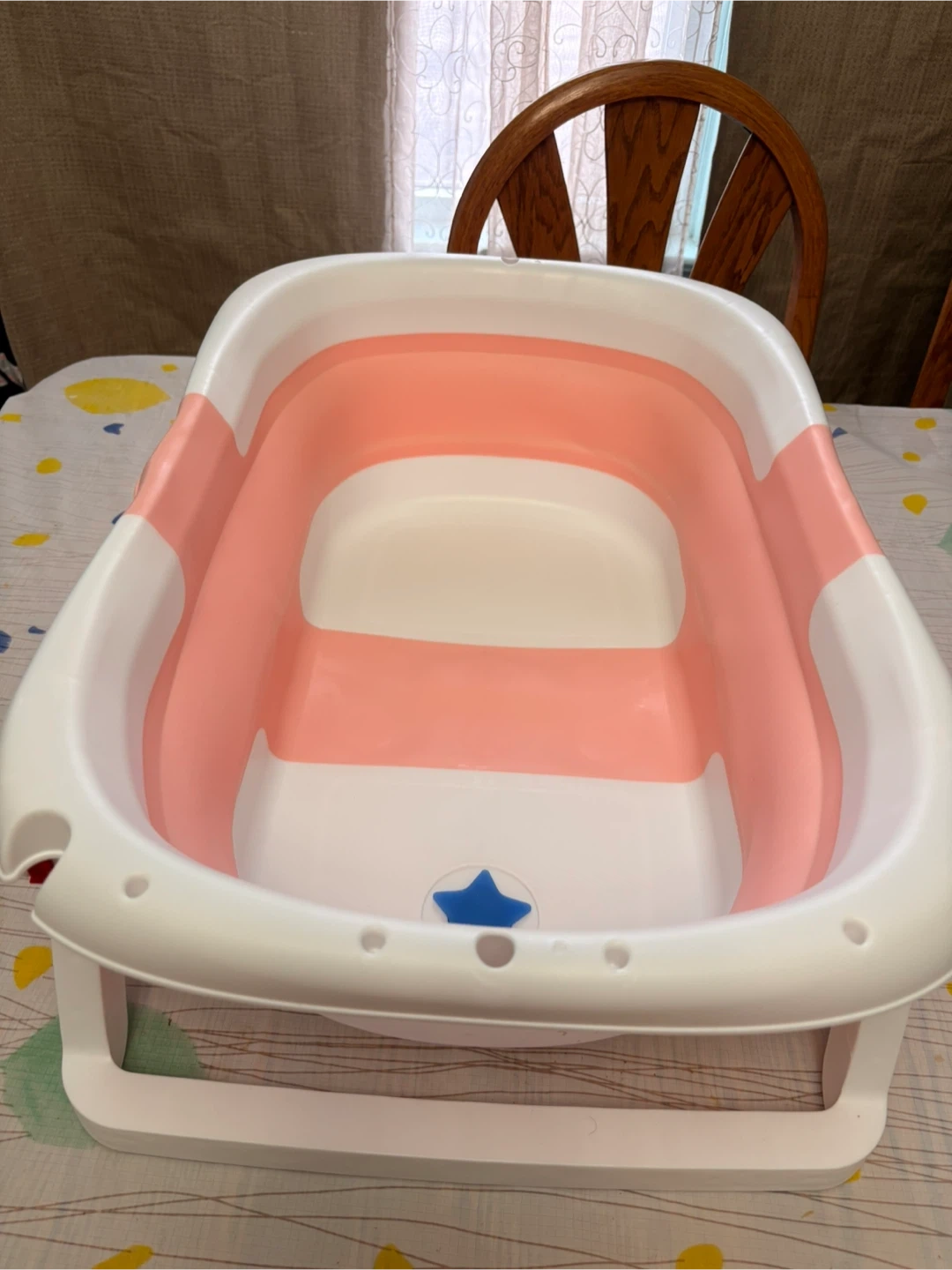 This pink and white collapsible baby bathtub includes a cute bear-themed cushion for comfort. It's made from safe PP material with a no-slip feet design for added stability. The tub also features a showerhead holder.