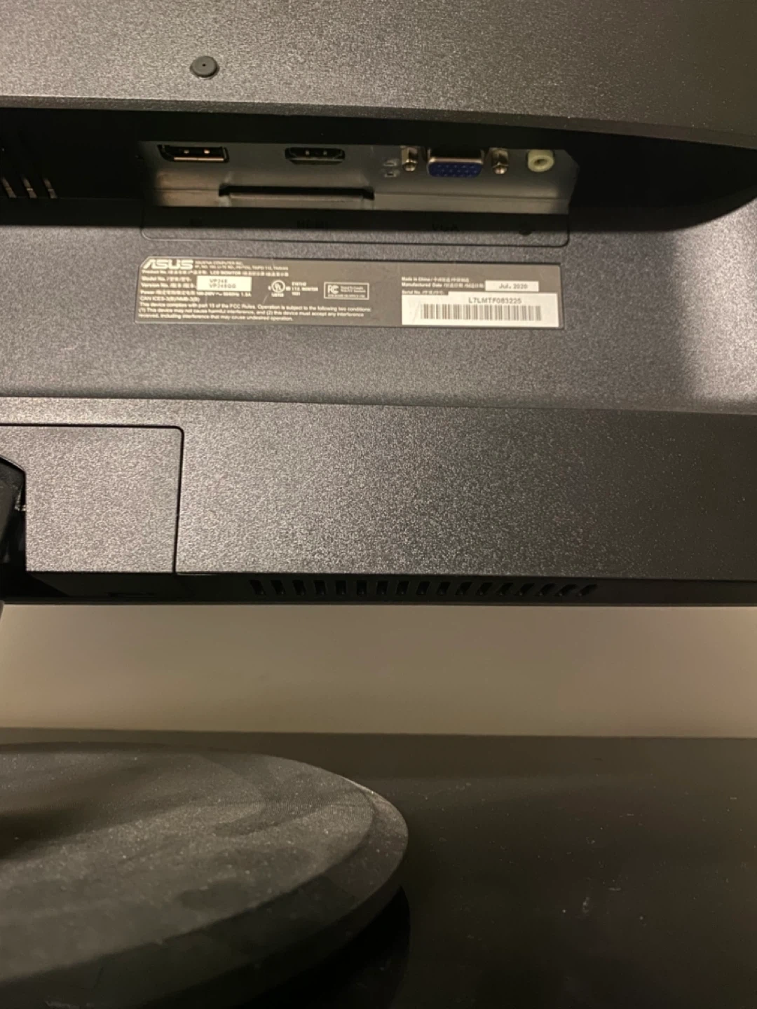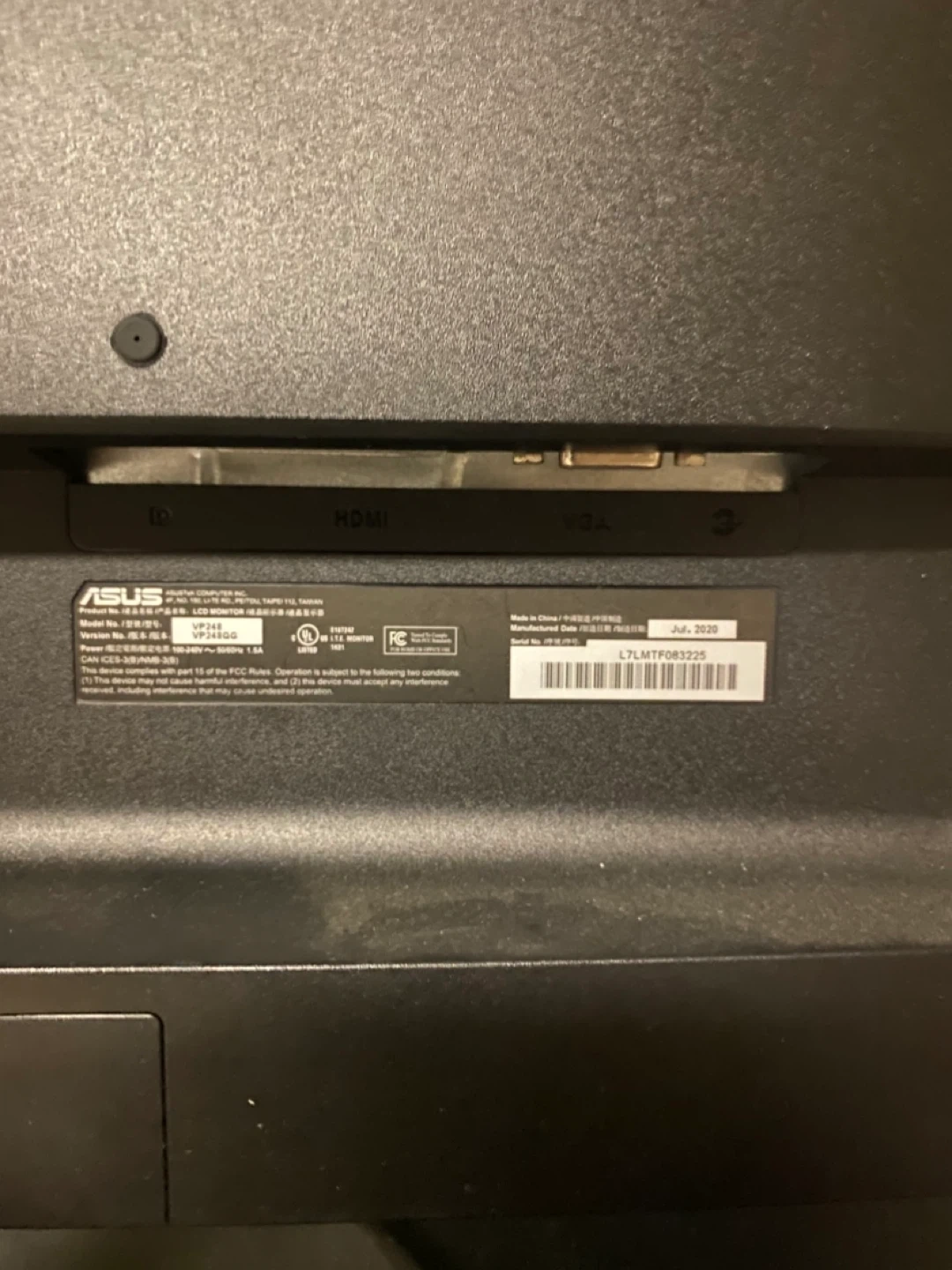 This is an ASUS VP249 23.8-inch monitor. It has a 75Hz refresh rate and 1ms response time. Made in China in July 2020.
