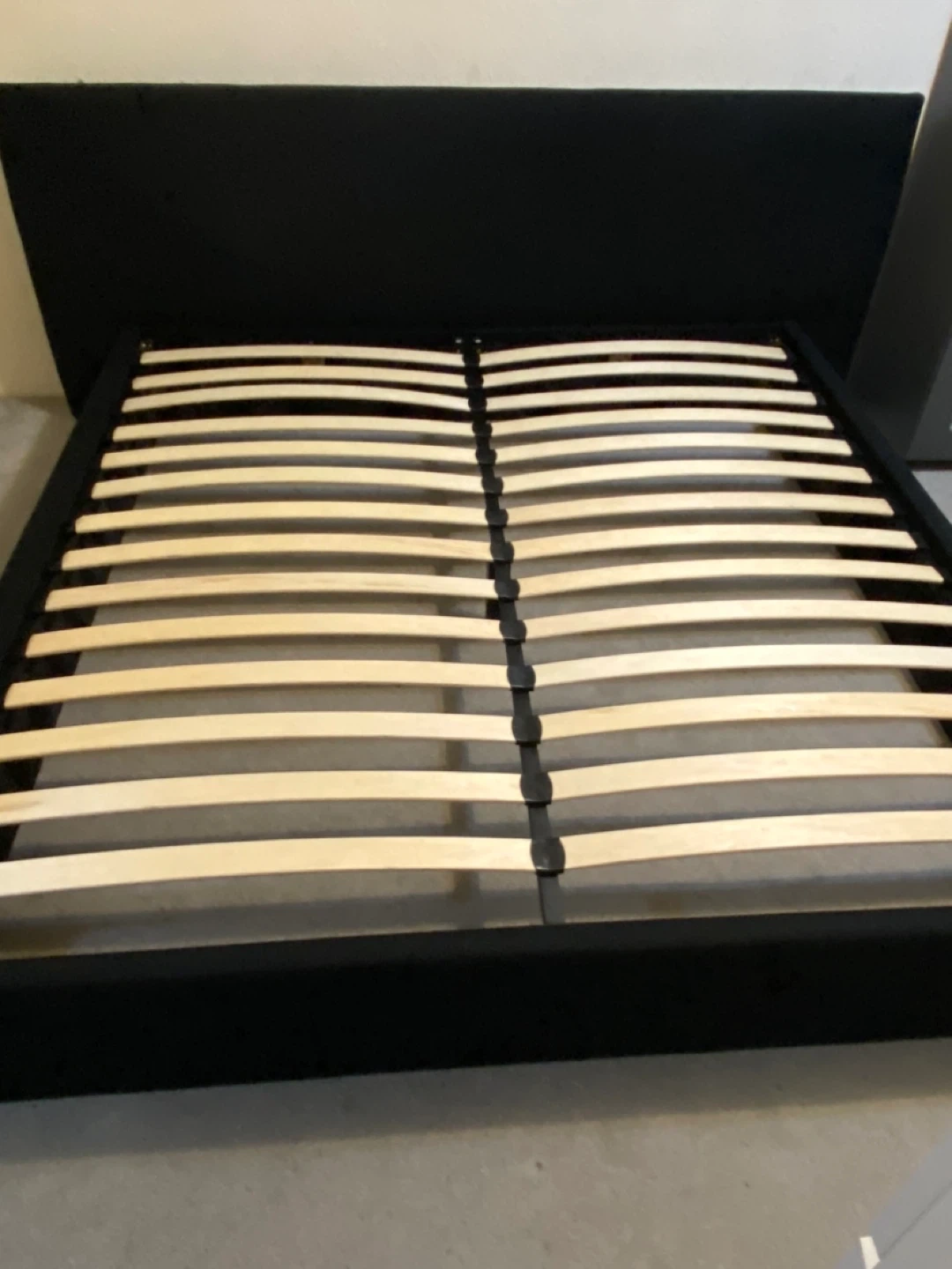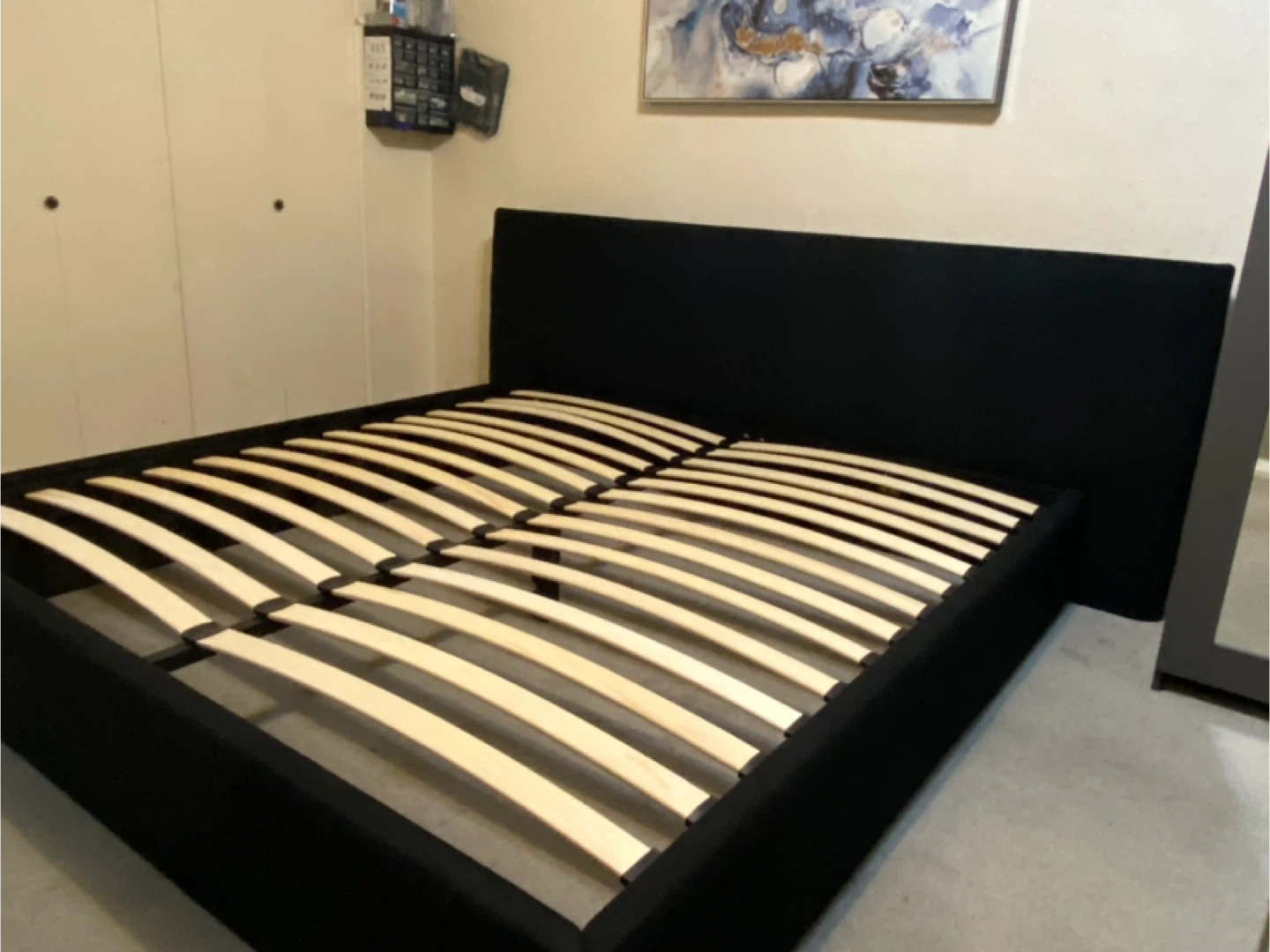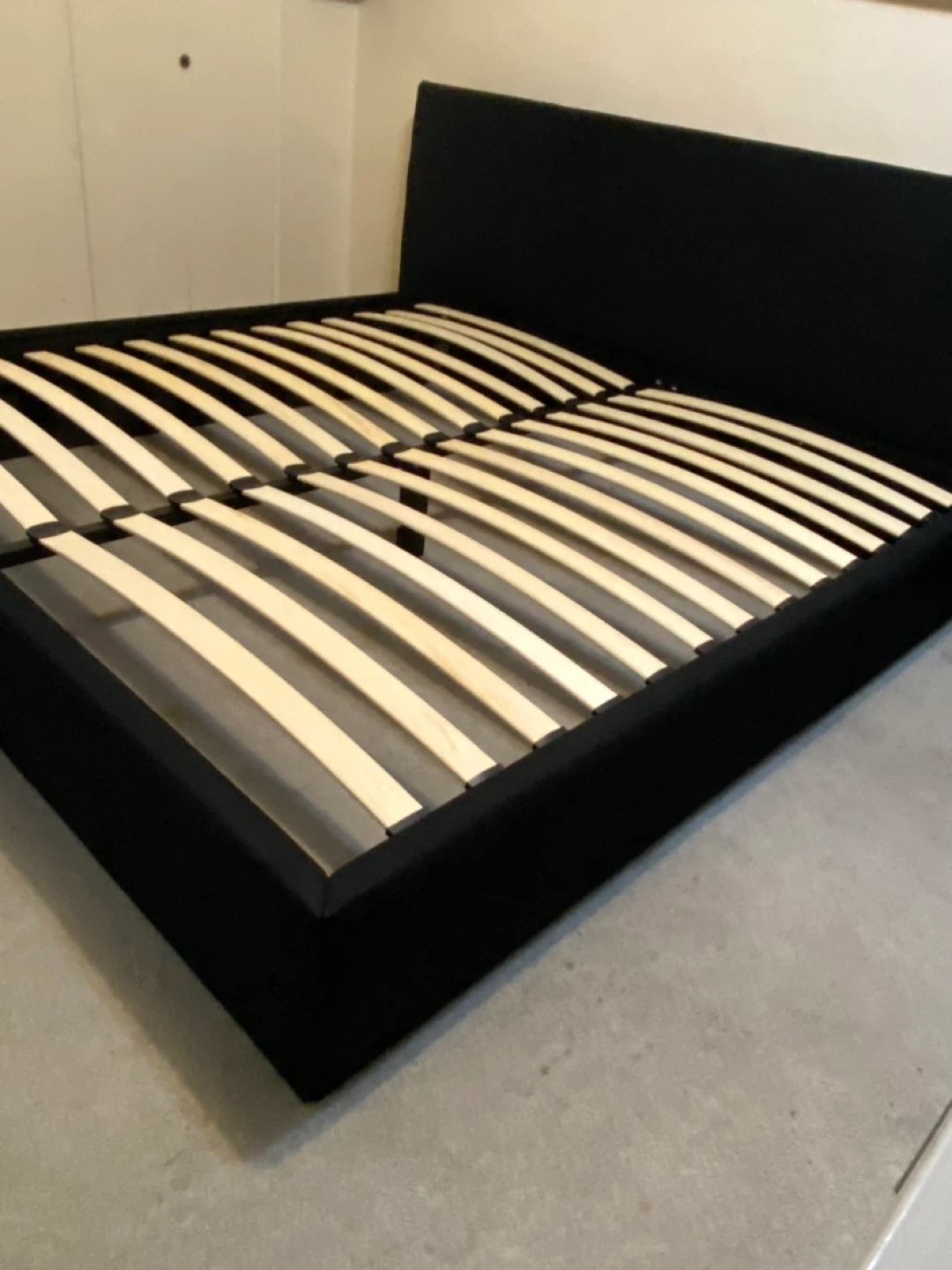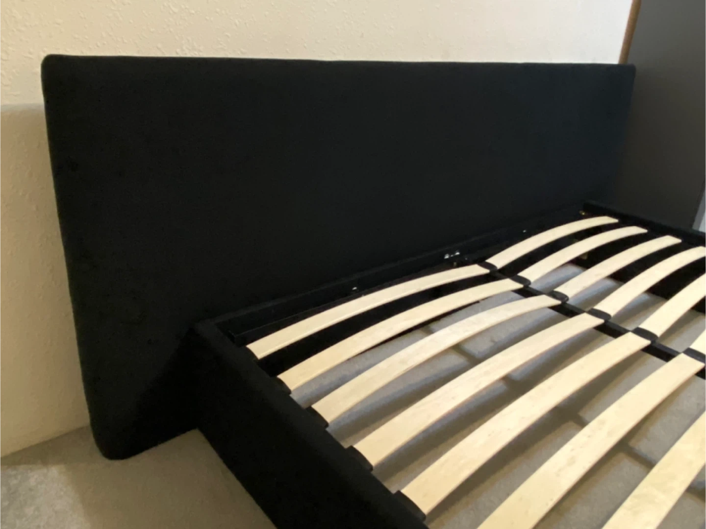 This bed frame features a modern upholstered design in black. It has a supportive wooden slat system for your mattress. Free Assembly with in 10 km of surrey centre station.