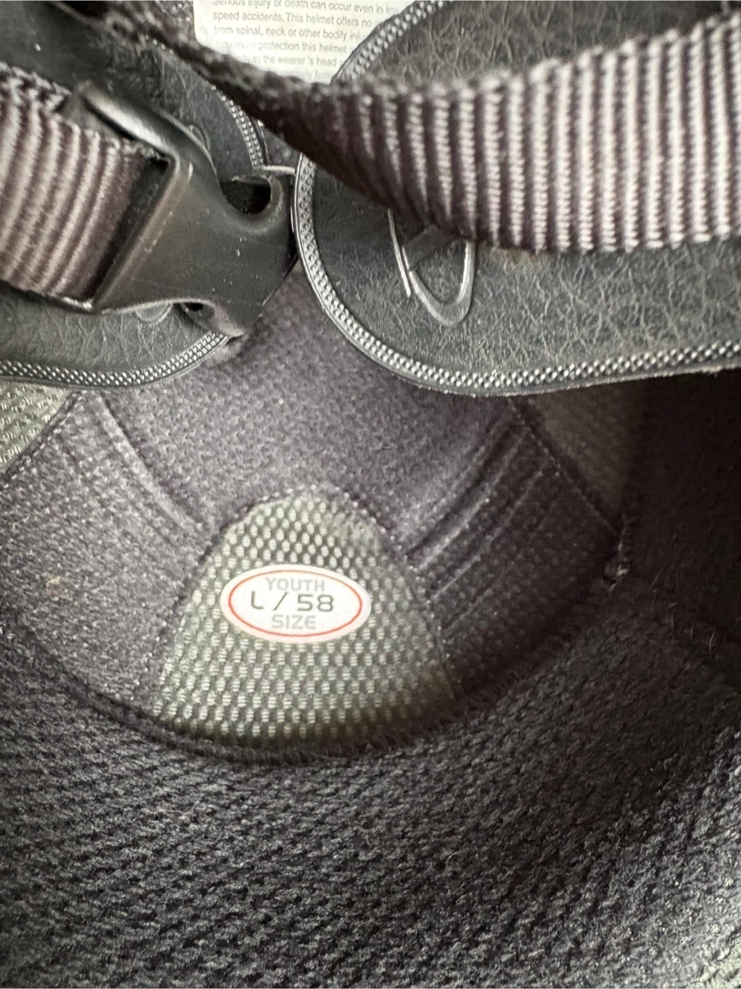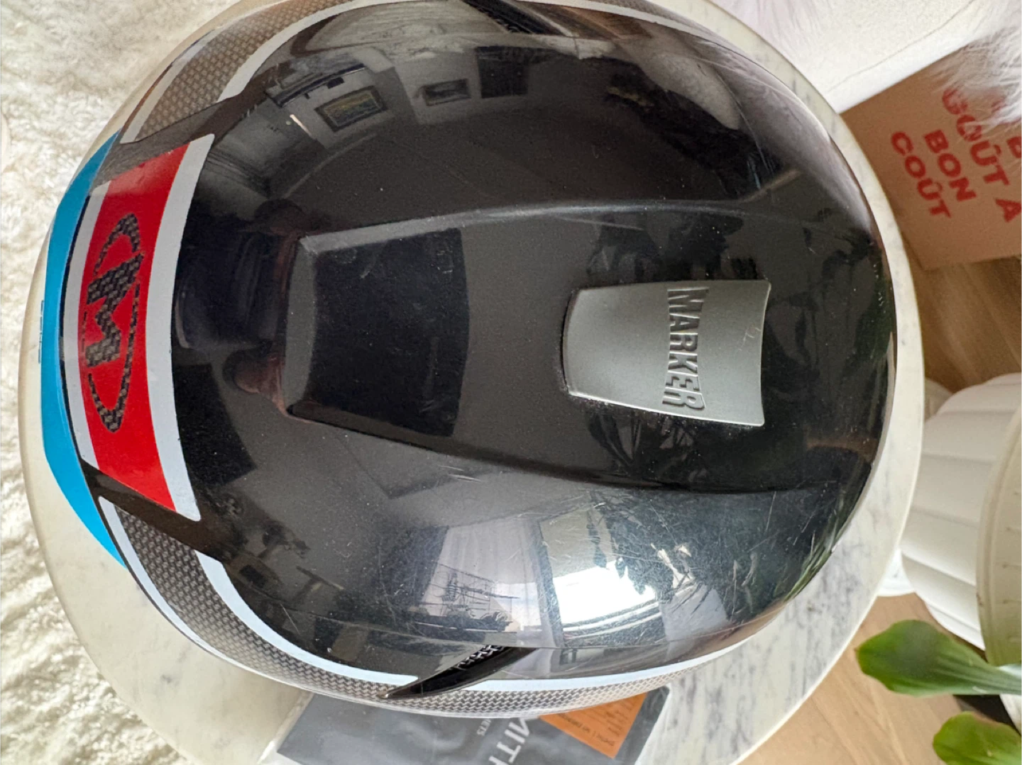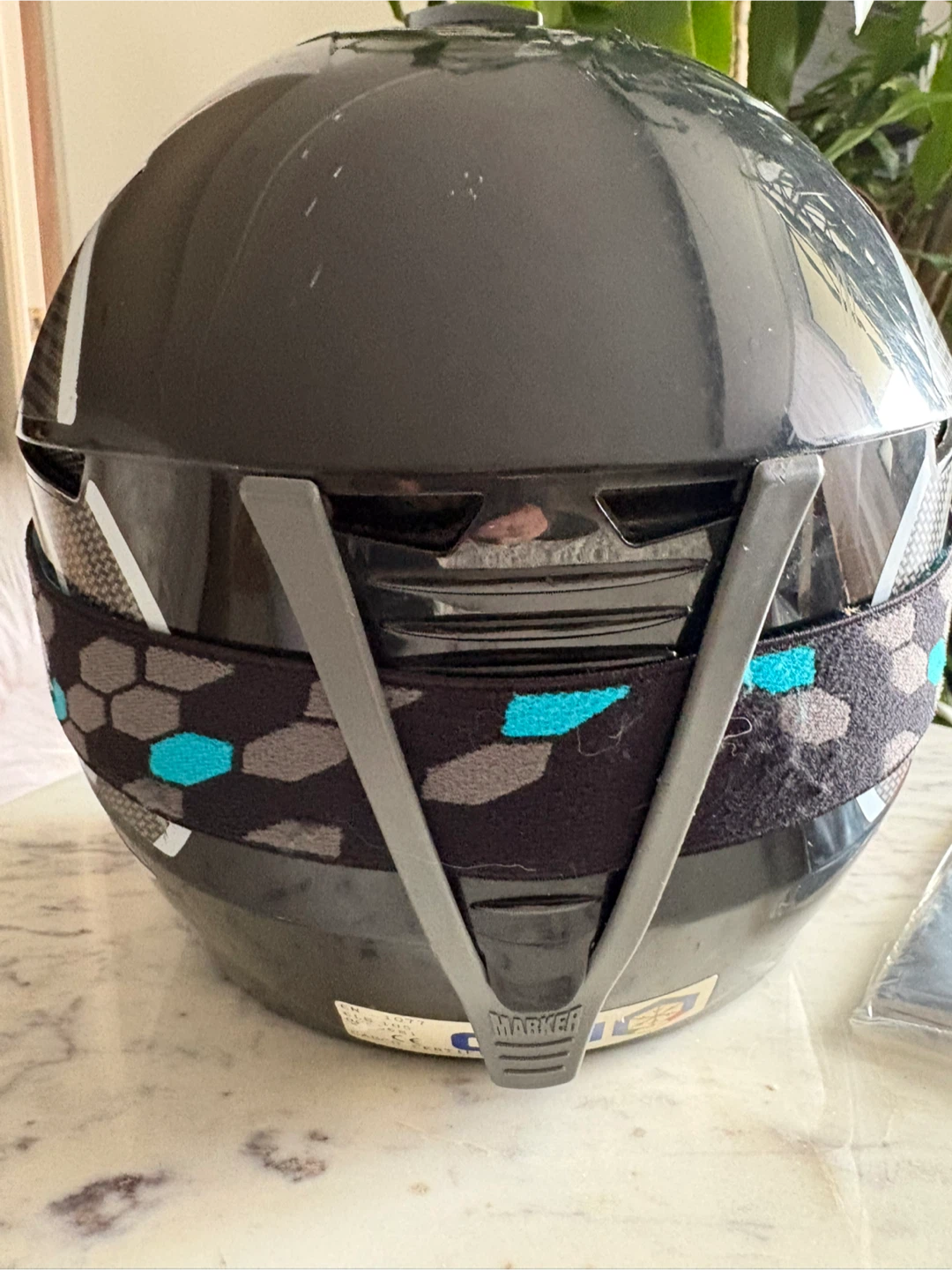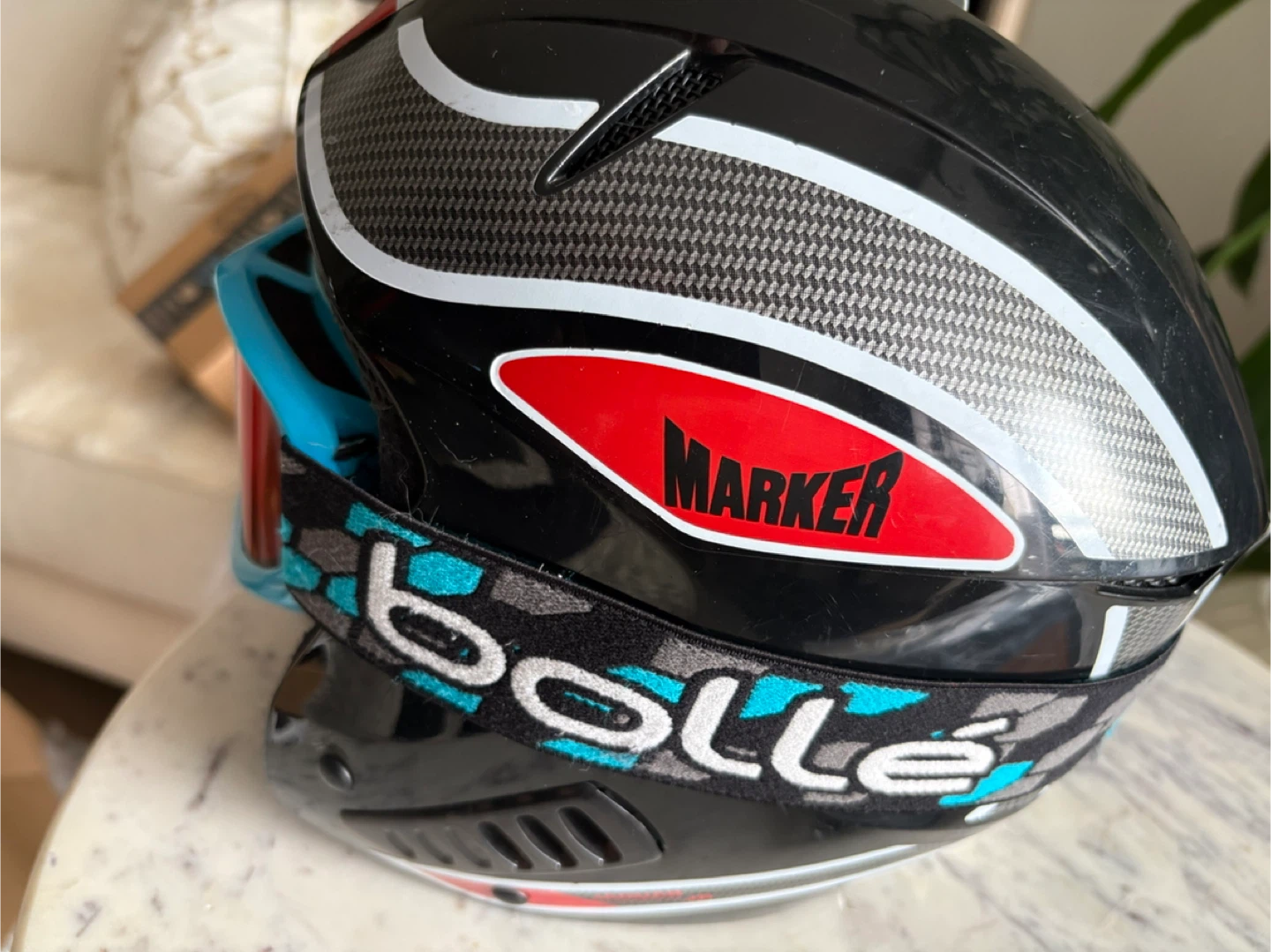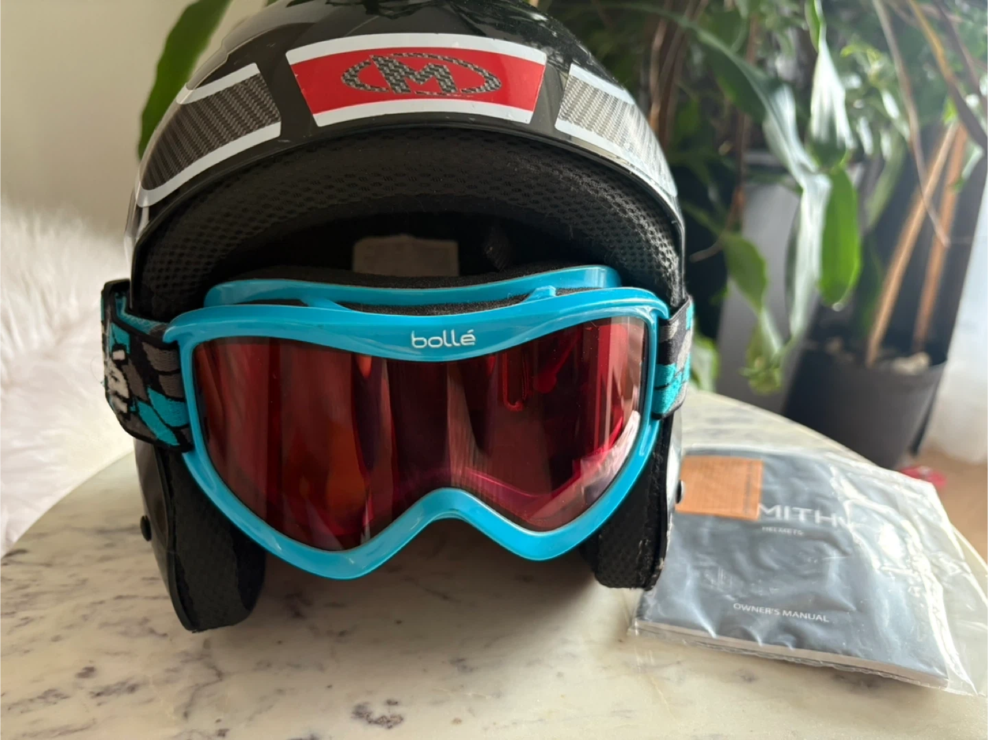 Selling a Marker ski helmet paired with Bolle ski goggles! The helmet is black with a carbon fibre design - youth size L/58, CSI certified, and the goggles have a cool blue and grey patterned strap. Also included is a Smith owner's manual.