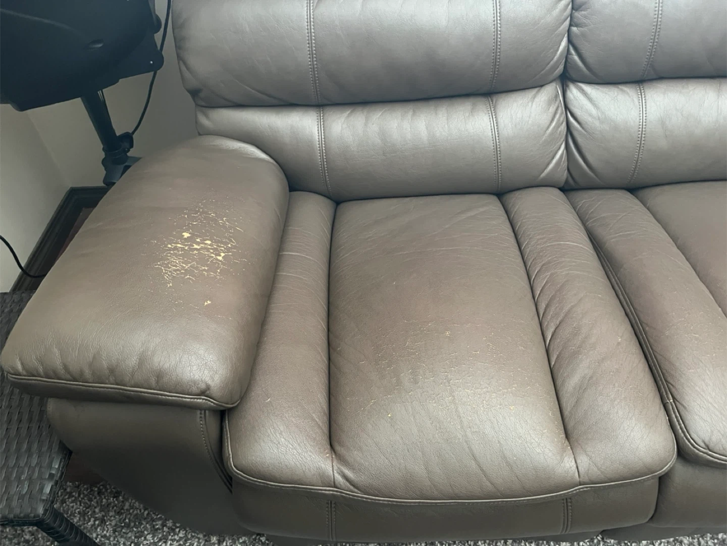 A brown /green leather sofa recliner with visible wear, particularly on the left armrest. It's a three-seater with plush cushions. This sofa would be useful for a starter home or a casual living space.