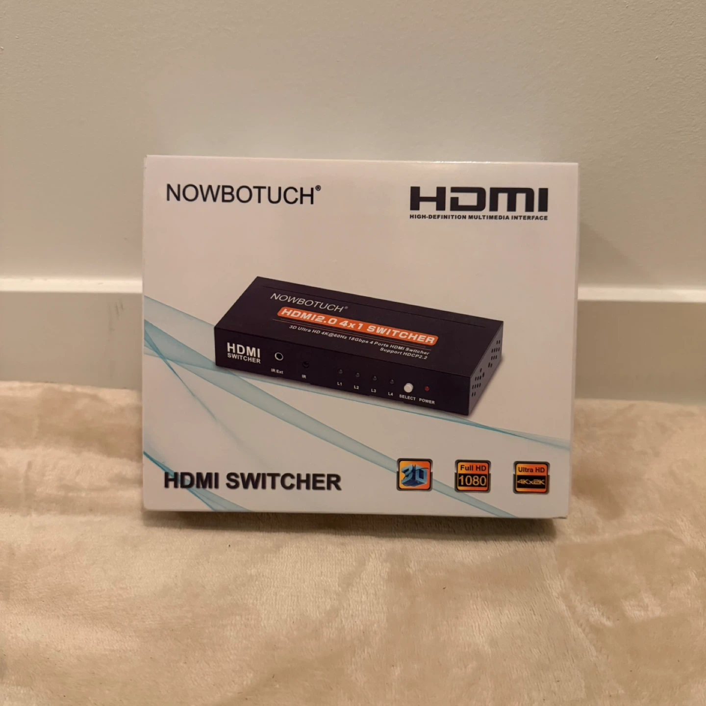 NOWBOTUCH HDMI 2.0 4x1 switcher. Supports 4K Ultra HD at 60Hz and 18Gbps. Includes original box and user manual. It comes with four HDMI inputs and one output.