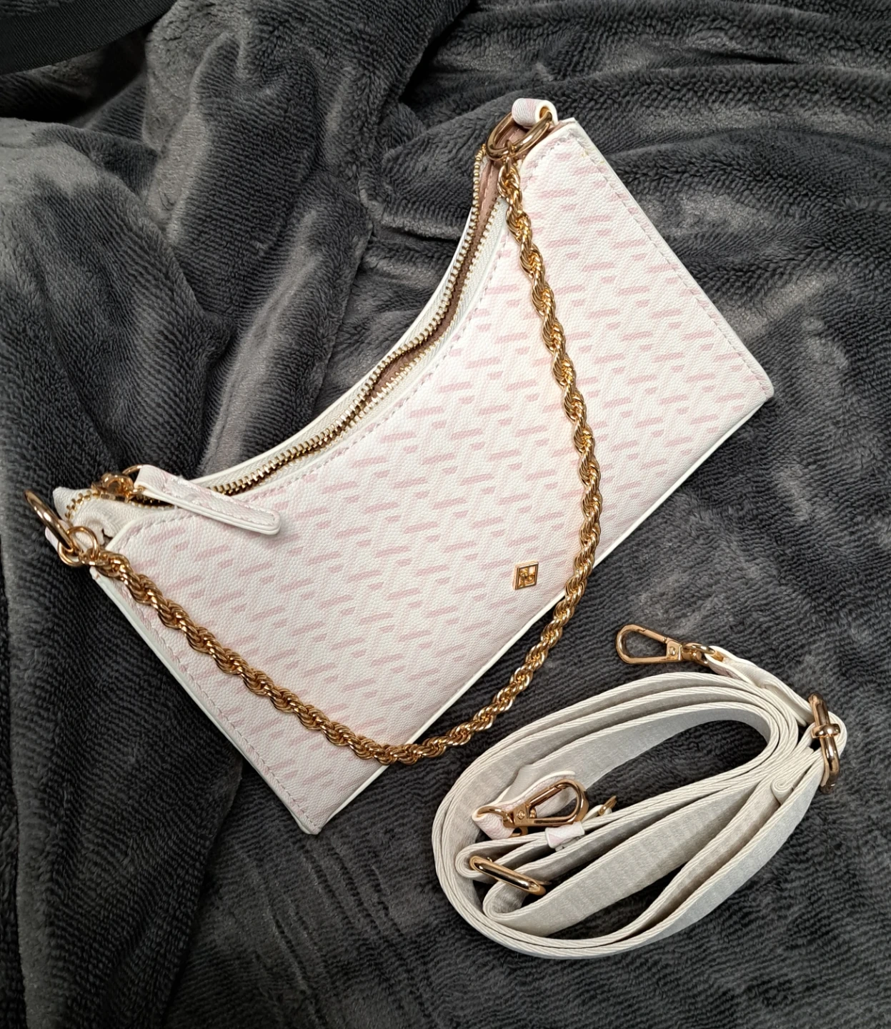 White shoulder bag with a repeating pink pattern. It has a gold chain strap and an optional white crossbody strap. Zip closure.