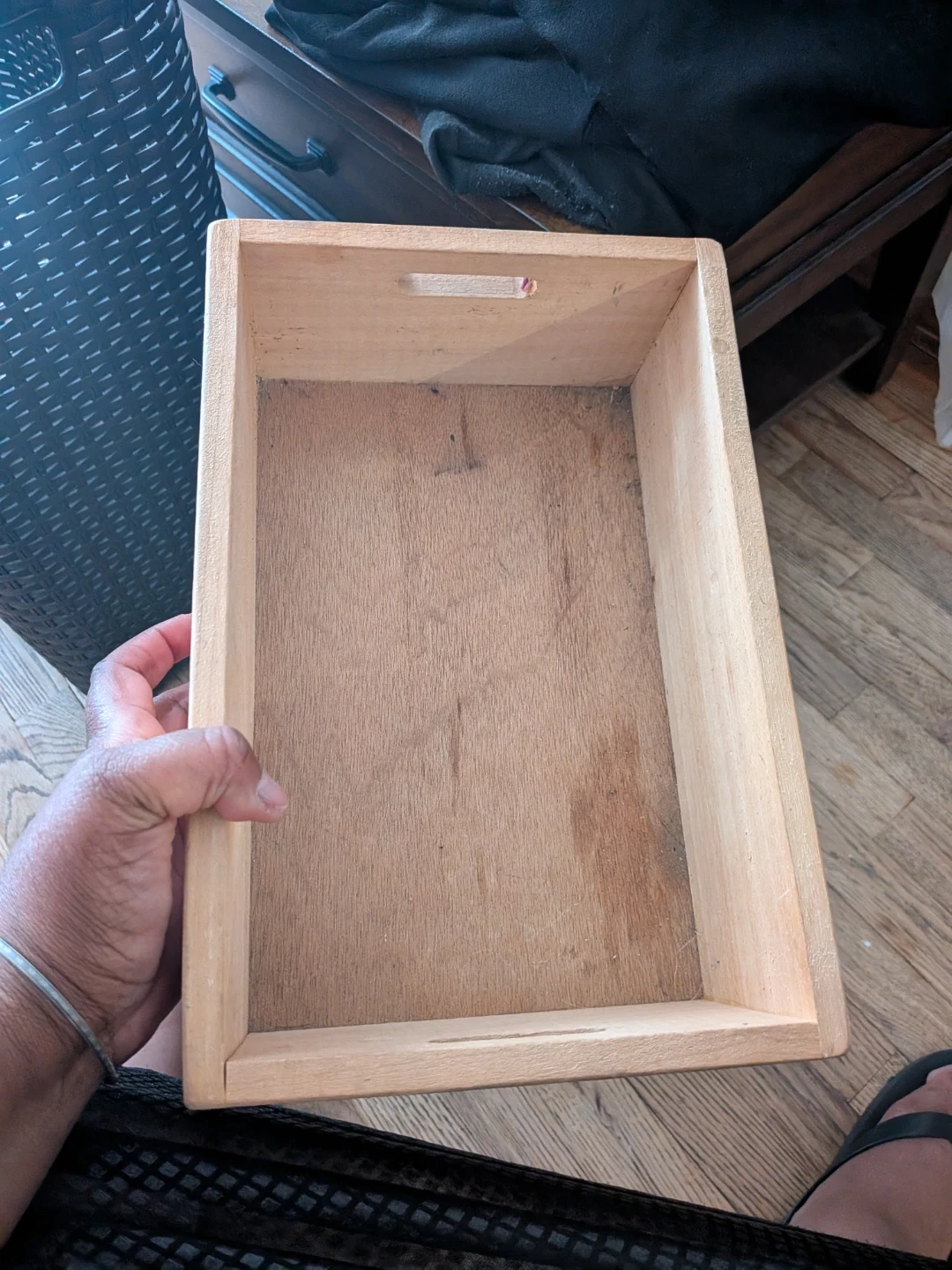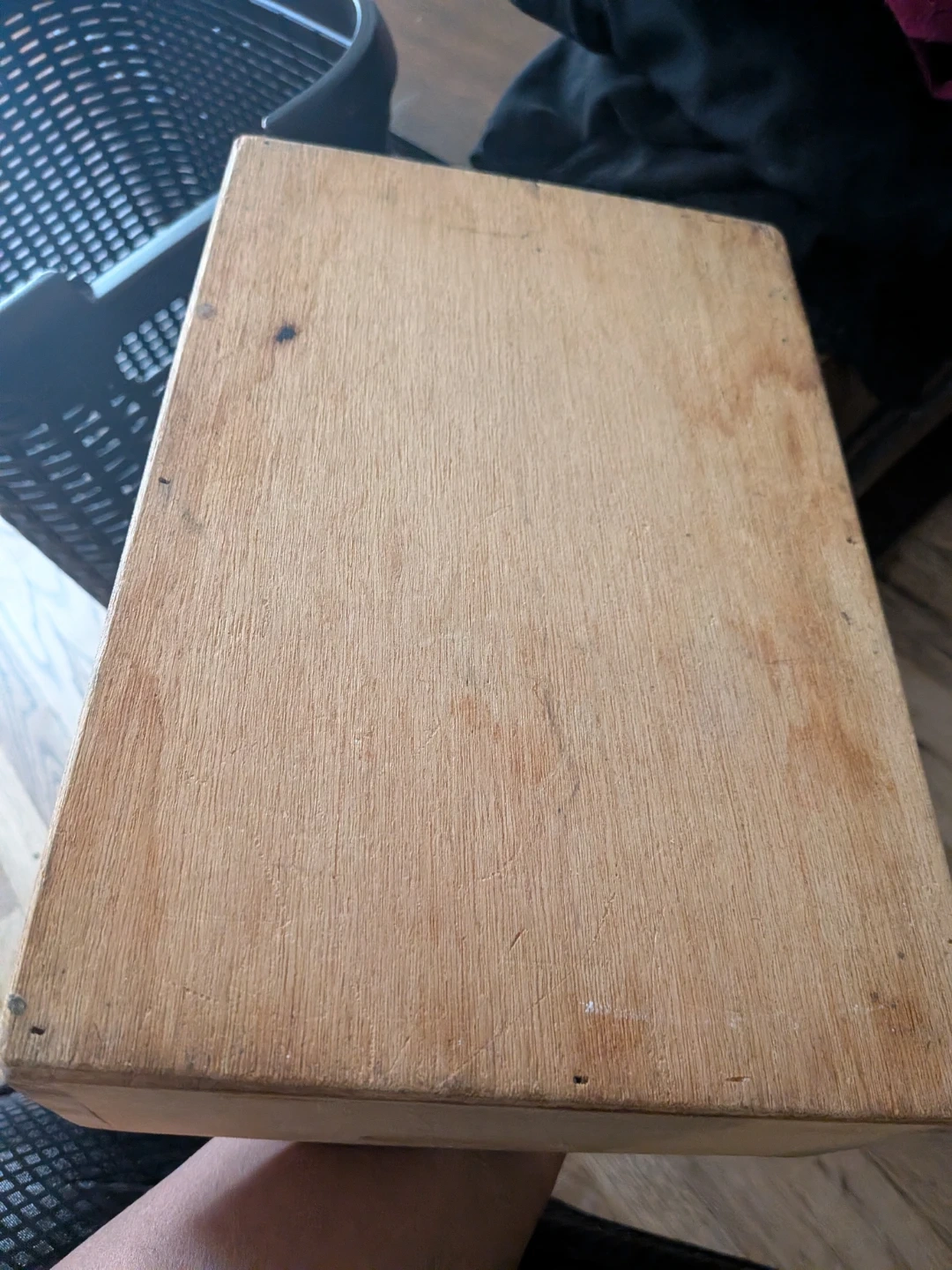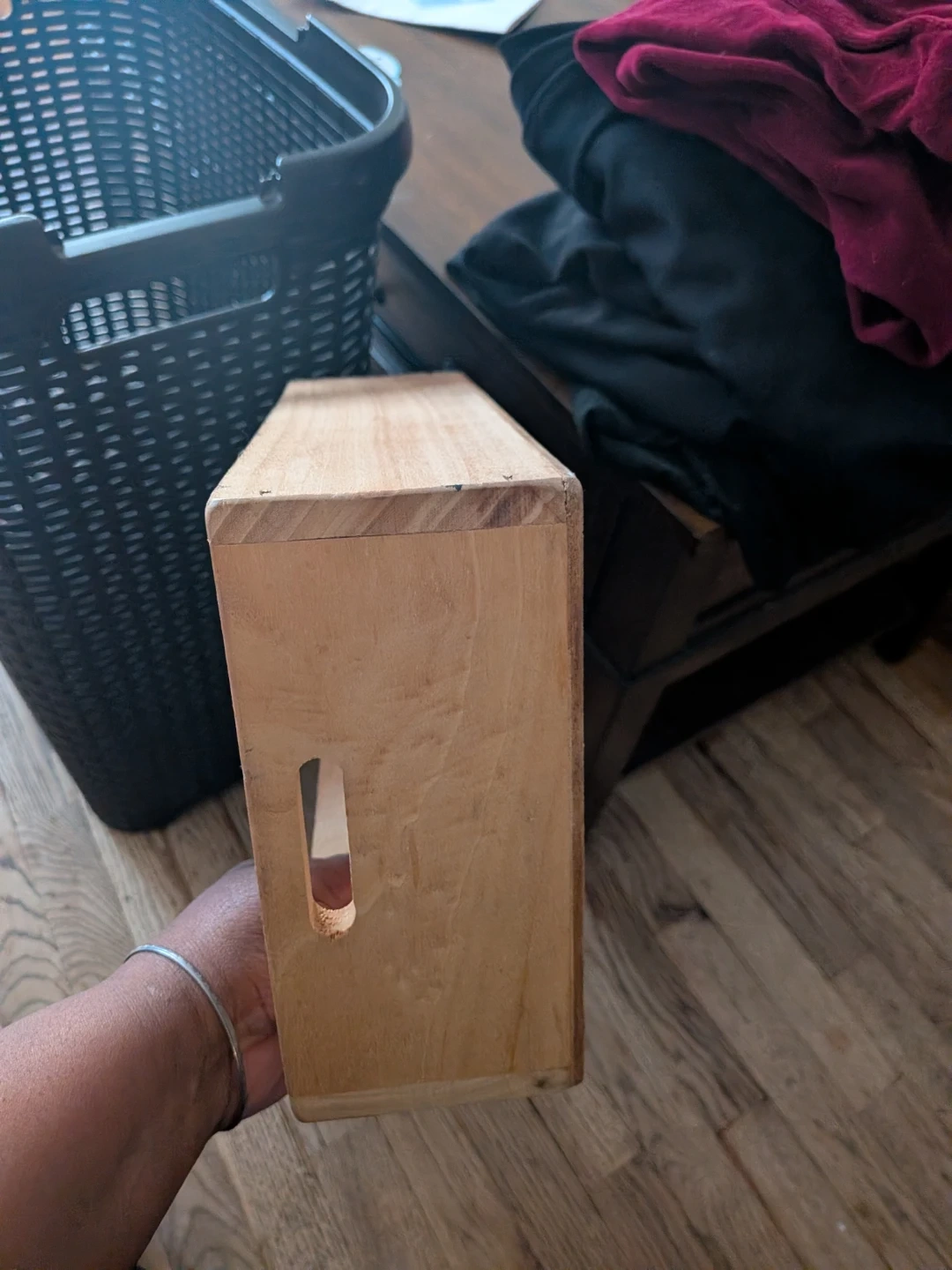 This is a wooden storage box. It's made of light-colored wood. The box has handles cut into the sides for easy carrying. Wood construction.